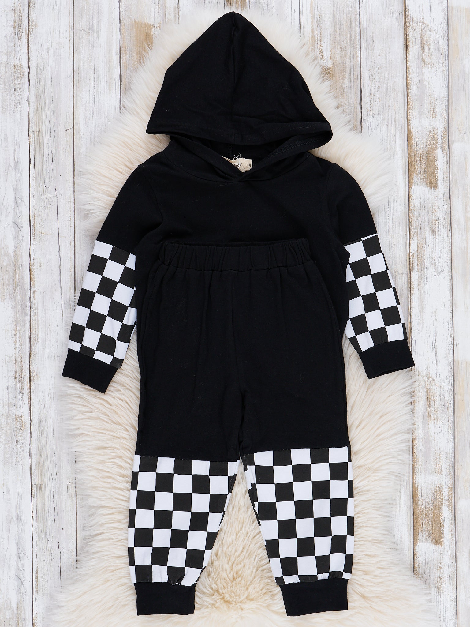 Outfit your little man in style with this cool joggers outfit! This trendy set features a fashionable checker print design, perfect for any fashion-forward boy. Made with soft, comfortable fabric, this outfit will keep him looking and feeling great all day long.