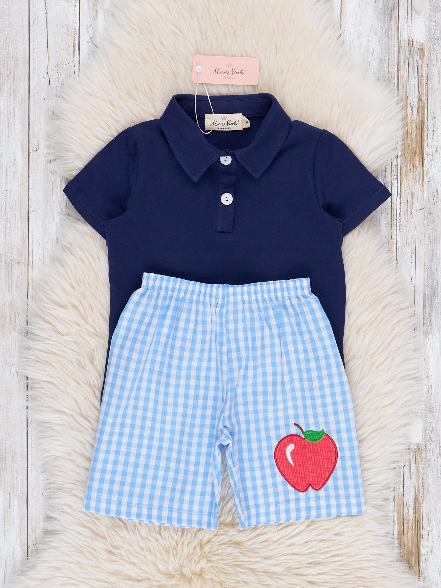 This outfit is 🍎 APPLE-solutely perfect for any little teacher's pet! With a blue polo adorned with a cute embroidered apple and matching blue gingham shorts, your little one will be the talk of the playground. Get it apple-ed up before it's gone!