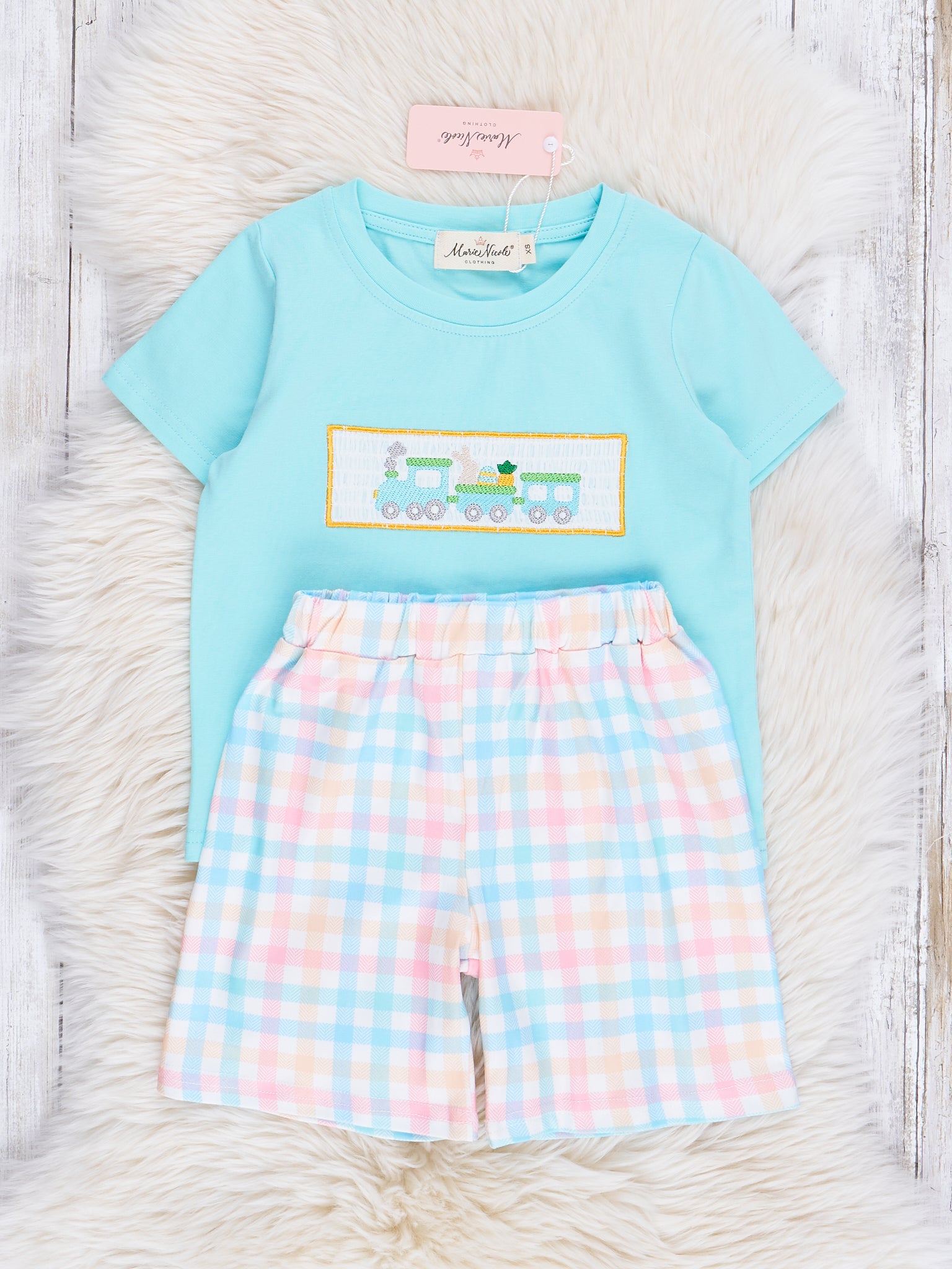 Add a touch of choo choo charm to your little ones' Easter wardrobe with our Blue Smocked Train Outfit. This outfit features a teal blue top with an embroidered train over smocking paired with playful plaid shorts! This sibling set is perfect for riding right into springtime!