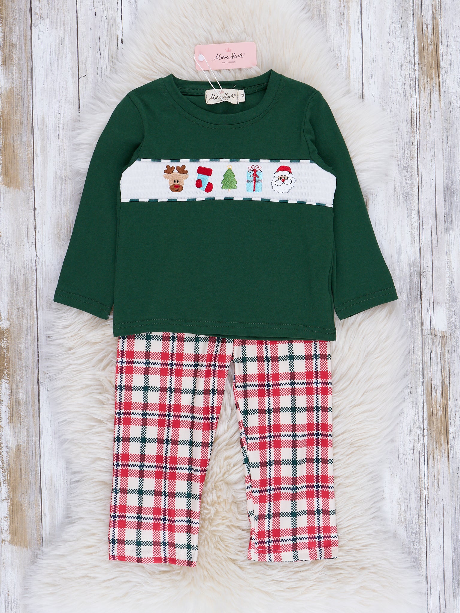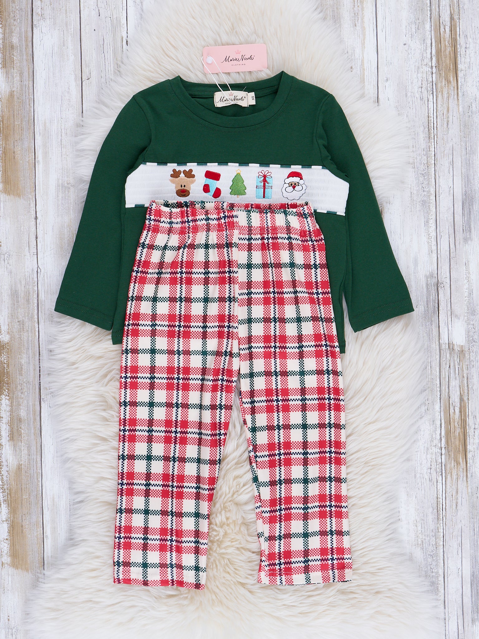 This Christmas outfit is a merry masterpiece, featuring a green top with delightful smocking and an intricately embroidered holiday scene paired with red plaid bottoms. It's a swirl of seasonal magic wrapped up in comfort – the ultimate festive ensemble for your little ones! 🎁🎄 Shop the sibling set here.