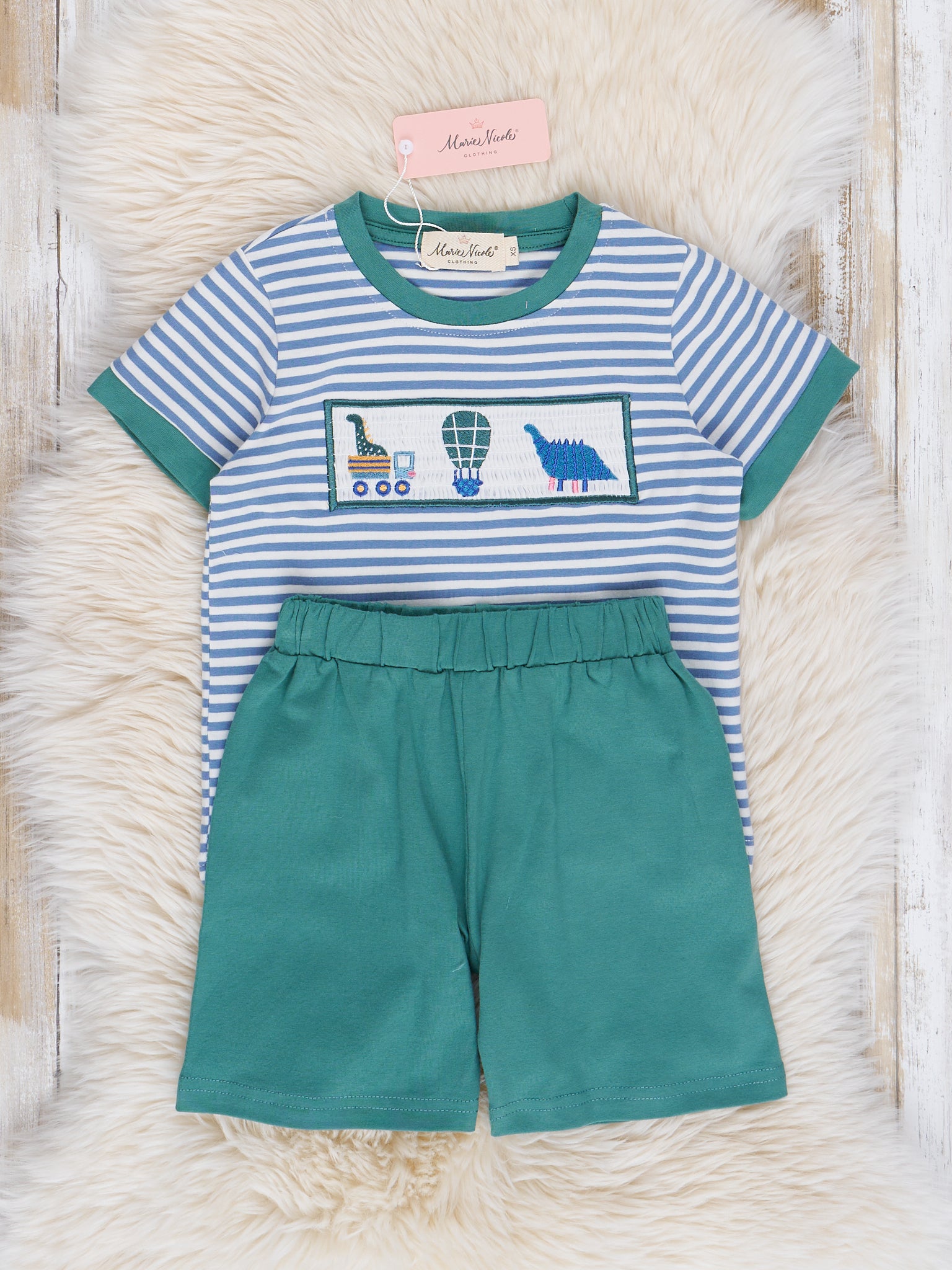 Hunter Green Stripes Smocked Dinosaur Friends Outfit