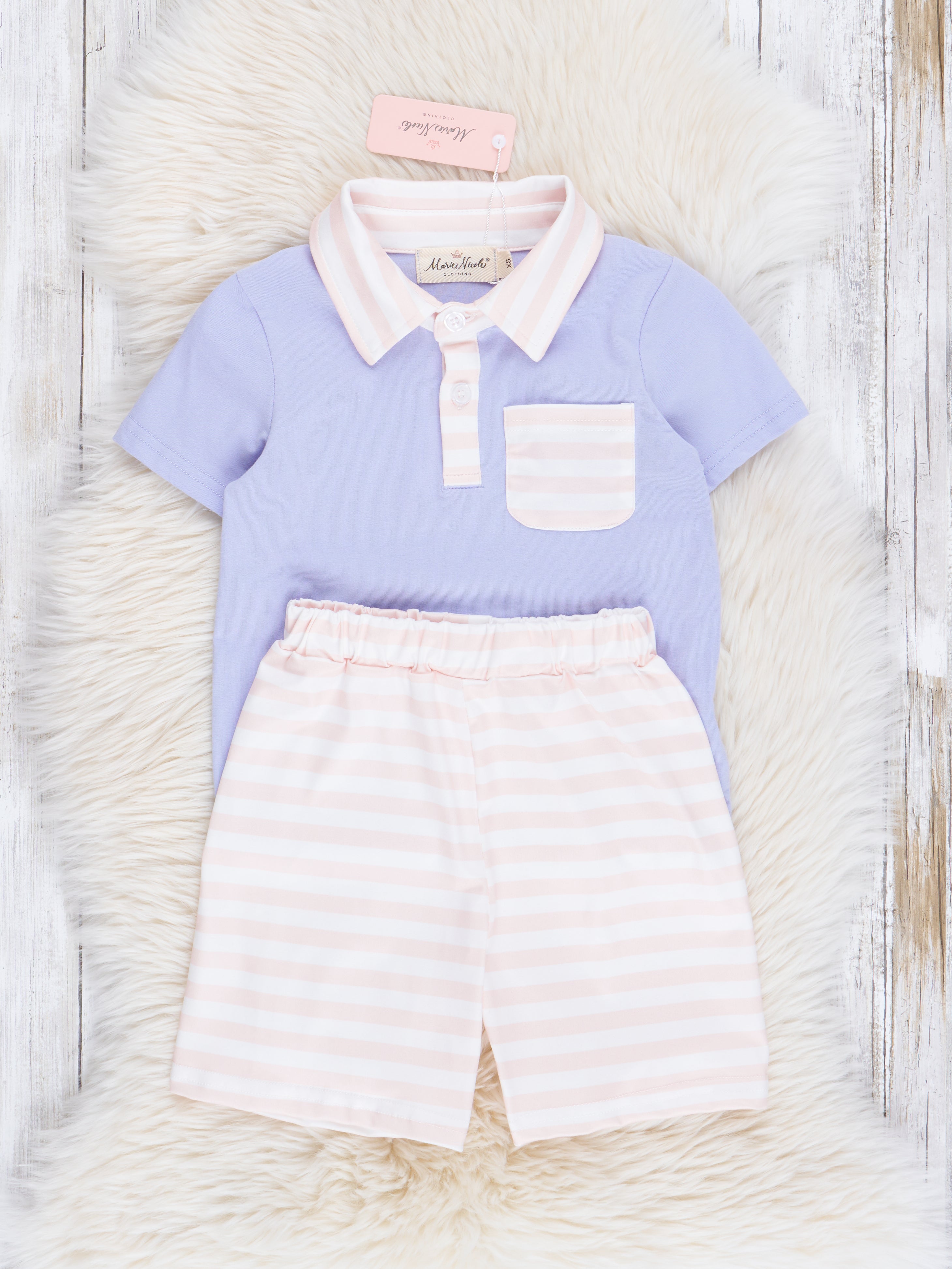 Brighten up your littles' wardrobe with this spring-ready Lilac & Soft Peach Stripes brother set. The outfit features a soft lilac polo accented with peach stripes, perfectly complementing the peach stripe shorts. Perfect for a day of fun and play!
