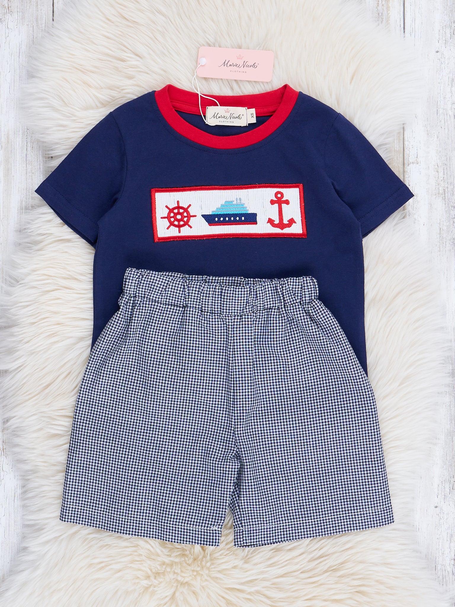 Sail away with style in our Nautical Navy Smocked Sibling Set! This adorable outfit features a navy top with smocked detailing and an embroidered sailing motif, perfect for adding a touch of nautical fun to any outfit. The navy gingham shorts seal the cuteness deal! Your little ones will look cute and fun in this outfit!