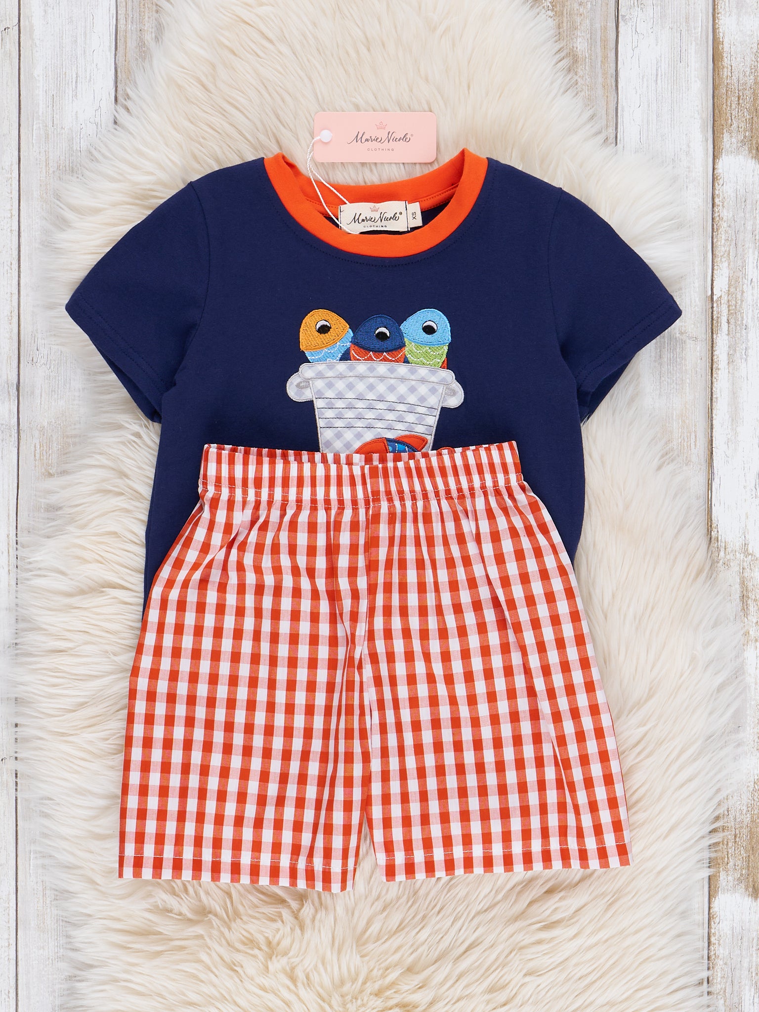 This fintastic sibling set by Marie Nicole Clothing is perfect for a fishing trip! This outfit features a navy top with the cutest fishing bucket appliqué, red trim, & orange gingham shorts with an elastic waistband.