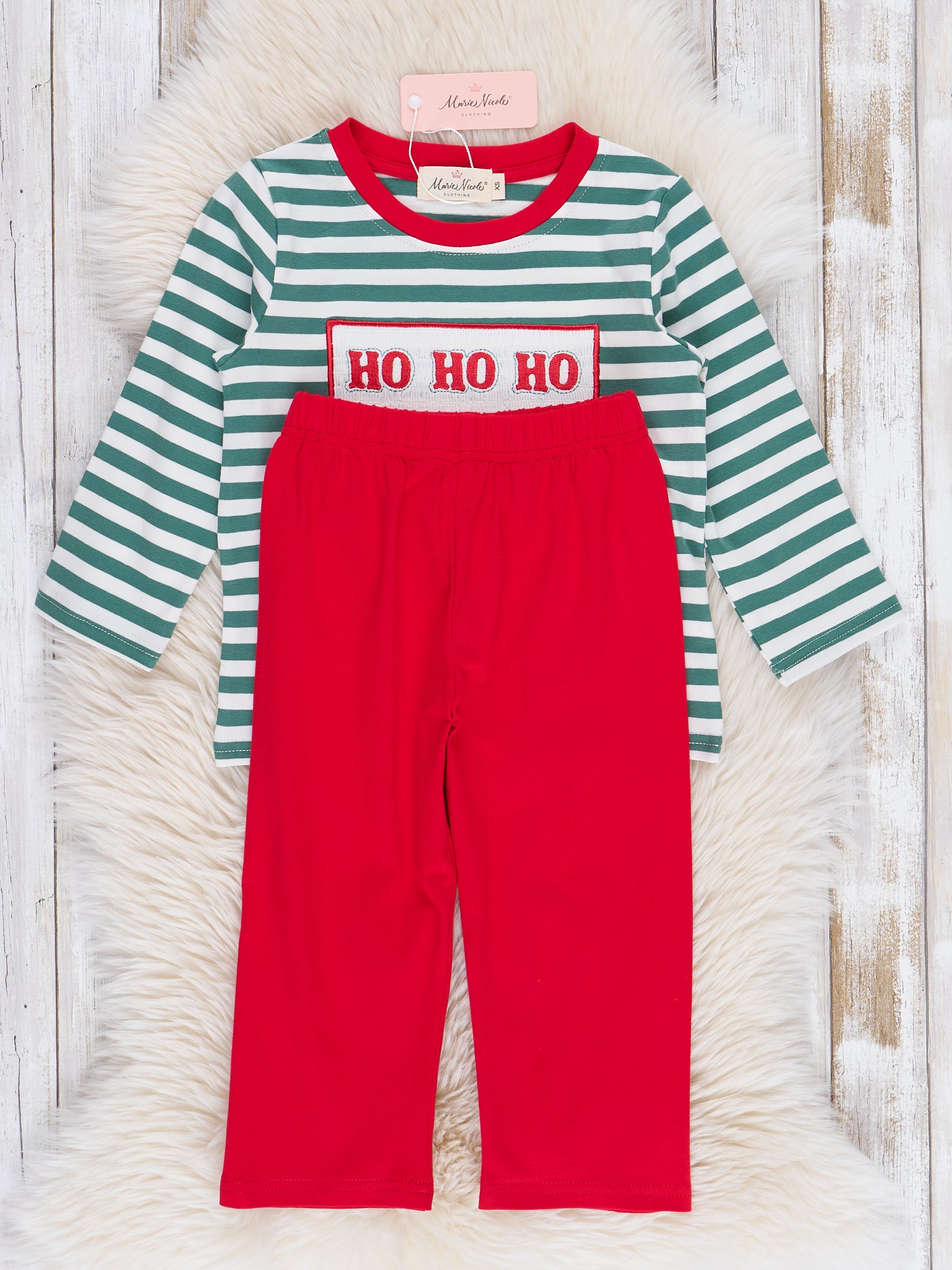 Get ready for some sibling fun with this boys' outfit! The striped top features a playful embroidered "HO, HO, HO" over smocking, while the red pull-on pants add a festive touch. Perfect for Christmas, this sibling set will have your little ones saying "Ho, ho, ho!" all day long.