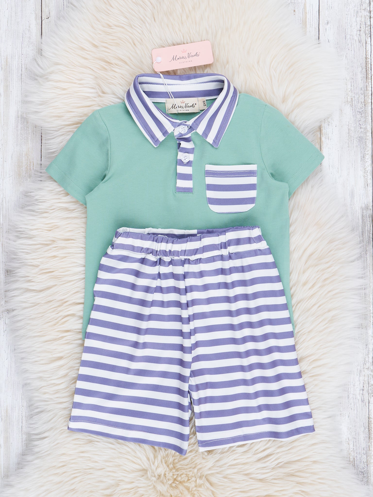 Brighten up your littles' wardrobe with this spring-ready Sage & Slate Stripes brother set. The outfit features a sage green polo accented with slate grey stripes, perfectly complementing the slate stripe shorts. Perfect for a day of fun and play!