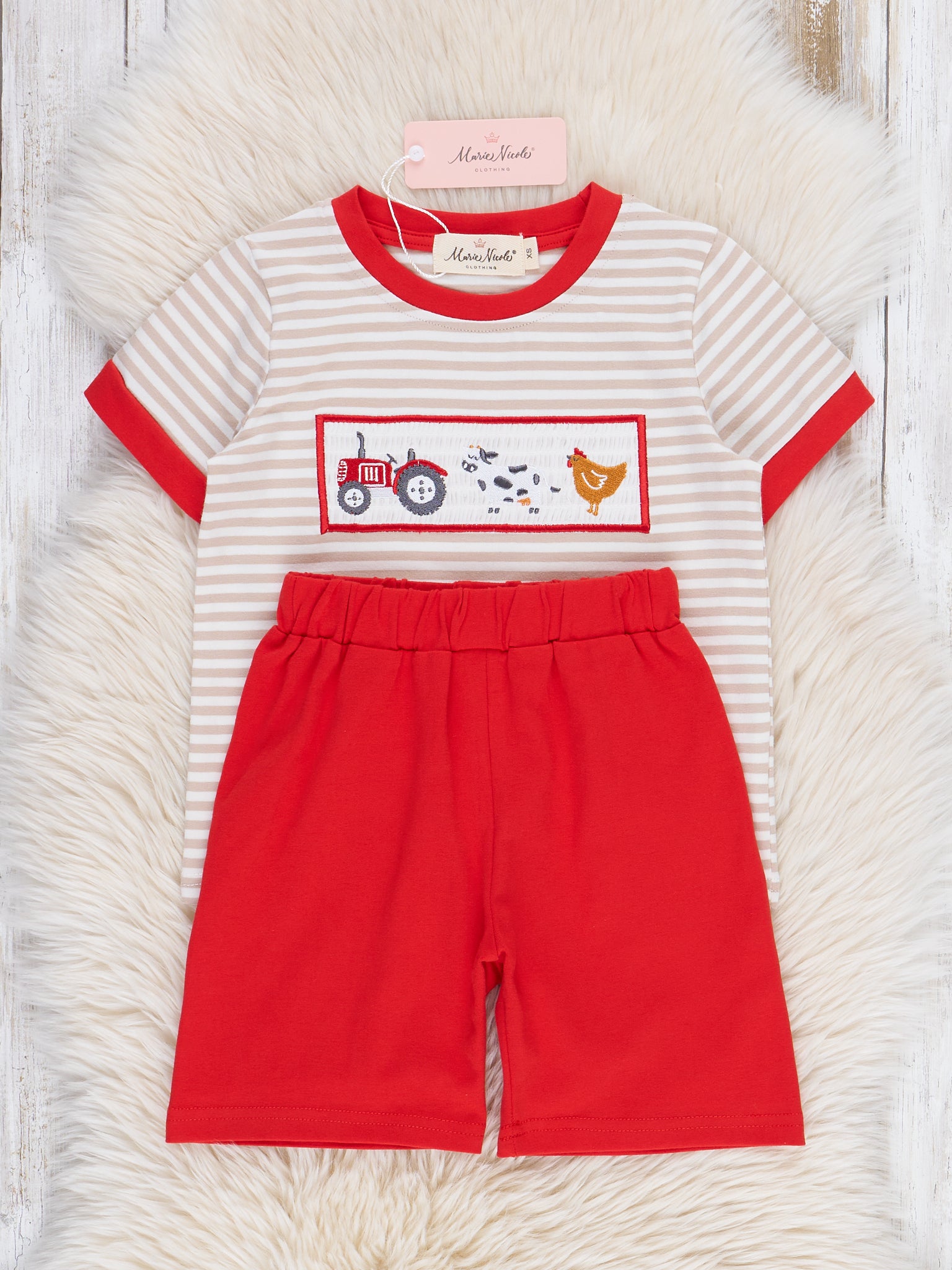 The Farm Friends Smocked Outfit is a fun and charming outfit by Marie Nicole Clothing. Featuring a playful striped pattern with adorable farm embroidery. Perfect for casual outings or everyday play, this outfit combines style, comfort, and a bit of country charm!
