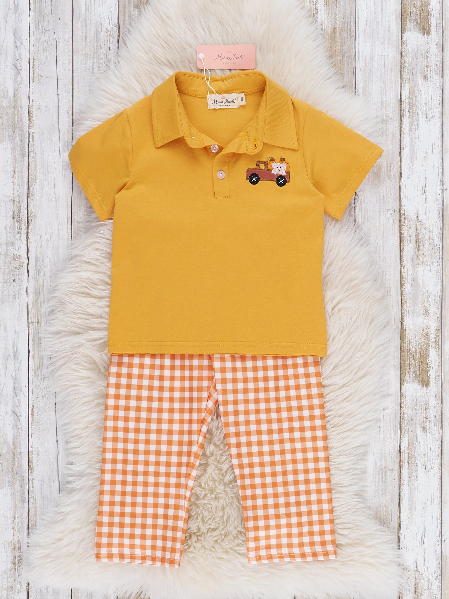 Shine bright with the Sunshine Pumpkin Embroidered Plaid Outfit by Marie Nicole Clothing! The polo top is embroidered with a truck, pumpkins, and adorable piggy, and the pants are a classy gingham. Crafted with soft fabric, this two-piece set will bring your little boy sunny fall cheer to every day!