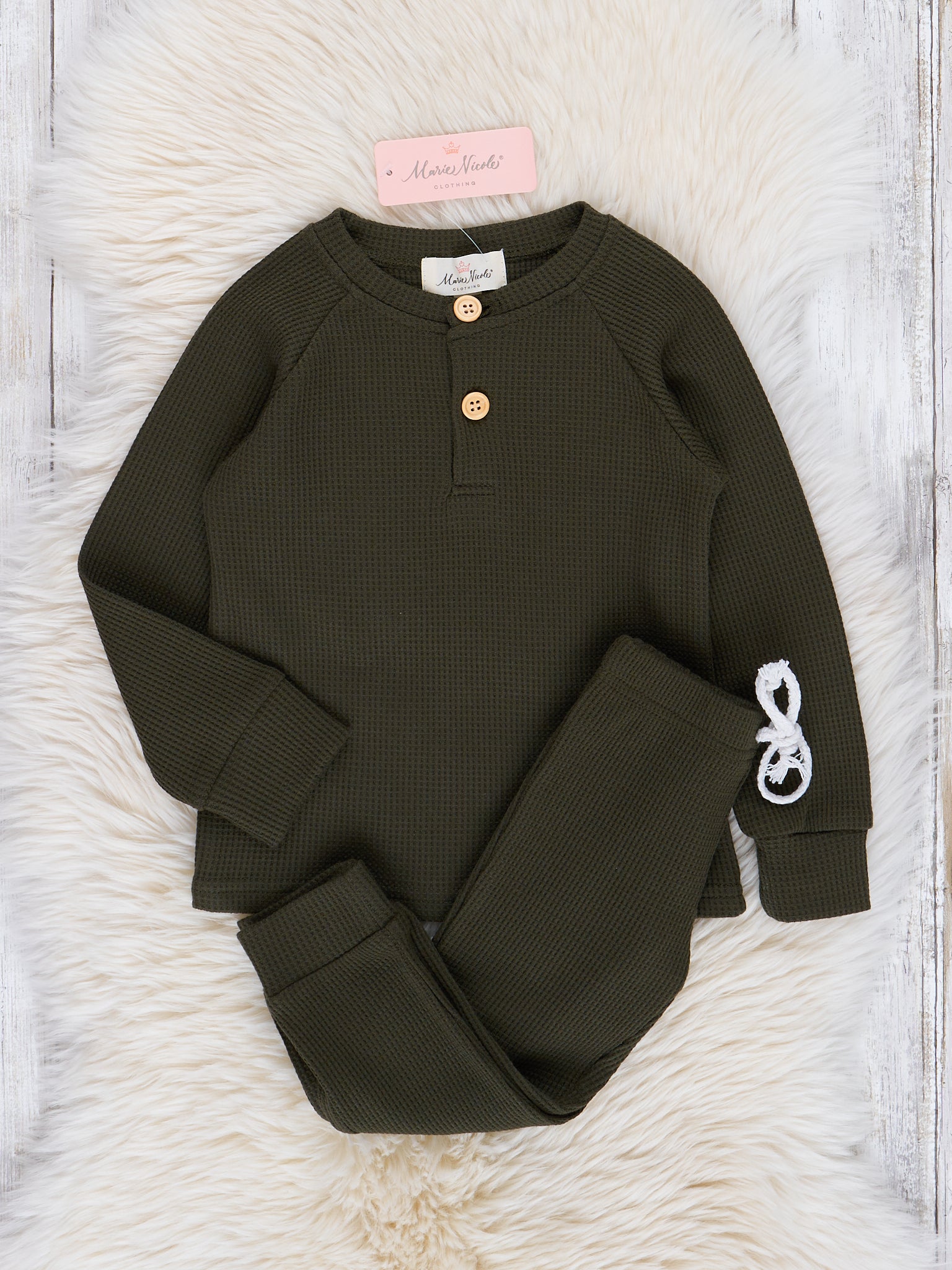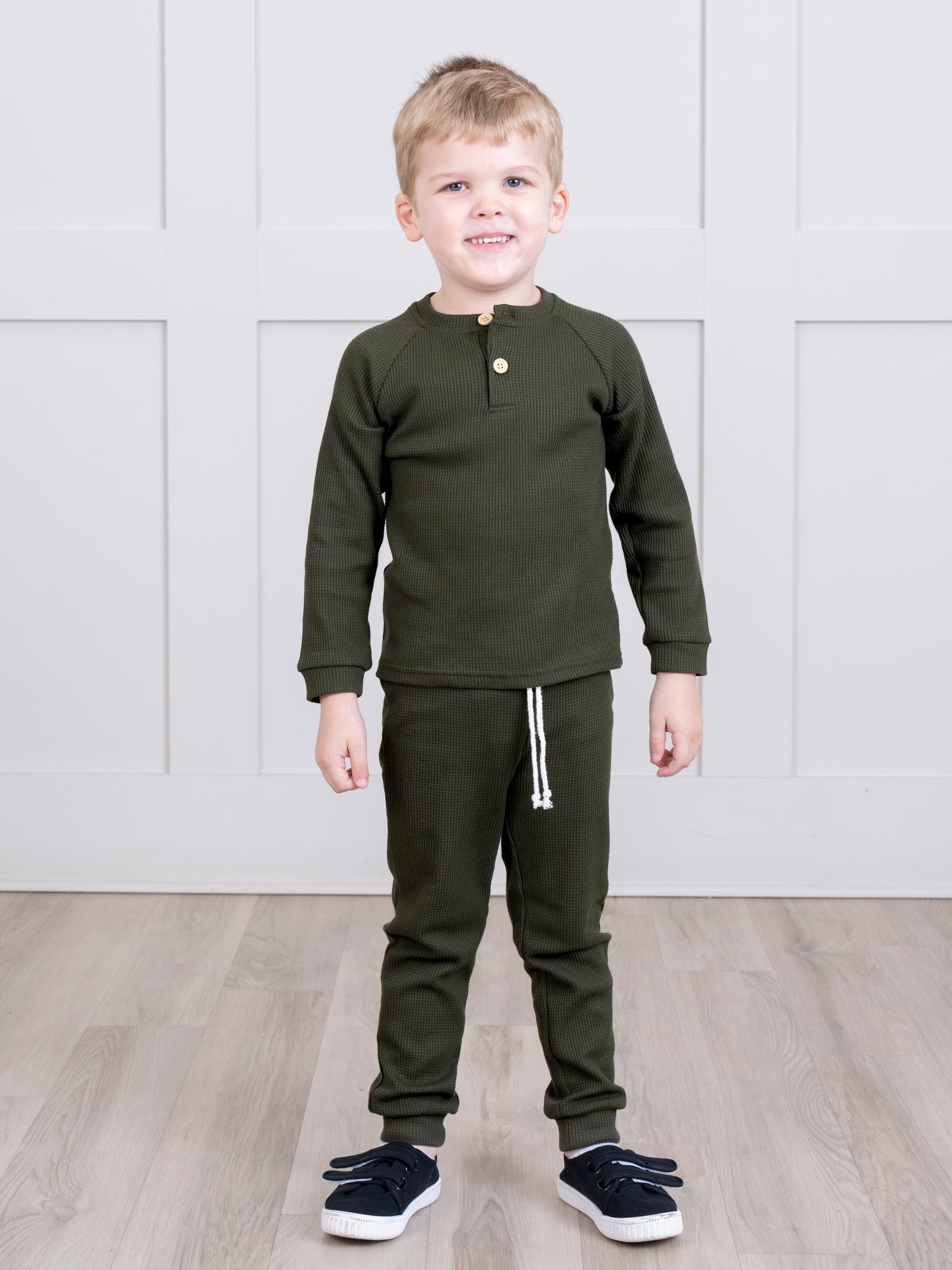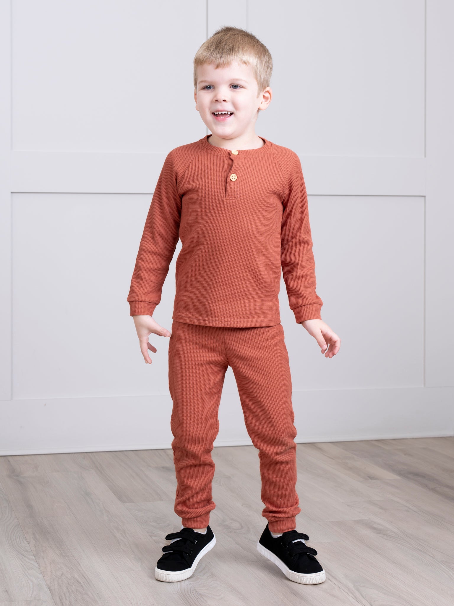 This set is all about celebrating the cozy vibes of the season with soft, muted colors. The henley top adds a touch of casual charm with its button-up neckline, while the sweatpants bring ultimate comfort for playtime or relaxation.
