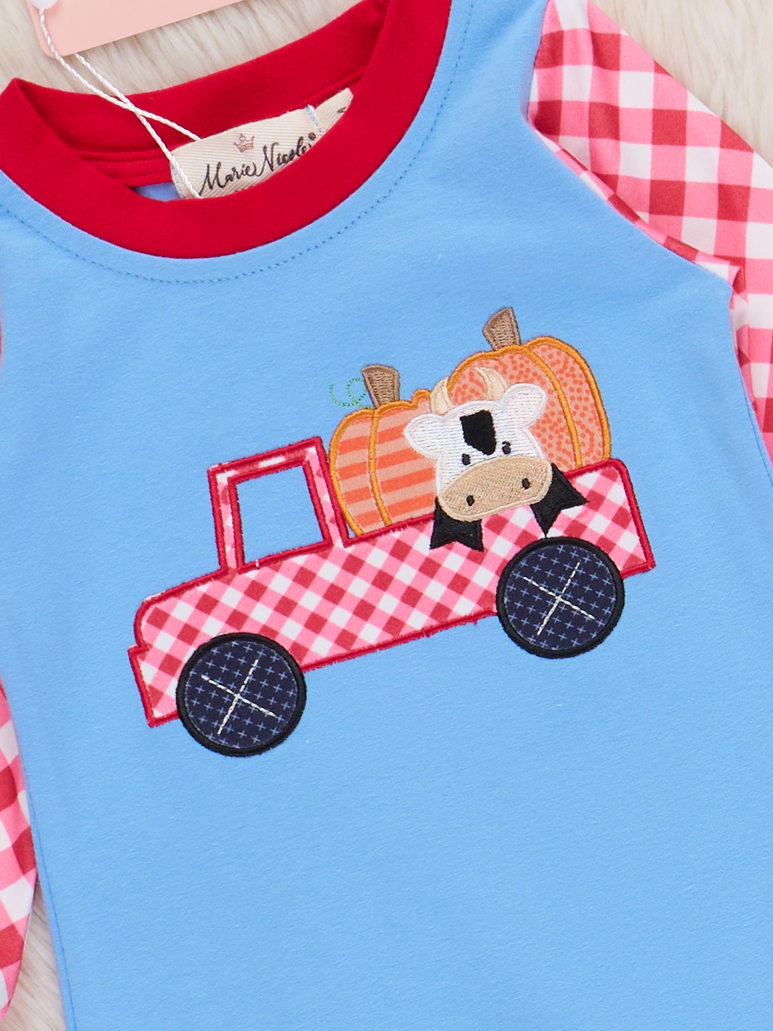 The Cattle & Pumpkins Express Embroidered Gingham Romper is a charming celebration of fall’s rustic spirit. Featuring embroidery of playful cattle and pumpkins riding on a truck, this romper from Marie Nicole Clothing blends timeless style with cozy comfort. Made from soft, breathable fabric and finished with thoughtful details, it’s perfect for pumpkin patch adventures, family gatherings, and picture-perfect autumn moments.