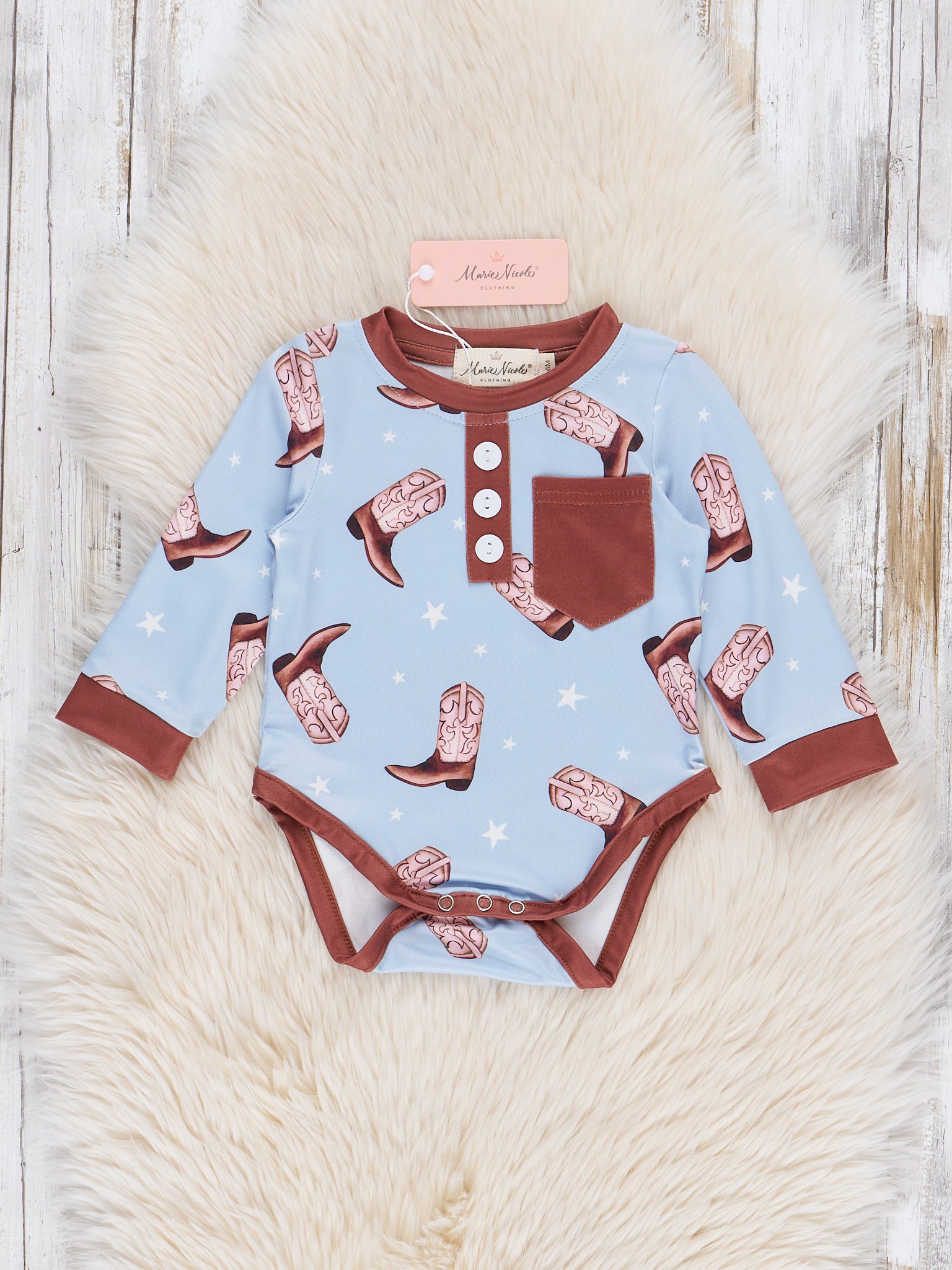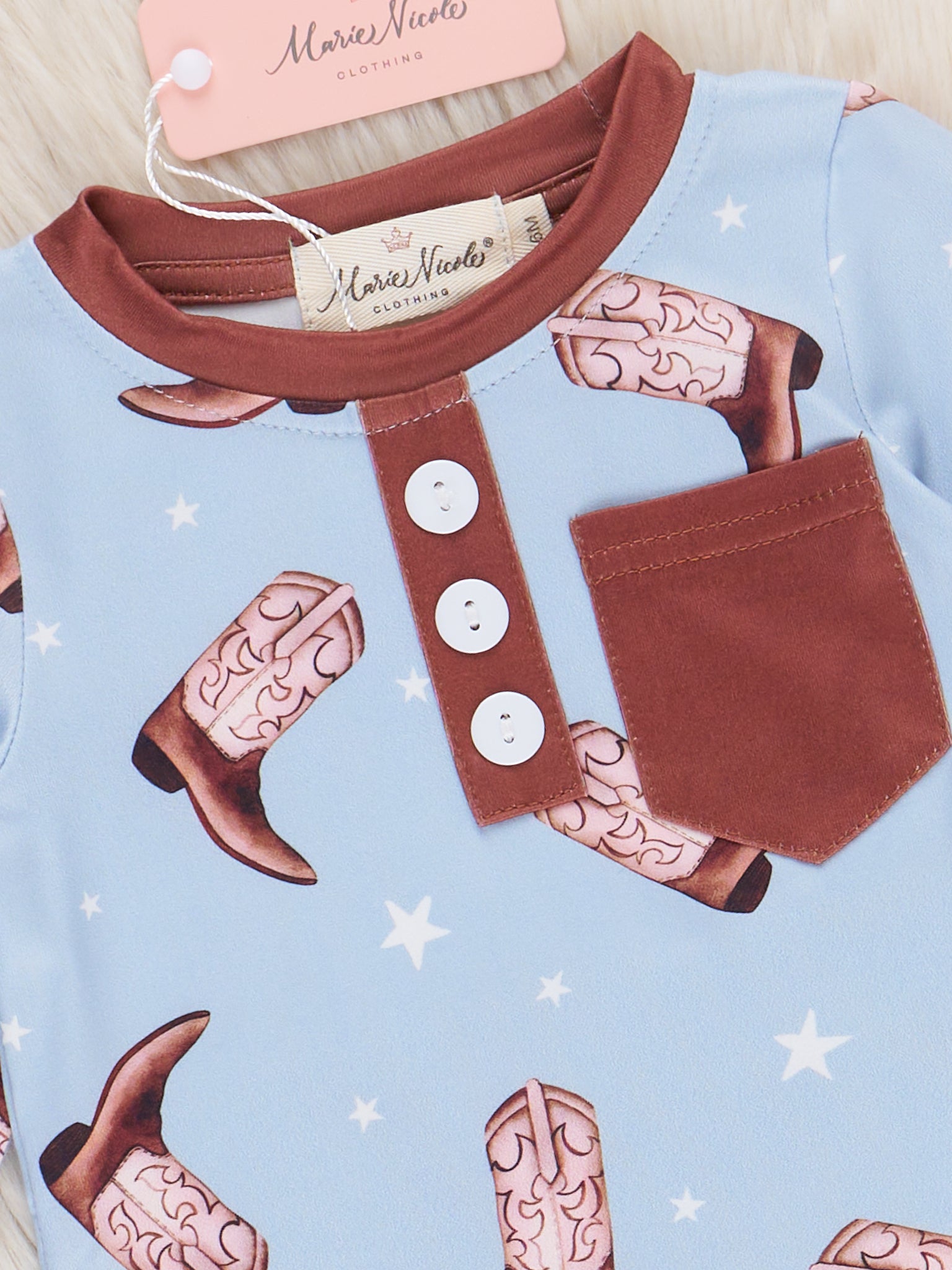 Kick up some fun with our Boot Scoot Bubble! This adorable boys’ bubble from Marie Nicole Clothing features a classic western boot print and comfy, easy-on styling. Perfect for summer days, country outings, or rodeo fun—your little cowboy will be ready to scoot in style! Match it with a coordinating sibling set for a picture-perfect roundup.