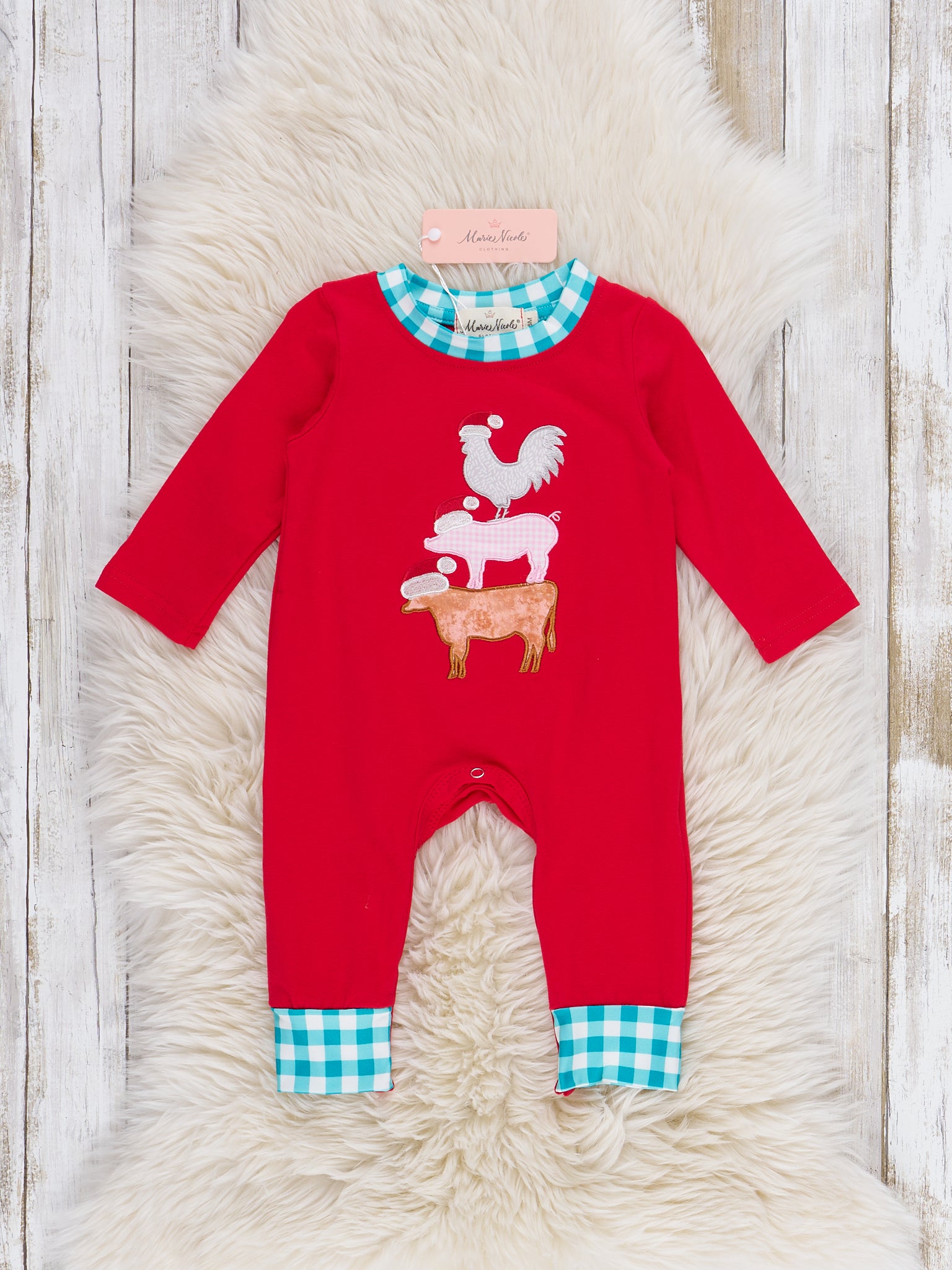 The Farmyard Friends Embroidered Romper by Marie Nicole Clothing features a playful stacked farm animal appliqué on the chest, with contrasting gingham trim at the neck and cuffs for a classic touch. This cozy, long-sleeve romper is perfect for little ones who love country style—making it ideal for playdates, farm visits, and everyday comfort.