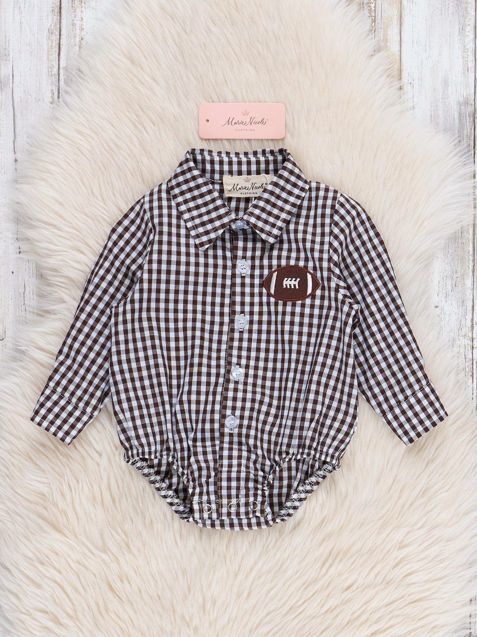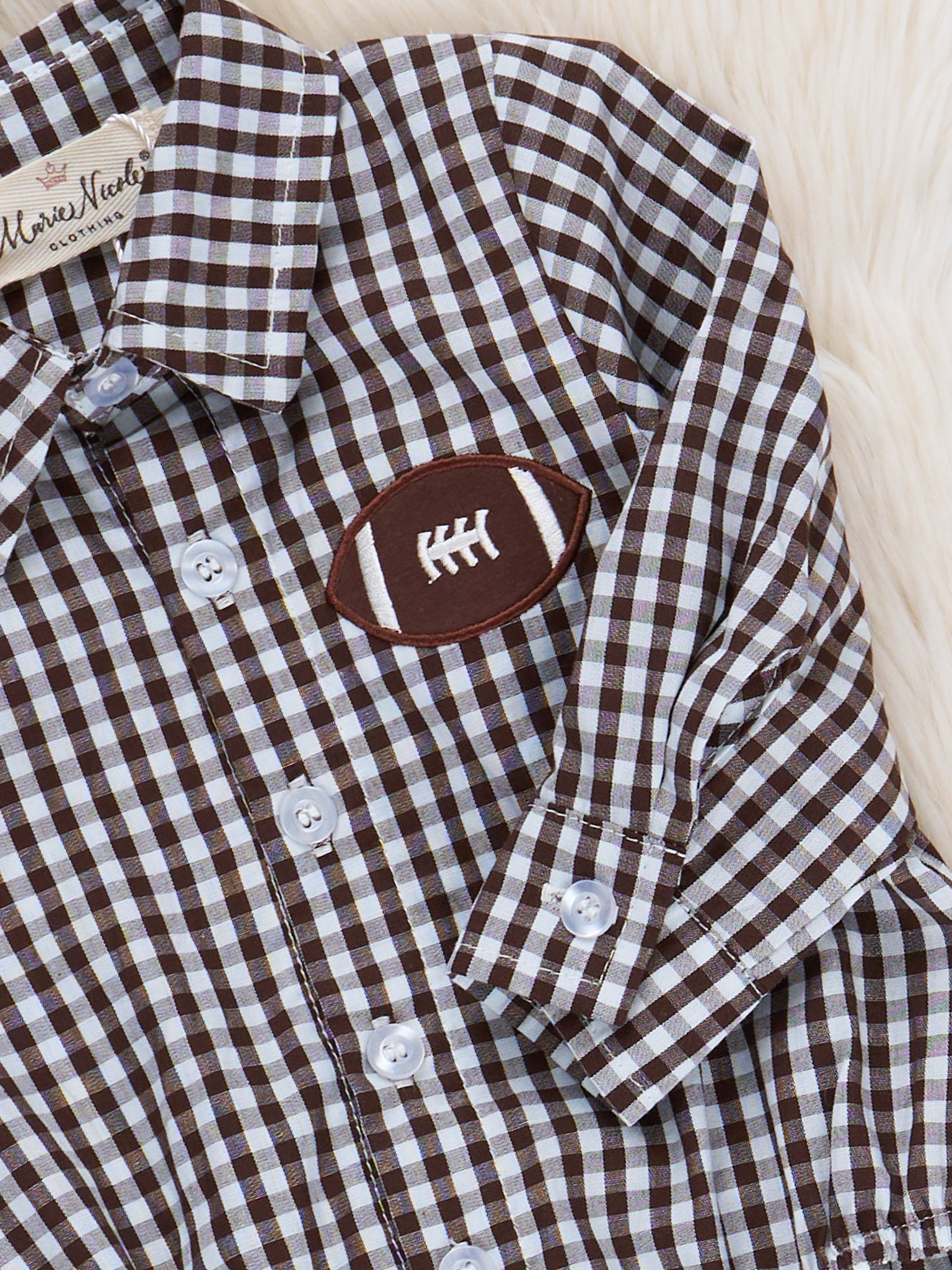 The Gingham & Goals Embroidered Cotton Bubble is sporty fun that can be dressed casual or formal. This button-up long-sleeve bubble from Marie Nicole Clothing features black-and-white plaid with an embroidered football. Your child can play outdoors or cheer on their favorite team with this comfortable and snazzy gameday romper.