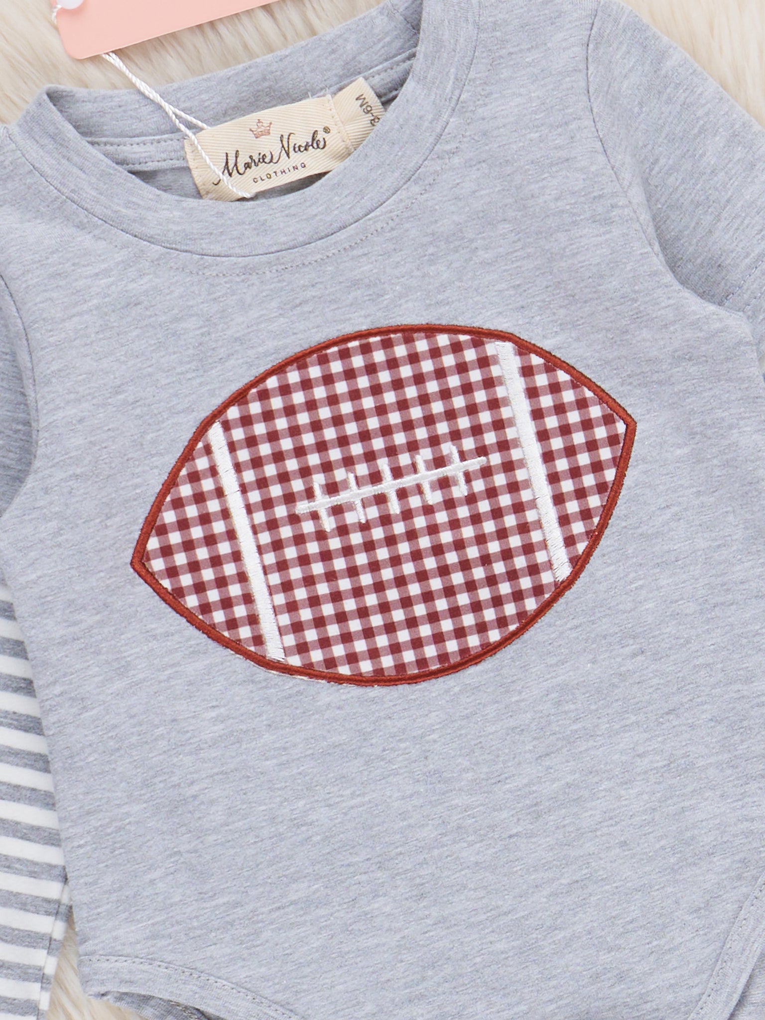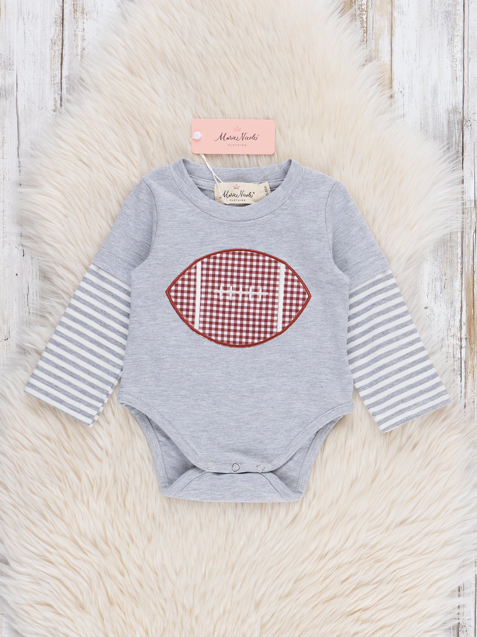 The Hut Hut Hike Embroidered Football Onesie is a stellar staple for gameday. With an embroidered football and classic striped sleeves, this romper from Marie Nicole Clothing is great for the football season or everyday wear. Crafted from soft, stretchy material, your child will stay comfortable no matter the occasion!