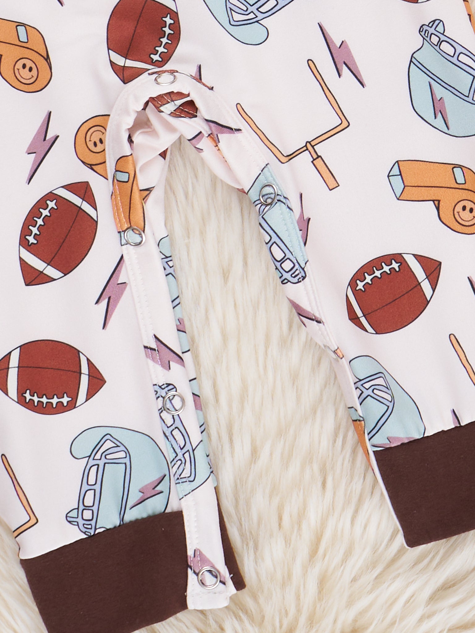 Get comfy for gameday with the Little All-Star Pocket Romper! This Marie Nicole Clothing one-piece is a trendy and casual romper with a playful pattern of iconic football symbols, finished with a cool kangaroo pocket. Made with soft, comfortable material, your child can play with footballs or settle in for watching a good game!