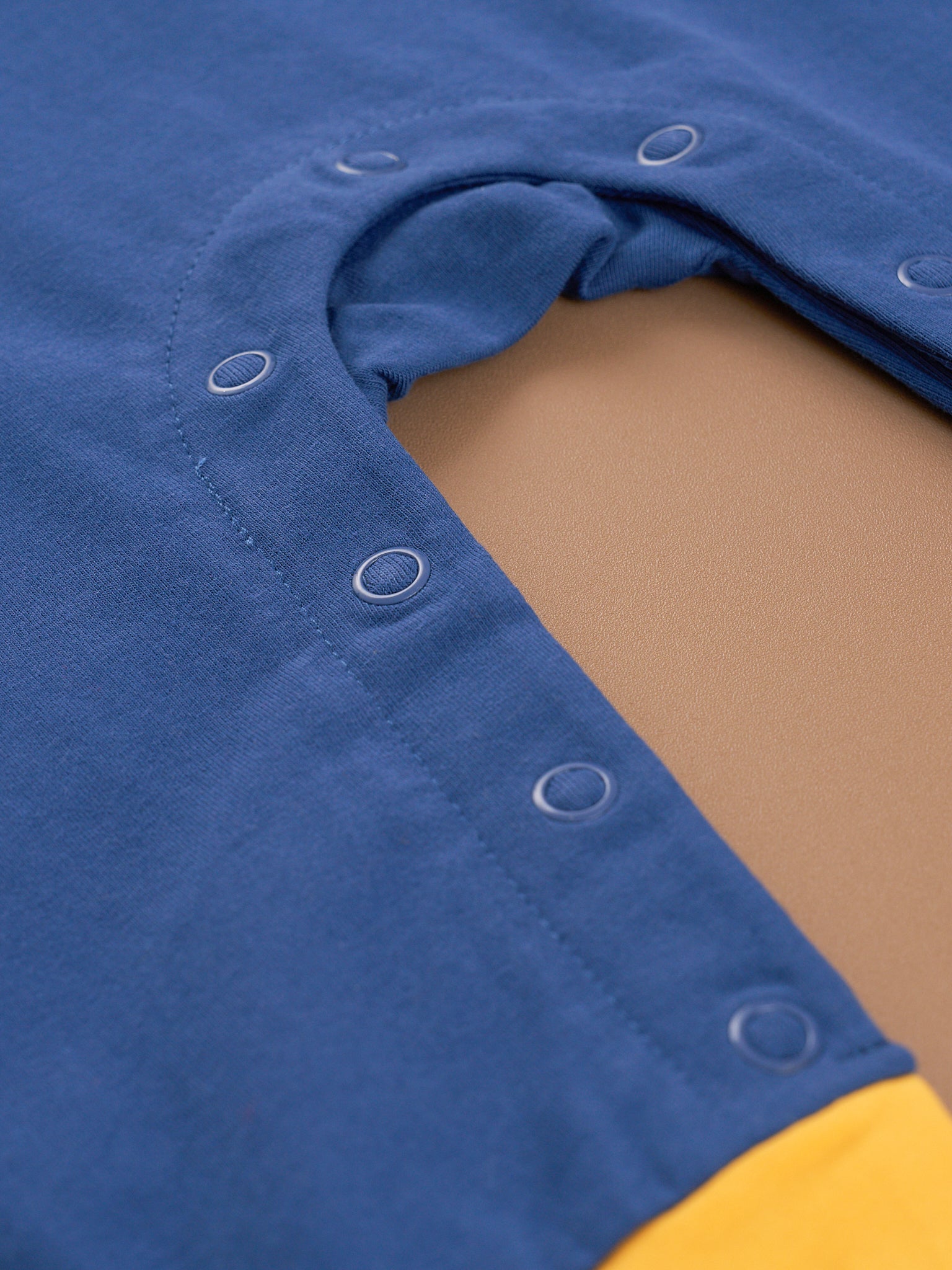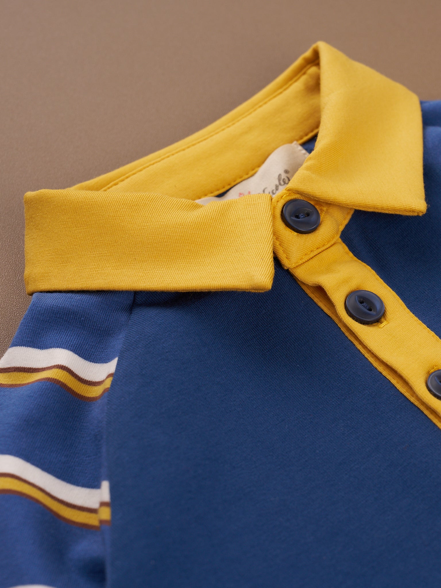 This boys' romper features our Treasured Petals stripe print on raglan sleeves. The vibrant blue hue perfectly contrasts with the golden yellow on the cinched ankles and polo collar.