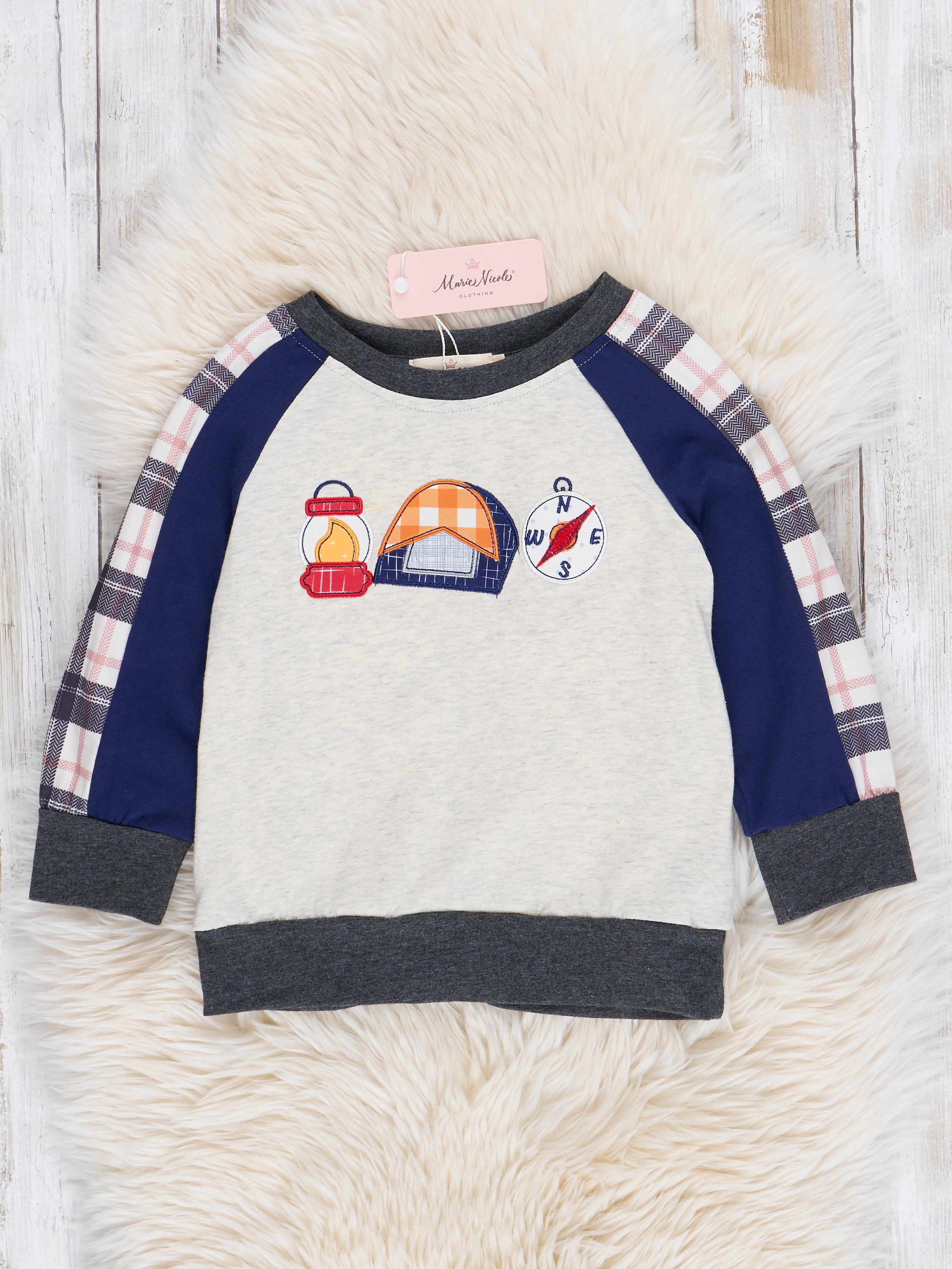 Get your little man ready for outdoor adventures in style with our Heather Grey Embroidered Campfire Raglan Shirt! Made just for MNC, this boys shirt features plaid raglan sleeves and an embroidered campfire design. Perfect for matching with his brother for a cool brother set. Let's go camping, bro!
