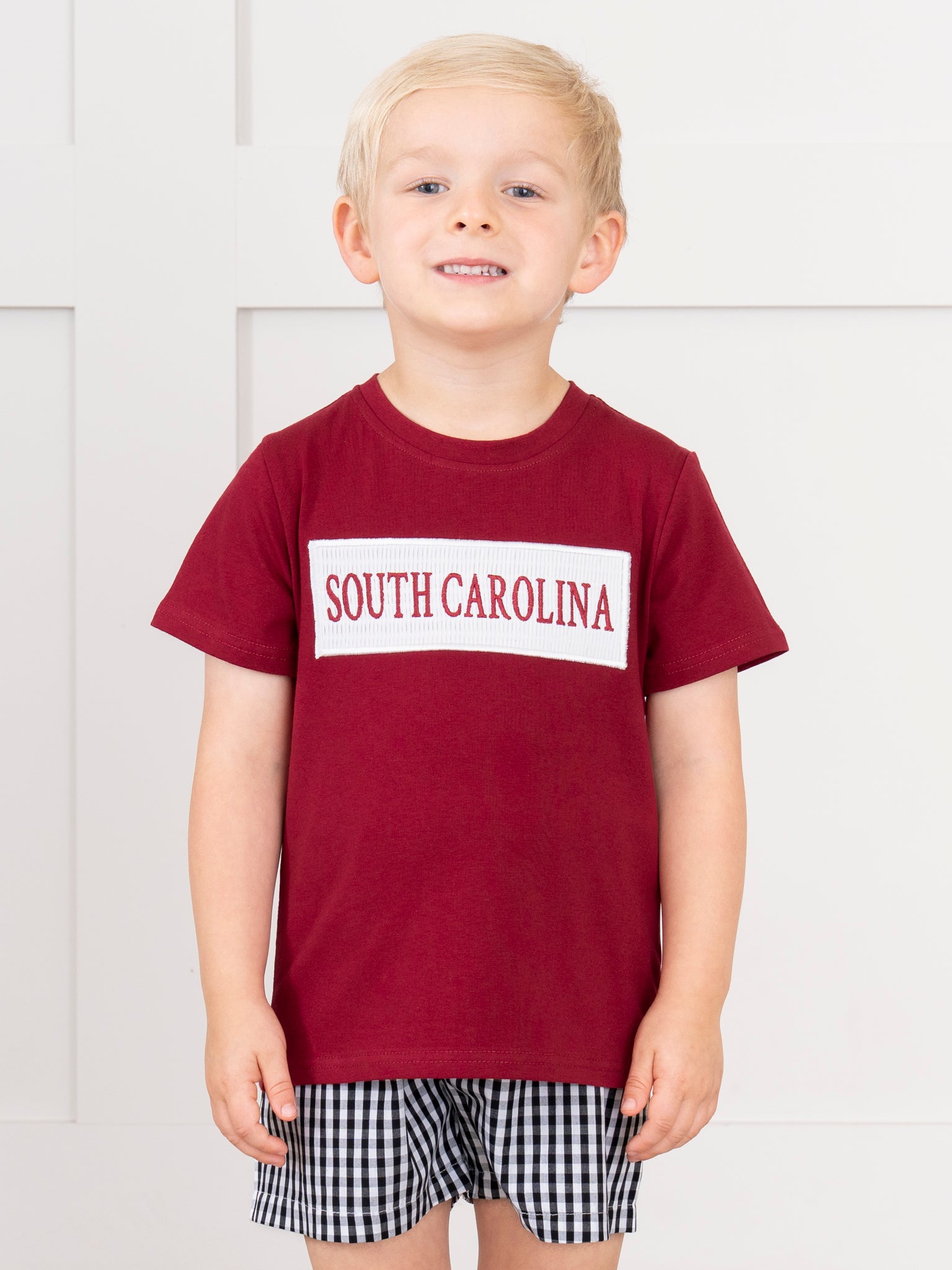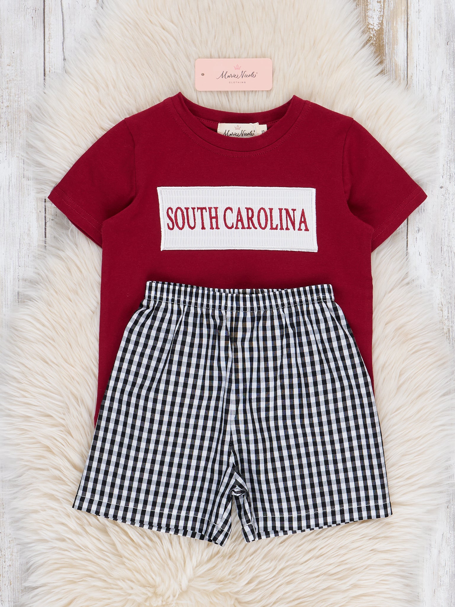 The South Carolina Smocked Gingham Outfit is a sweet and spirited look that’s perfect for your little fan. This two-piece set from Marie Nicole Clothing features a bright red tee with a smocked “South Carolina” applique, paired with classic black and white gingham shorts. Designed with breathable fabric and a comfortable fit, it’s ideal for warm-weather outings, tailgates, or cheering on the state in style. Southern charm and team pride come together in this adorable game day favorite.
