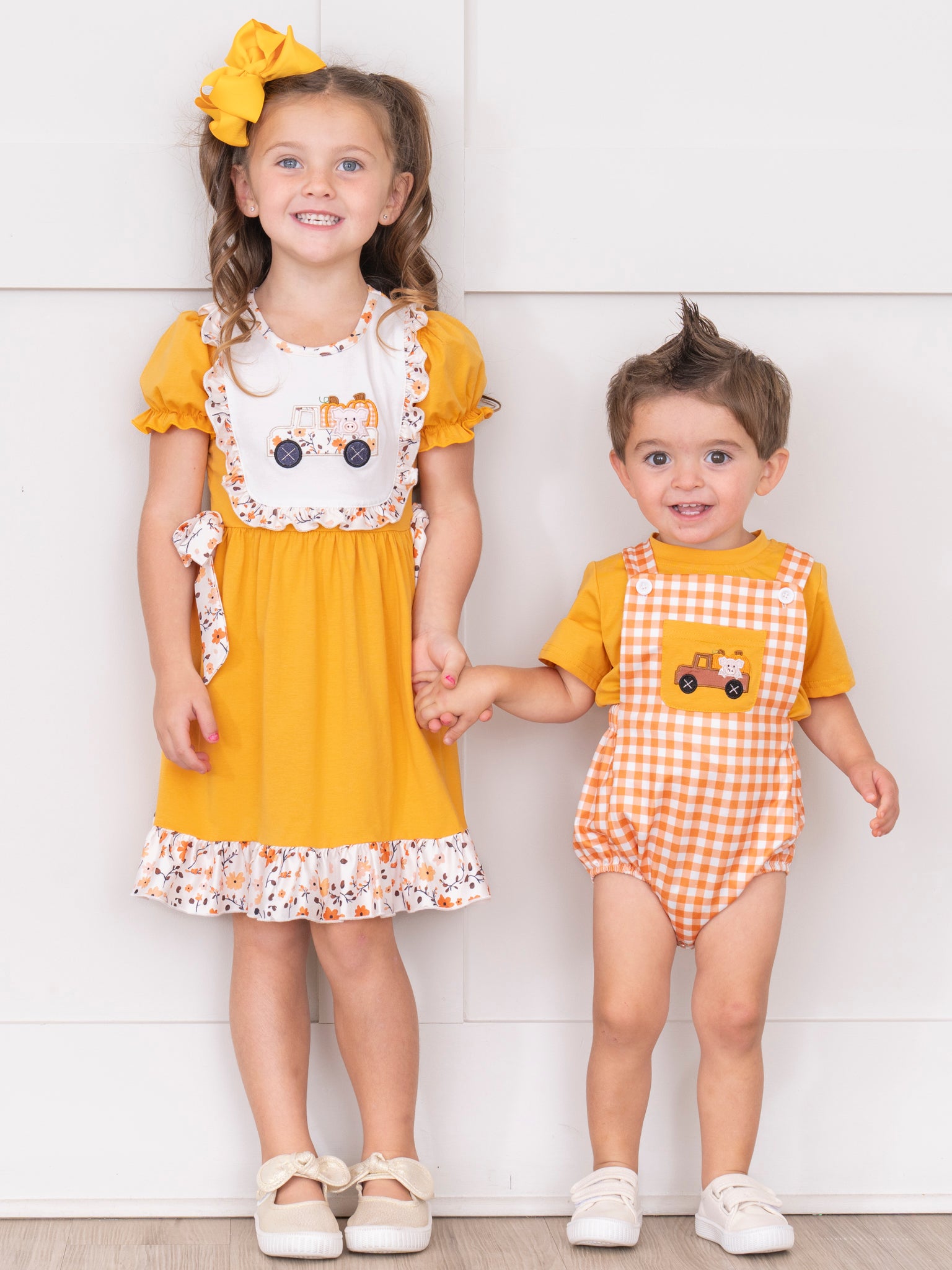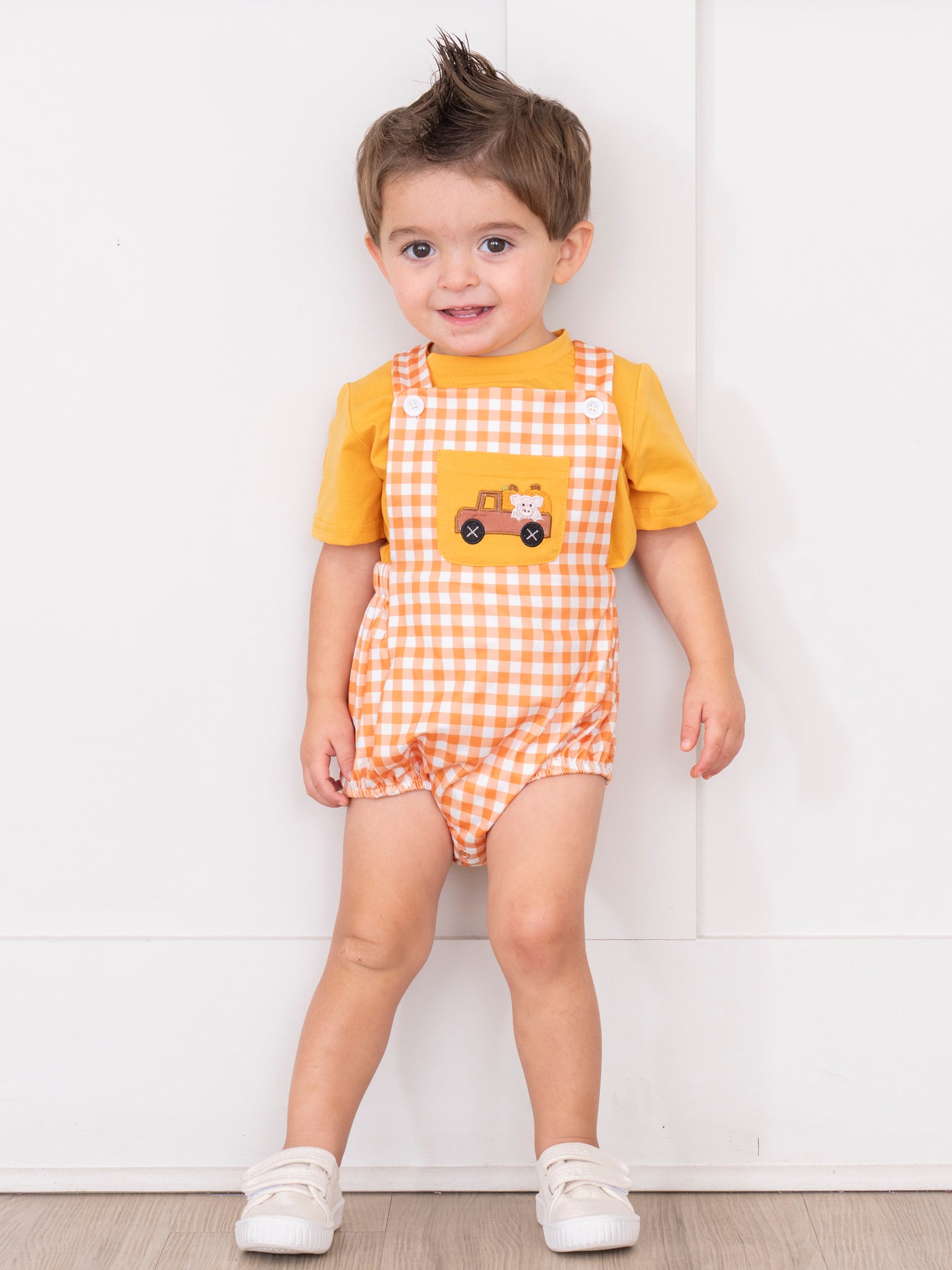 Sunshine Pumpkin Embroidered Plaid Overall Bubble Set