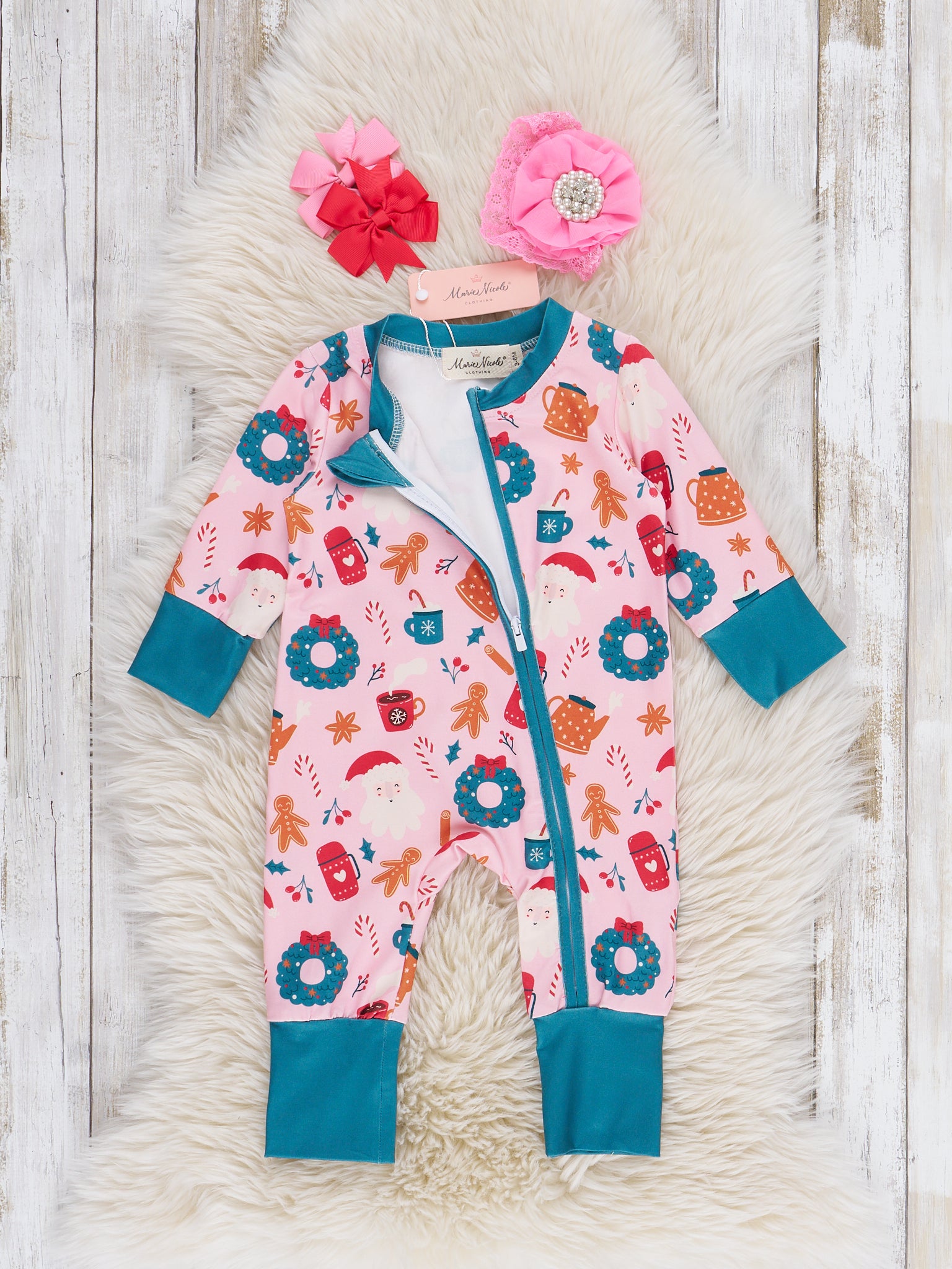 The Cozy Holiday Moments Sleeper Pajamas is a festive favorite, featuring a playful holiday wreath and seasonal print with contrasting trim for a stylish finish. Designed with a convenient front zipper and soft, cozy fabric, this one-piece from Marie Nicole Clothing is perfect for holiday lounging, family photos, and celebrating the season in comfort and charm.