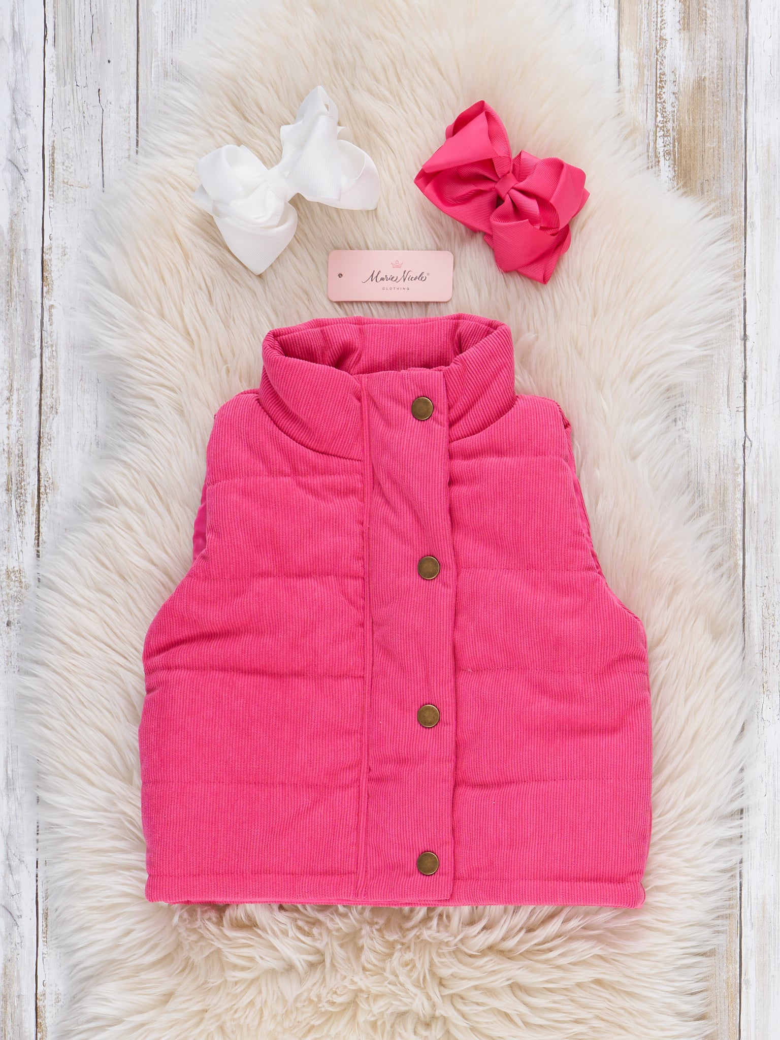 The Corduroy Puffer Vest in Hot Pink by Marie Nicole features a cozy, quilted design with snap-button closures down the front and a high neckline for extra warmth. Its sleeveless cut allows for easy layering, making it a versatile essential for chilly days