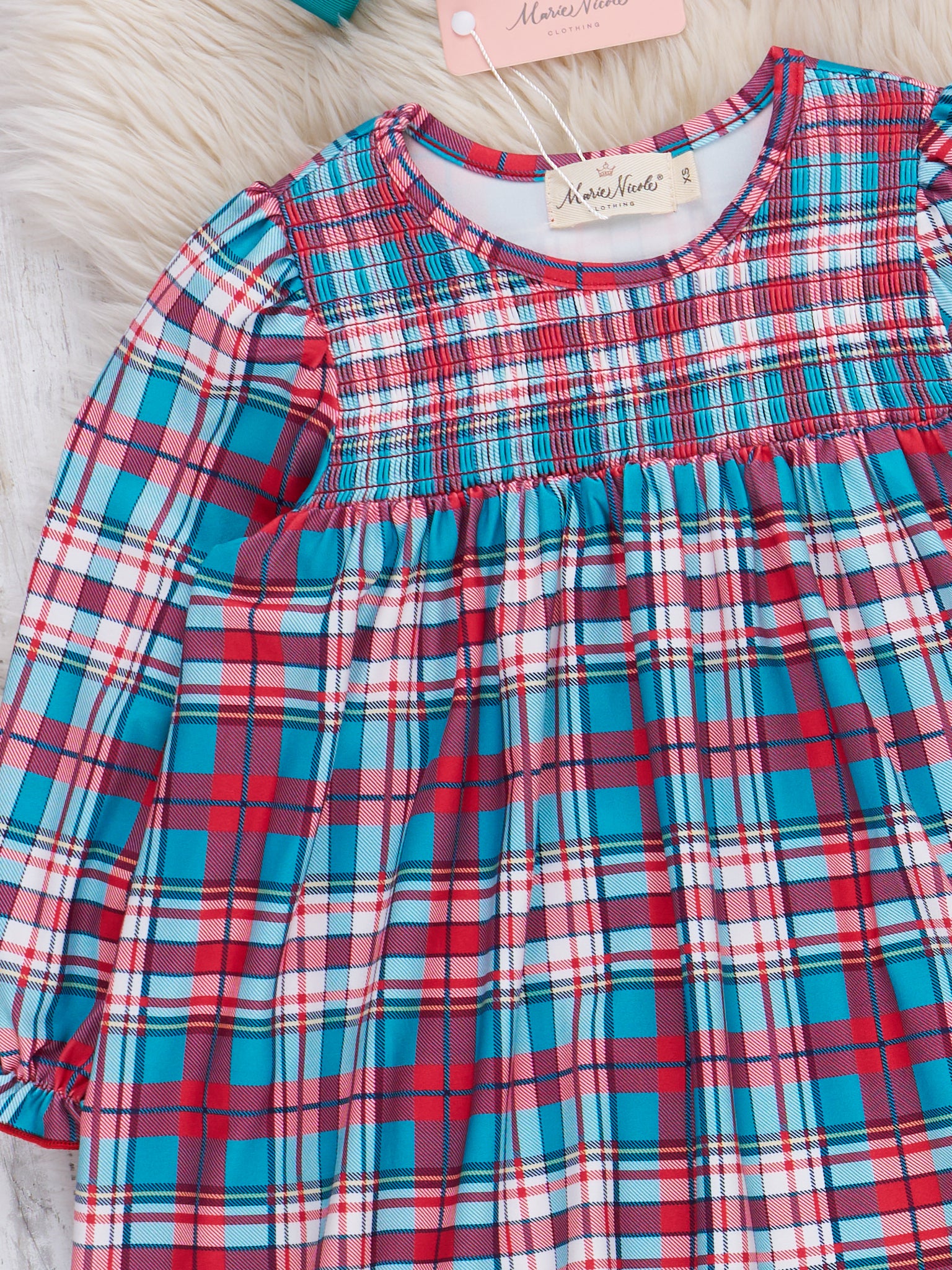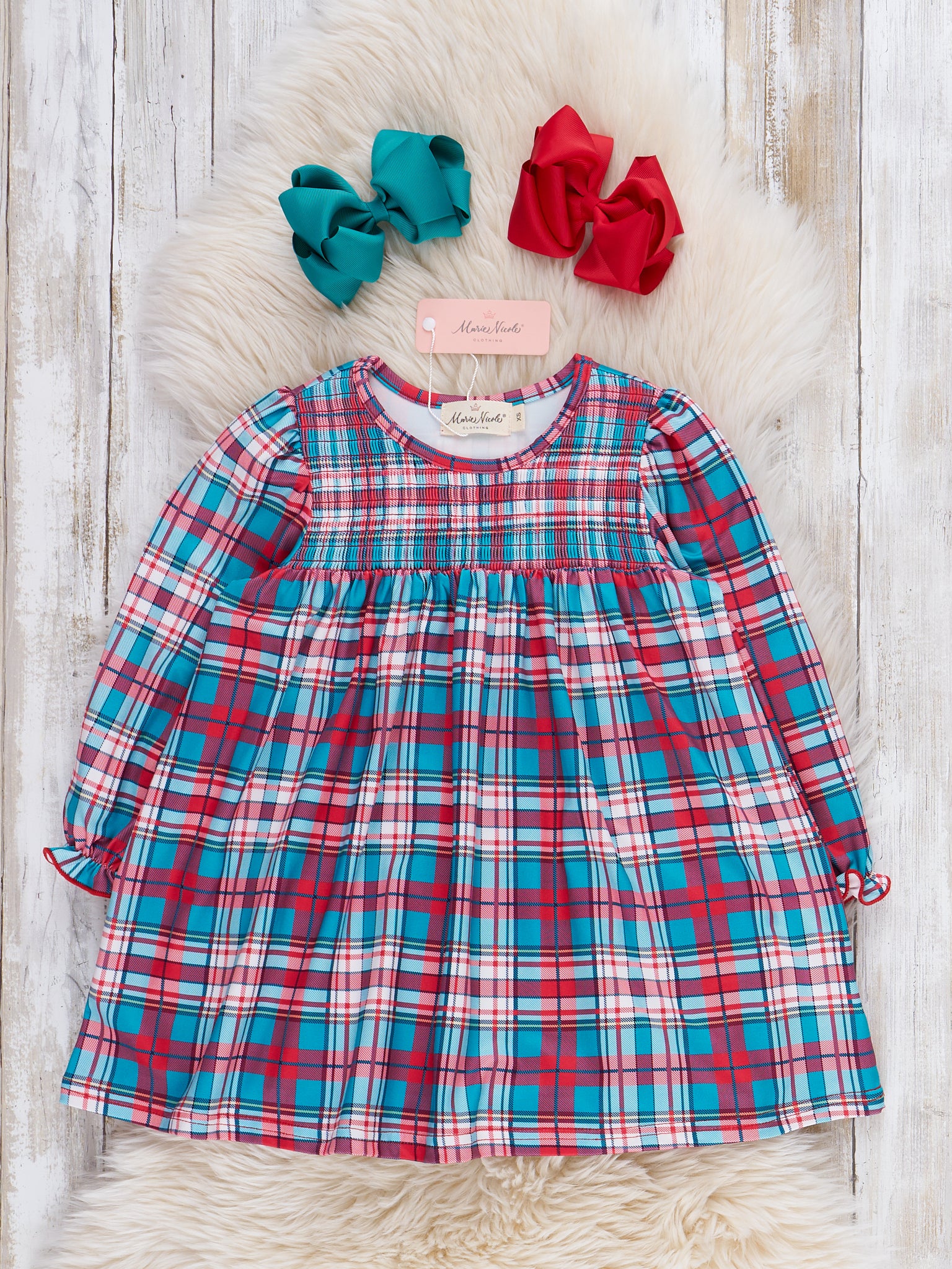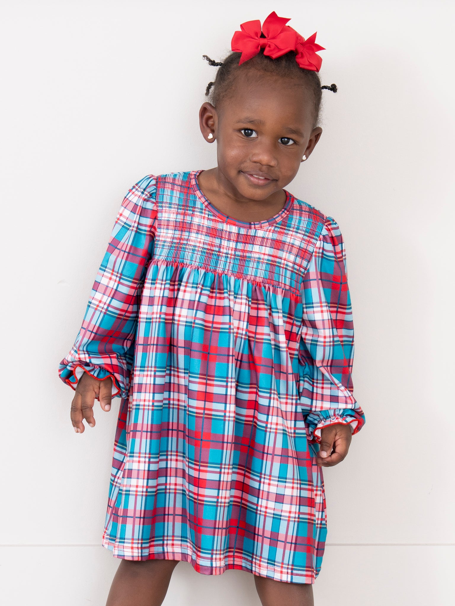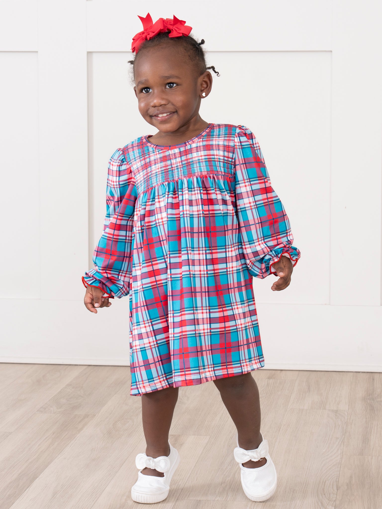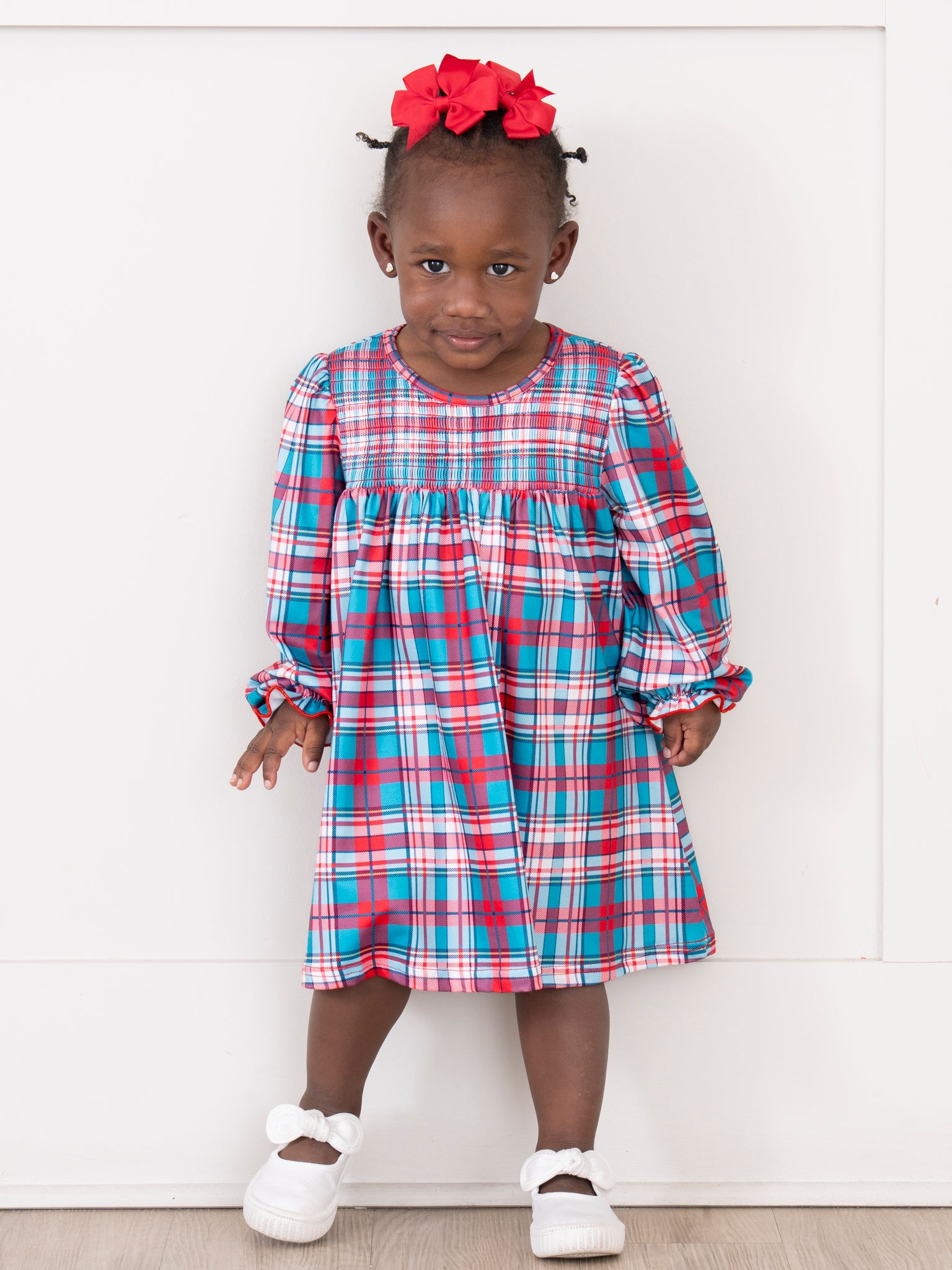 The Festivity Road Plaid Smocked Dress by Marie Nicole is a classic long-sleeve, gathered dress featuring an allover plaid pattern and gentle ruffle details at the cuffs. Its timeless silhouette makes it perfect for cozy outings, family gatherings, or festive celebrations