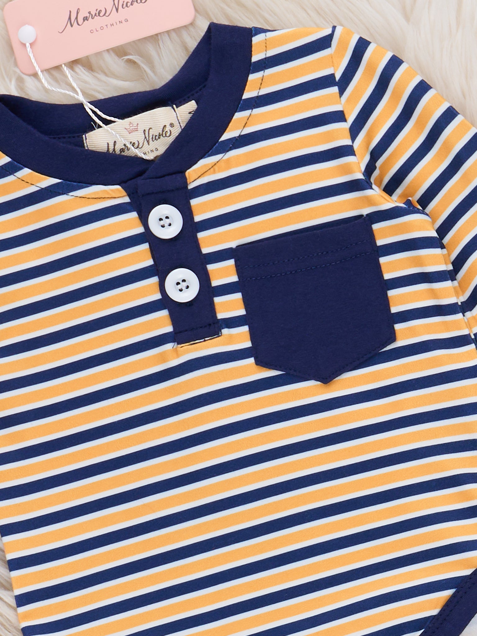 The Midnight Blooms Pocket Romper by Marie Nicole features classic horizontal stripes, a contrast trim neckline, and a matching pocket and sleeve cuffs. The button placket and snap closure bottom provide easy dressing, making this long-sleeve romper both playful and practical.