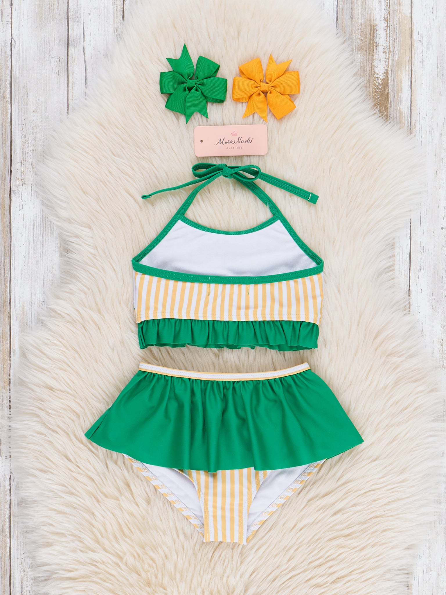 The best swimsuit set for your farm kids by Marie Nicole Clothing! This two-piece swimsuit features a tie top with yellow stripes, tractor details, green ruffle trim, & matching striped bottoms with a green dressy skirt.