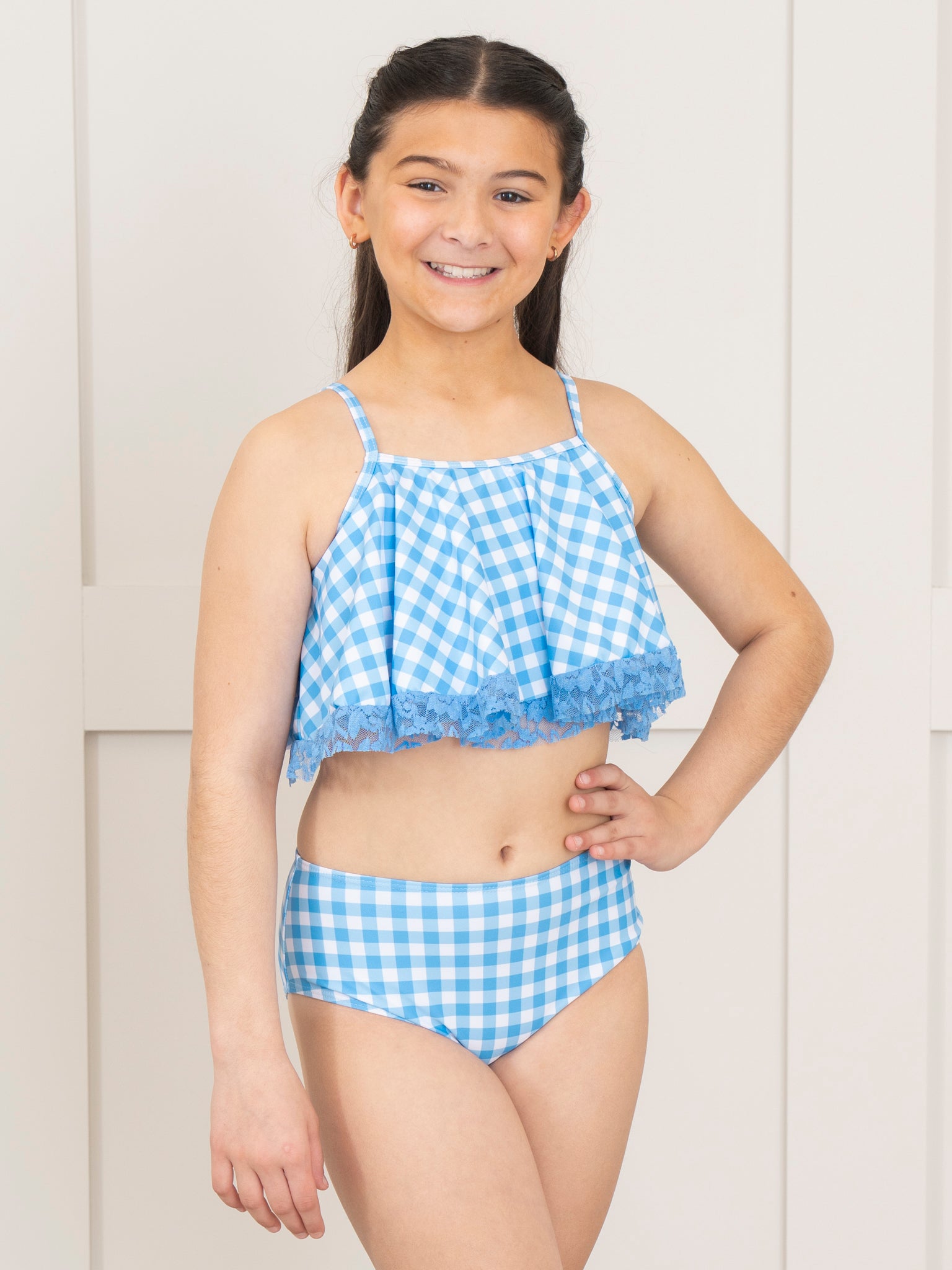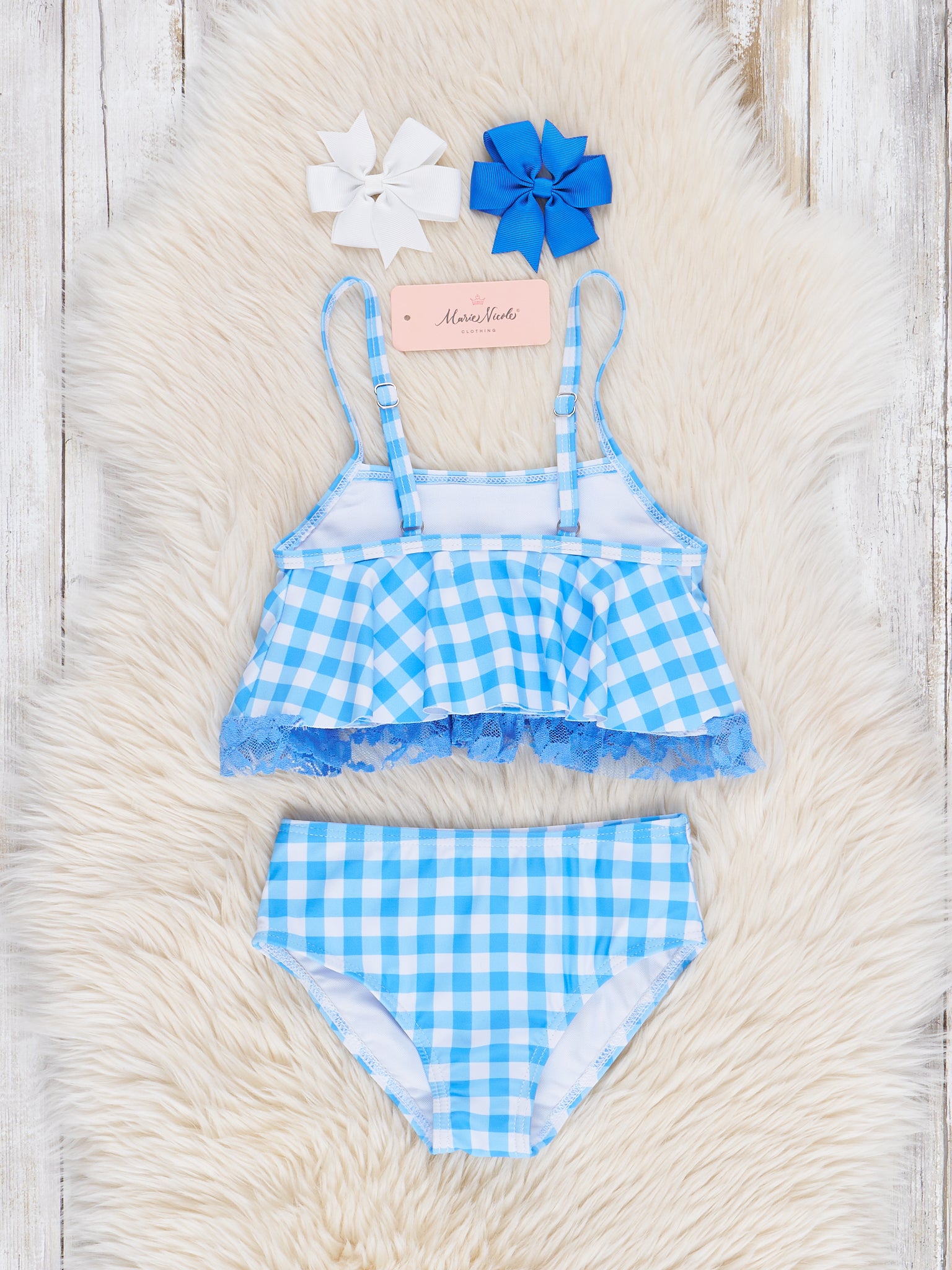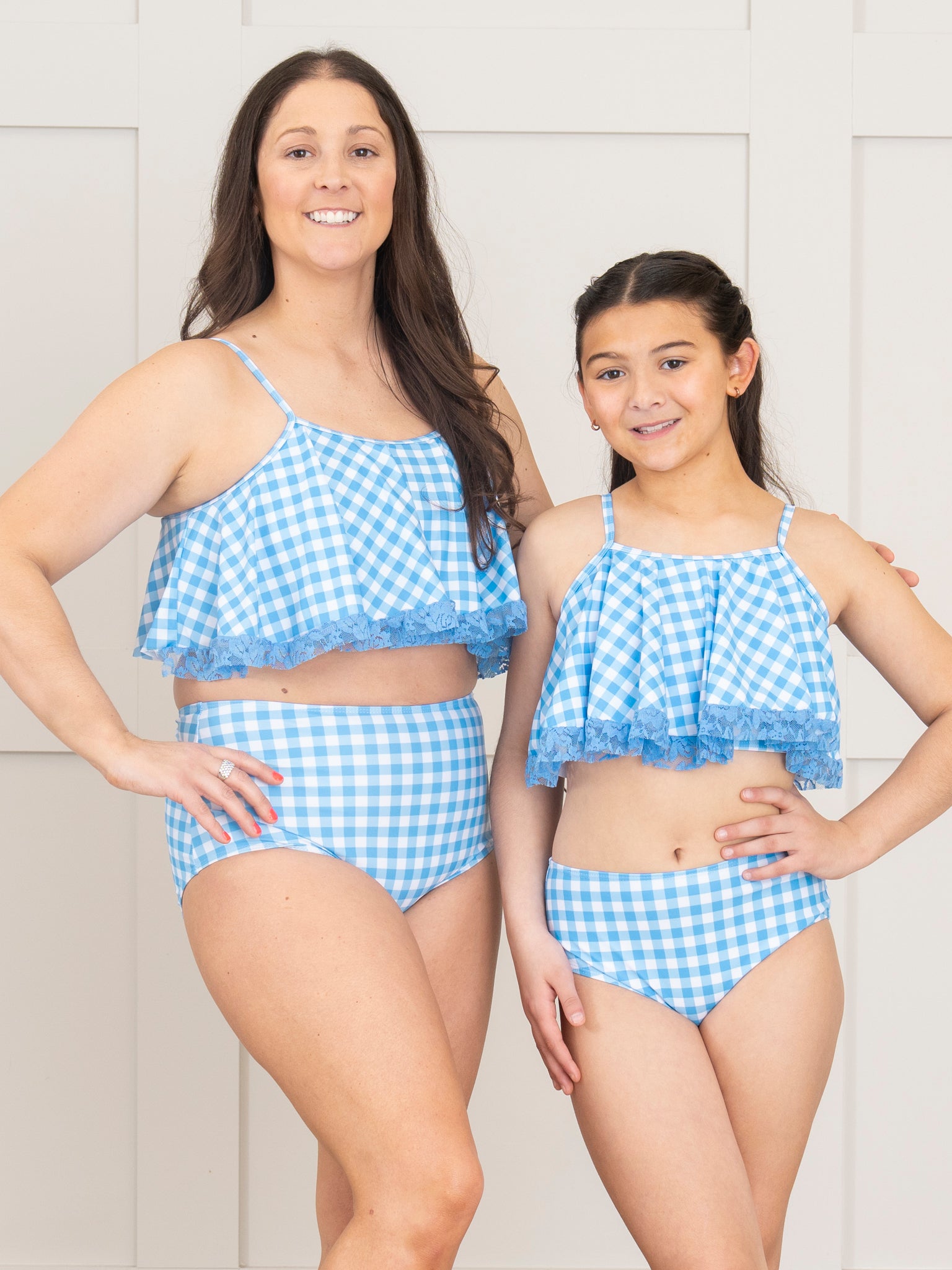 Get ready to make a splash this summer with our Summer Gingham Lacy Swimsuit! This two-piece set features a stylish blue gingham print that is perfect for any beach day. The adjustable strap top with lace trim provides a comfortable and customizable fit, while the high waist bottoms offer a flattering silhouette. Plus, it's a Mom & Me set, so you and your little one can match in style. Get yours from Marie Nicole Clothing now!