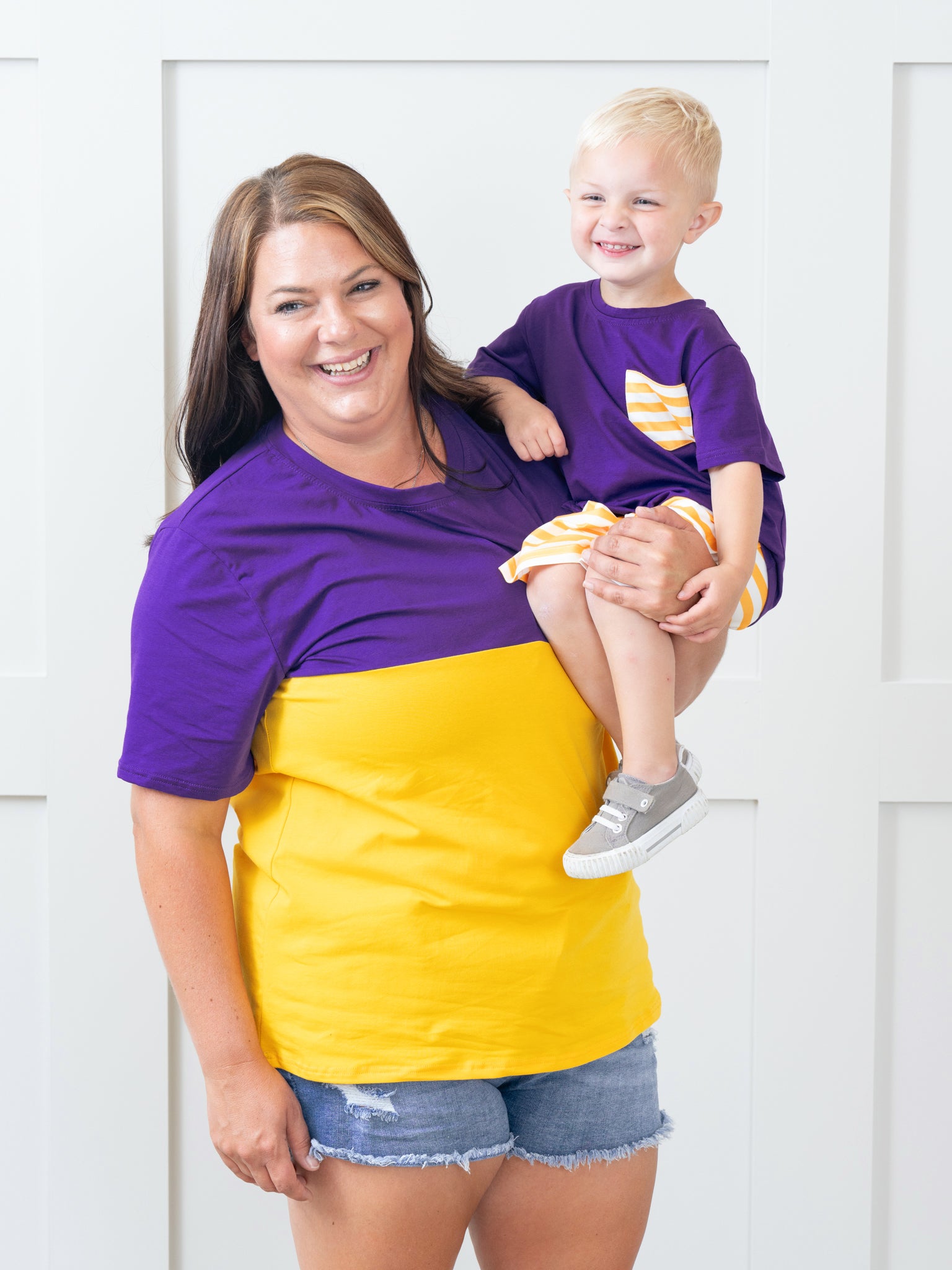 Give your game day clothes an upgrade with collegiate clothing. Find clothes for the whole family in your favorite team’s colors at Marie Nicole Clothing. Whether adorable stripes in crimson and white reflect your team loyalty or color-blocked tees in purple and gold match your team, you’ll find great game day clothing options here.