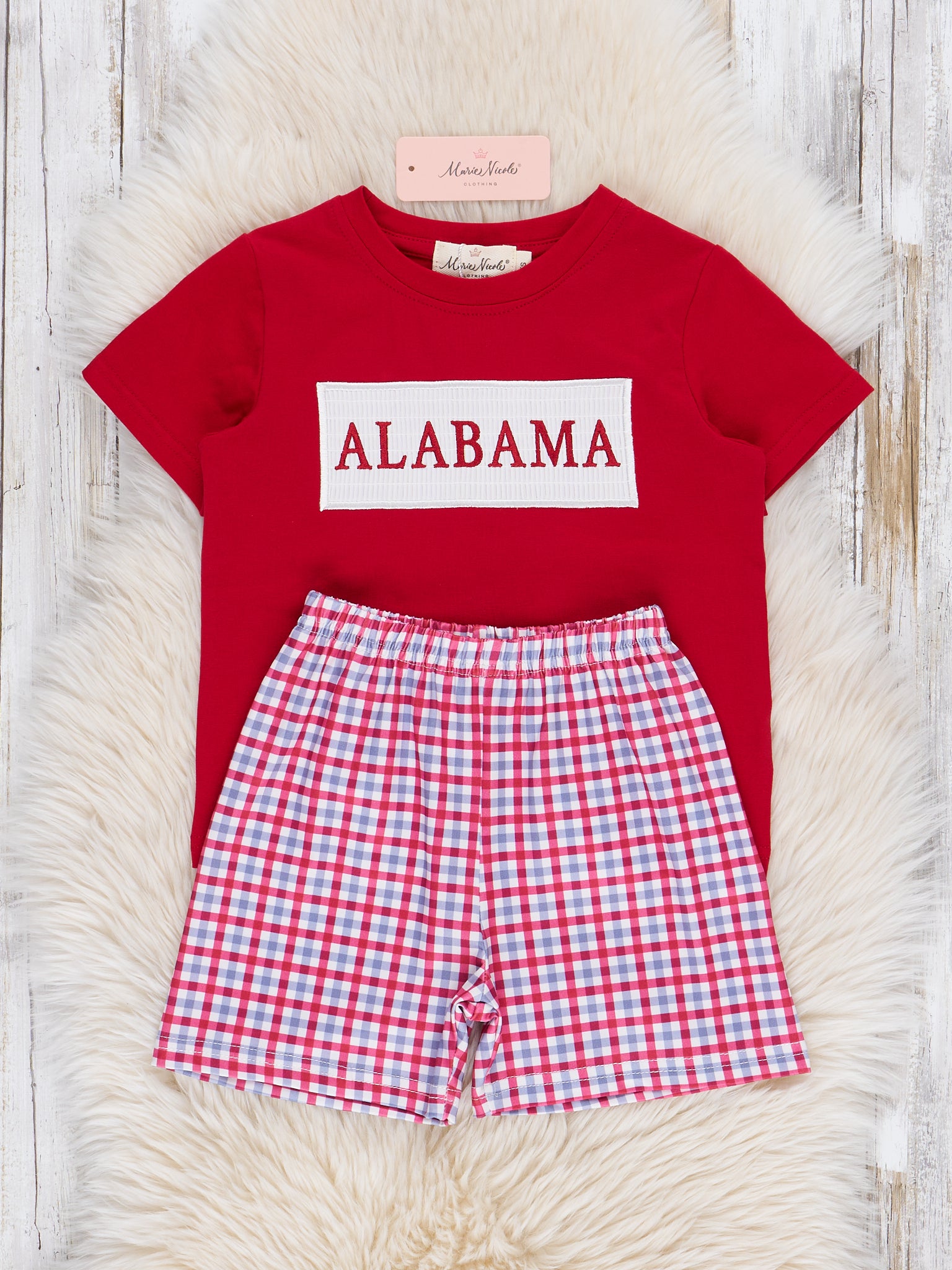 The Alabama Smocked Gingham Outfit is a sweet and spirited look that’s perfect for your little fan. This two-piece set from Marie Nicole Clothing features a bright red tee with a smocked “Alabama” applique, paired with classic red and grey gingham shorts. Designed with breathable fabric and a comfortable fit, it’s ideal for warm-weather outings, tailgates, or cheering on the state in style. Southern charm and team pride come together in this adorable game day favorite.