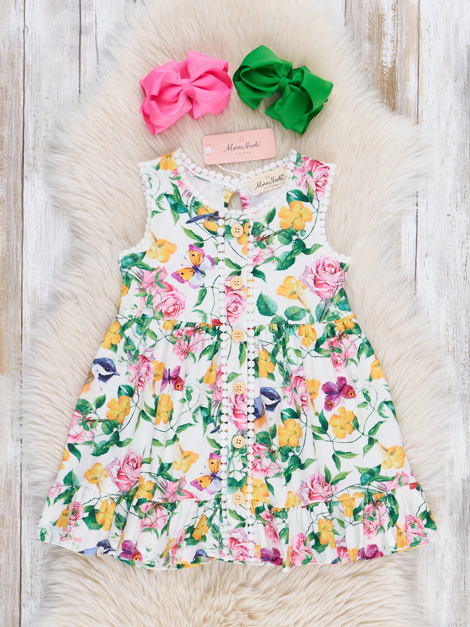Introducing our playful Button Front Pom Pom Dress in Butterfly Garden! Perfect for summer, this girls' dress from Marie Nicole Clothing features a white bodice with an allover garden print boasting butterflies & birds. The button front and fun pom pom trim adds charming detail, and it comes in more prints to choose from. Sleeveless for cool comfort.