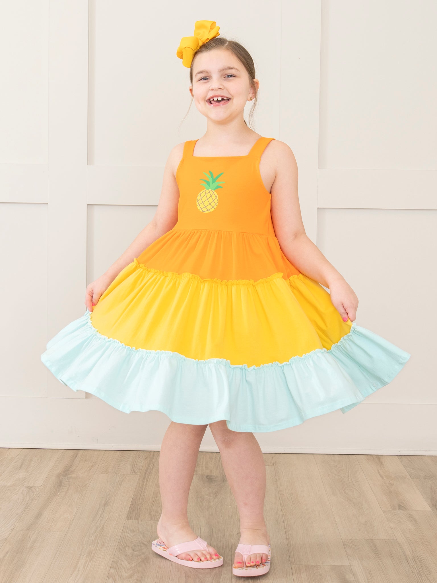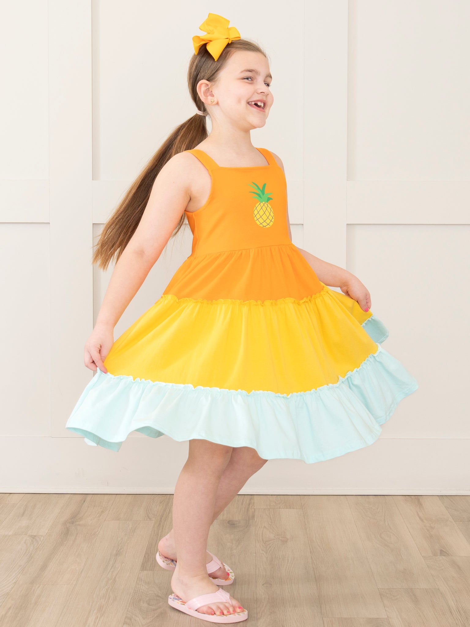 Get your girly girl ready for summer with this playful Tiered Colorblock Dress by Marie Nicole Clothing. The color block design in orange, yellow, and light blue screams sunshine and smiles, while the vinyl pineapple adds a touch of quirkiness. Perfect for any summer adventure!