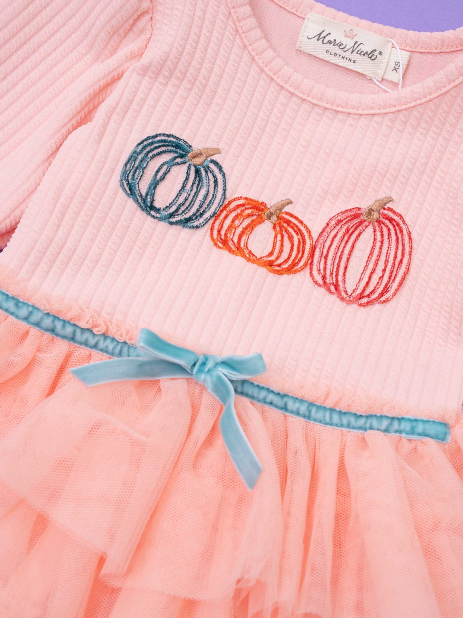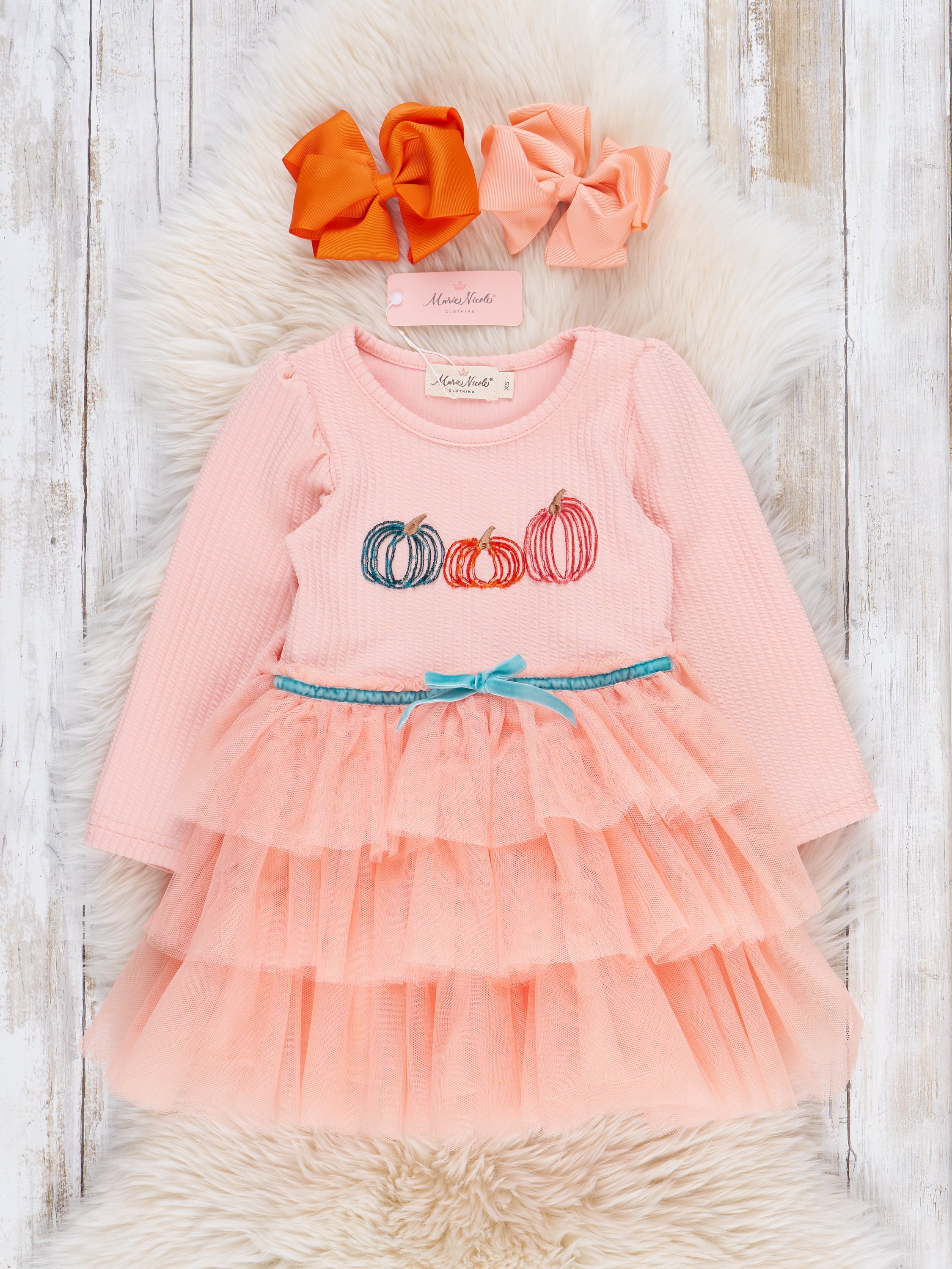 Add a pop of pumpkin spice to their wardrobe with our Peach Pumpkins Tiered Tulle Dress! Designed specially for MNC, this girls dress features a peach tiered tulle skirt and beautifully embroidered pumpkins, making it the perfect choice for all the fall festivities. Playful and stylish, they'll be the talk of the pumpkin patch.