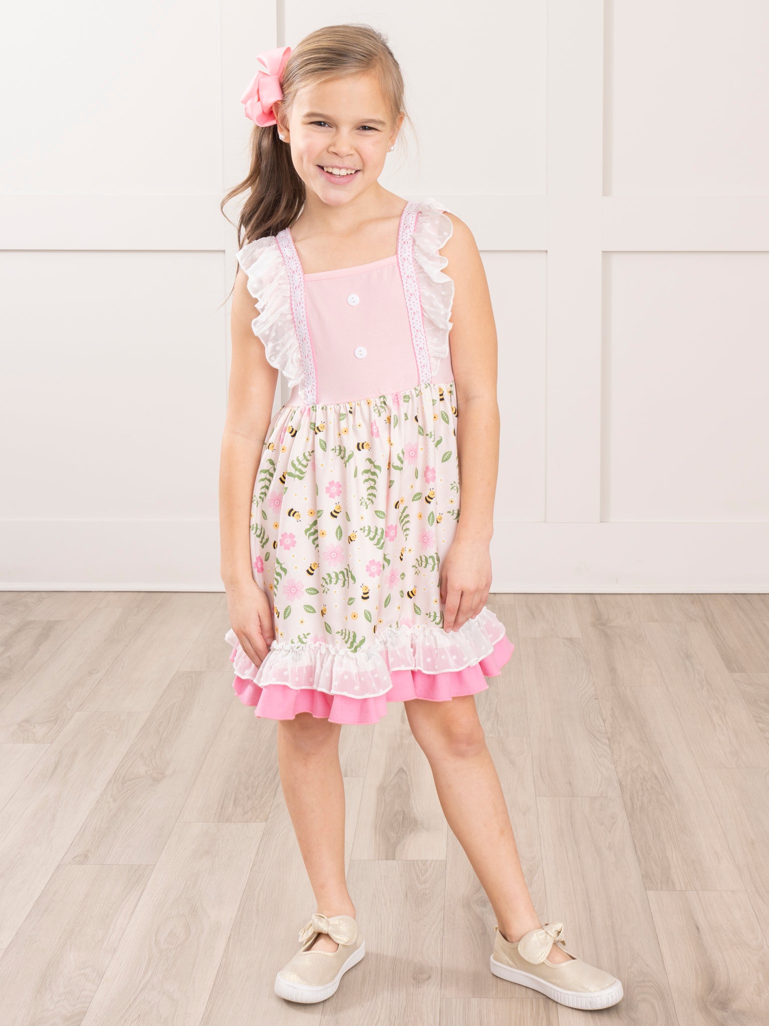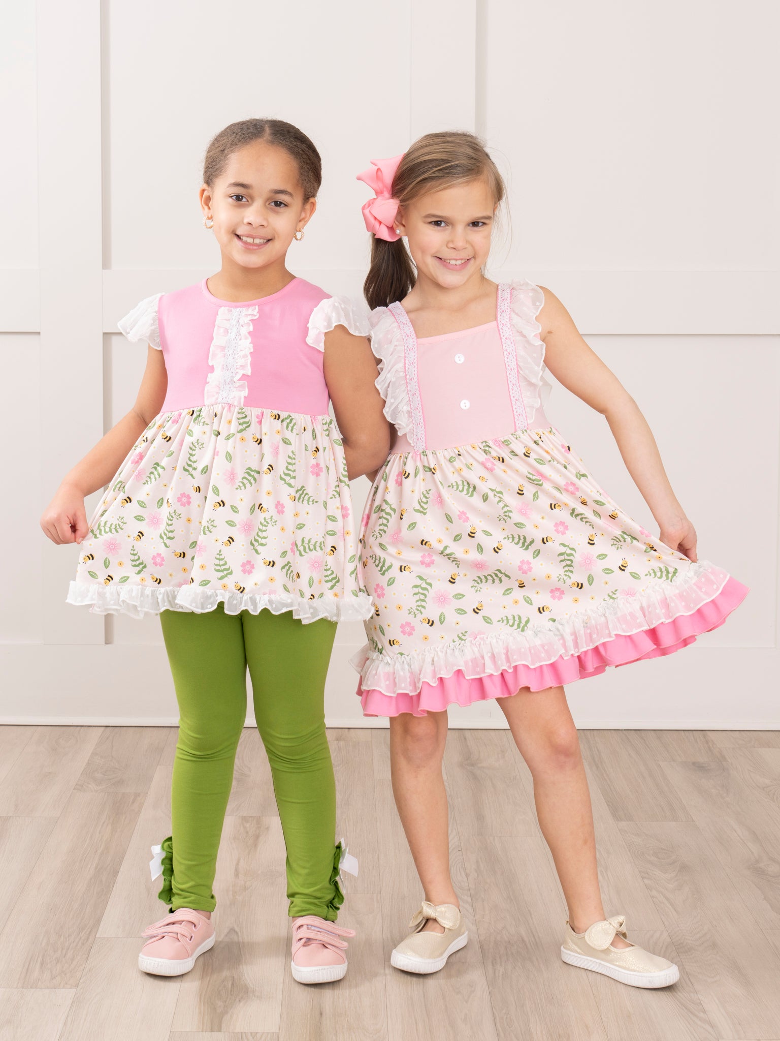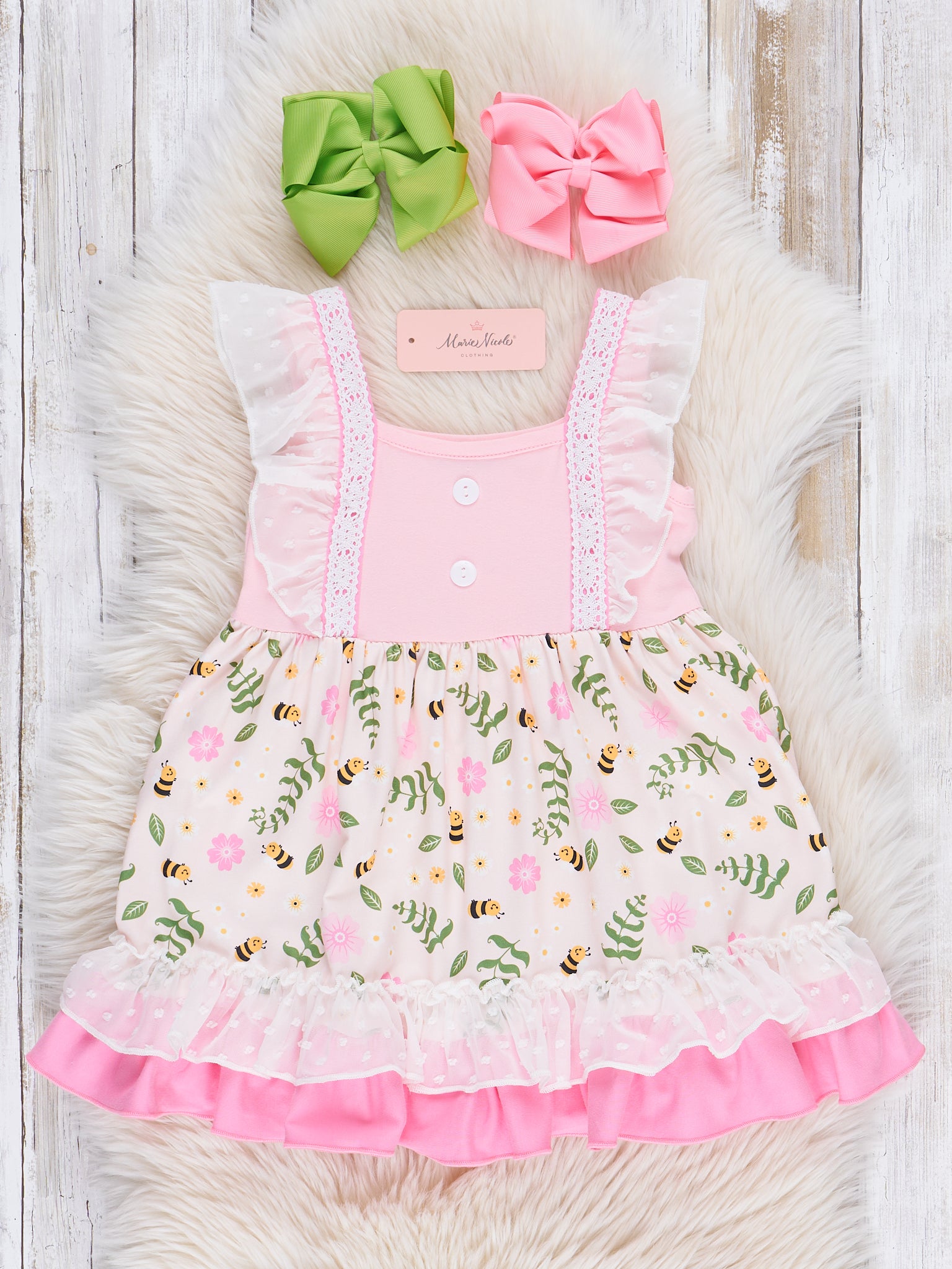 Get ready to frolic in style with our Pink Garden Frolic Ruffle Dress! This playful dress by Marie Nicole Clothing features trendy ruffle trim and a tiered lace and pink ruffle hem. The adorable bees and flower garden print adds a touch of whimsy. Don't forget to complete the look with our matching sister set options.