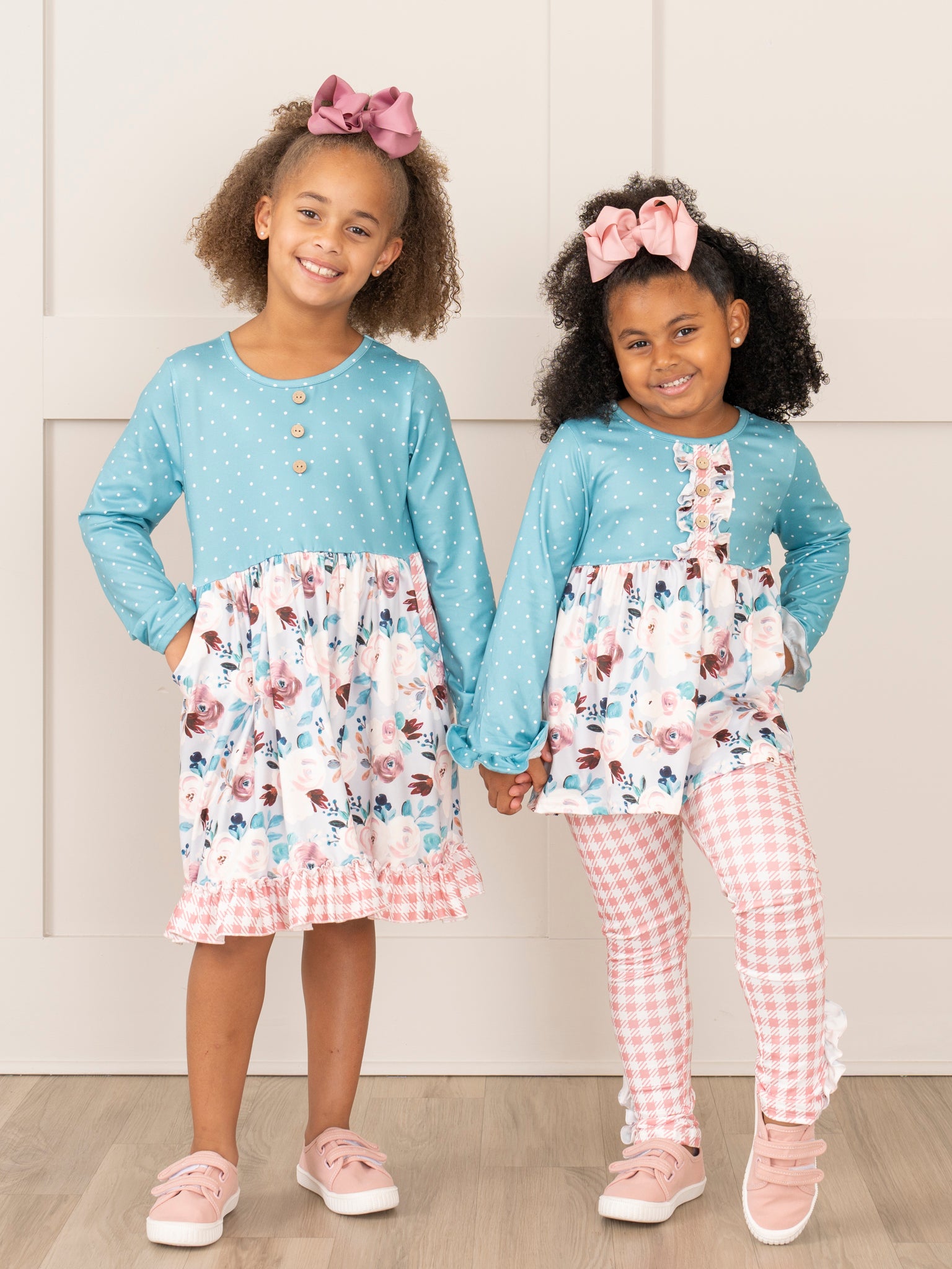 Let your little one bloom in our Turquoise Blossoms Ruffle Dress! This girls' outfit, featuring a teal dots, floral print, and pink gingham ruffle detail, is perfect for your bohemian babe. Get the matching sister set for extra cuteness because twinning is winning!