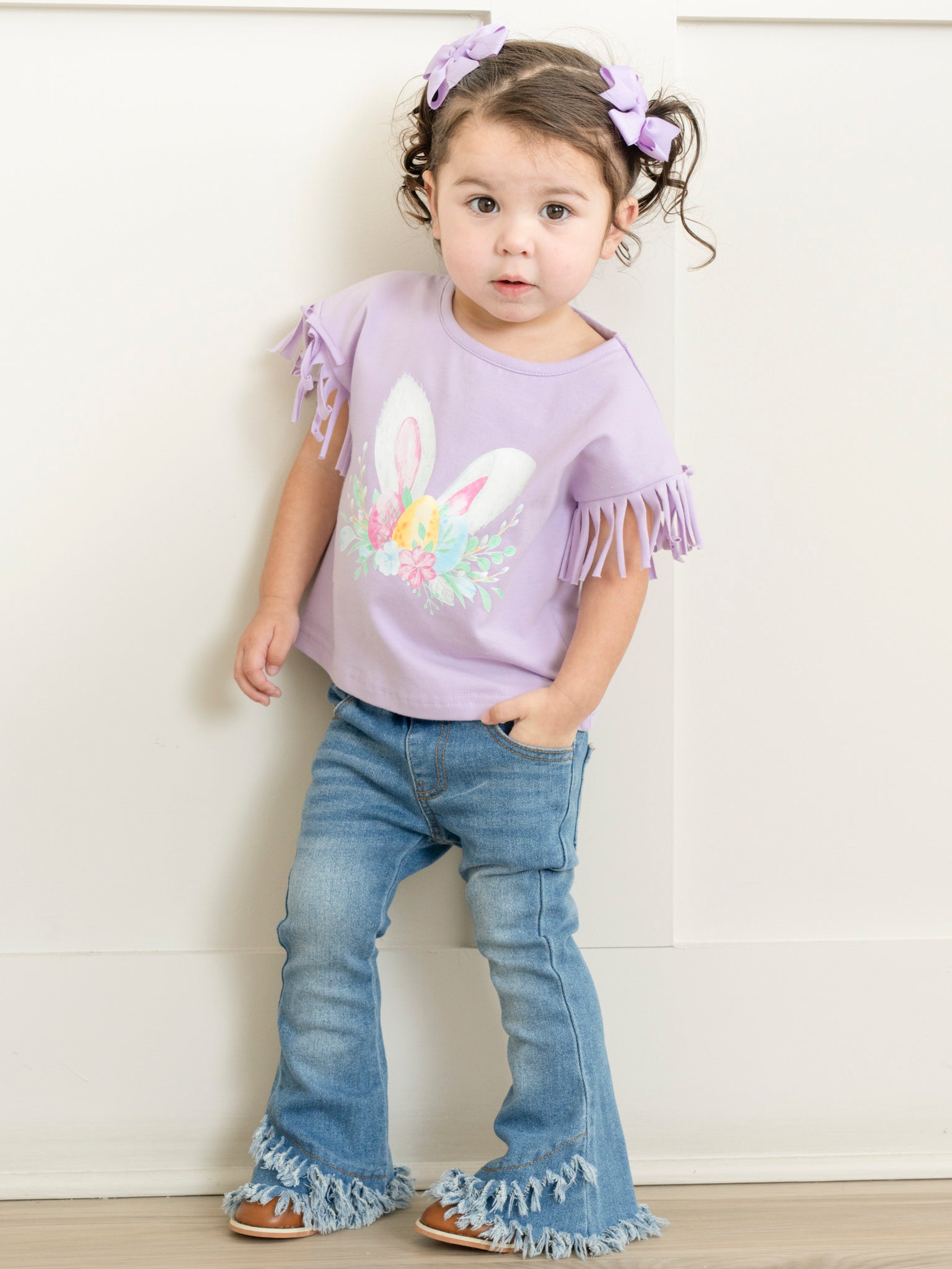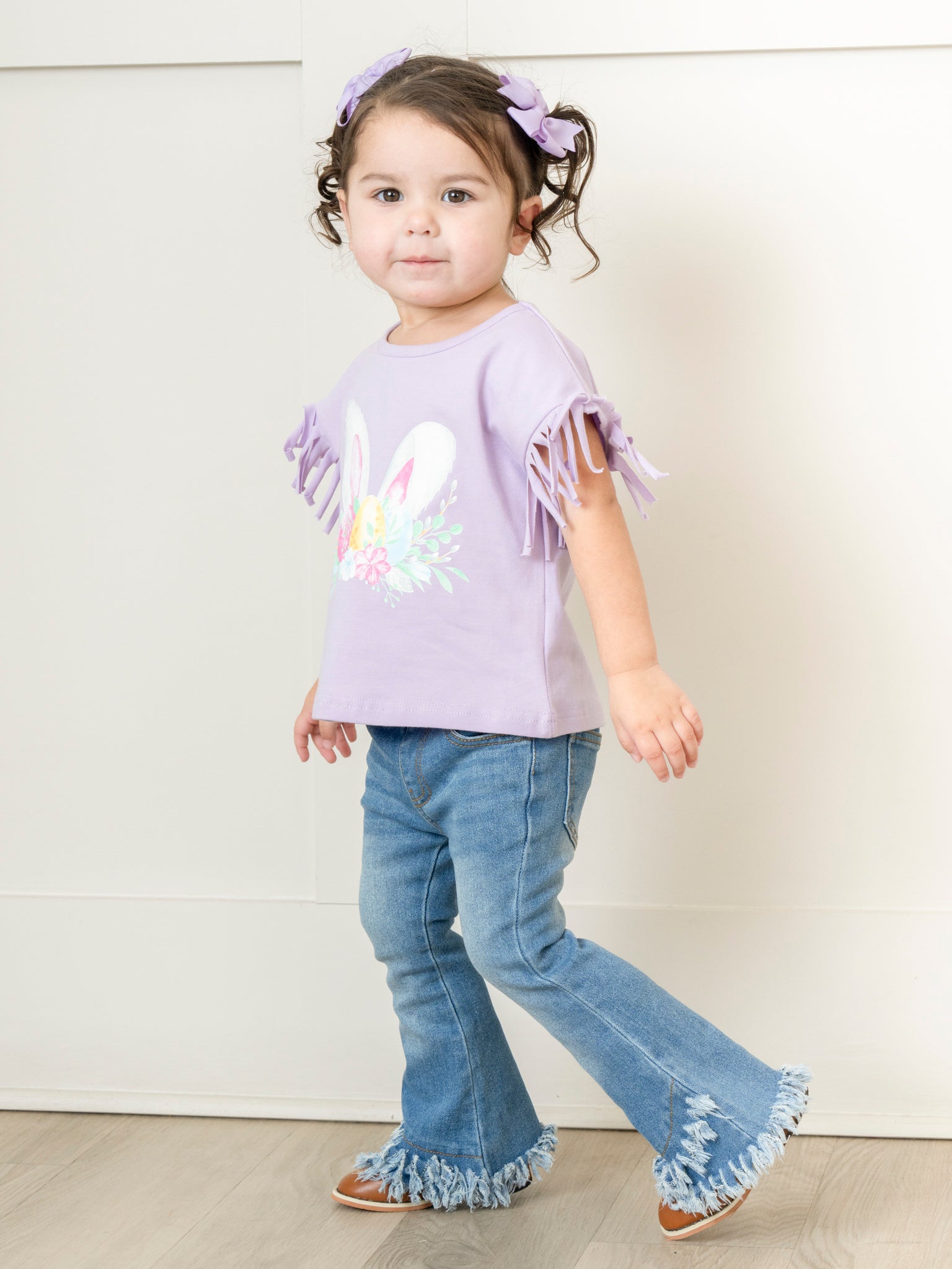 Transform your little one's garden playtime into a funky adventure with our Purple Fringe Bunny Garden Outfit! Featuring a vibrant purple fringe-sleeved t-shirt and trendy fringe flare denim, this outfit will have your child hopping with joy and style all day long. Shop the matching dress by Marie Nicole Clothing.