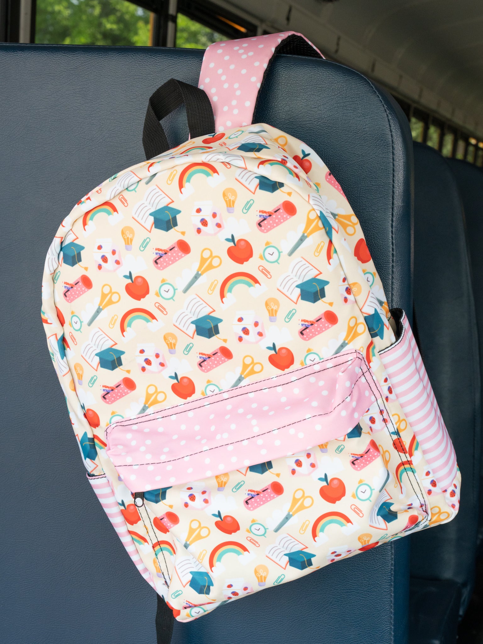 Bring schoolwork with you in style with this amazing School Supplies Backpack! Designed for kids, it features a vibrant school supplies print, front zipper compartment, side pockets for extra goodies, and adjustable straps for comfortable carrying. Say goodbye to boring bags and get ready to hit the books with this super stylish and functional accessory!