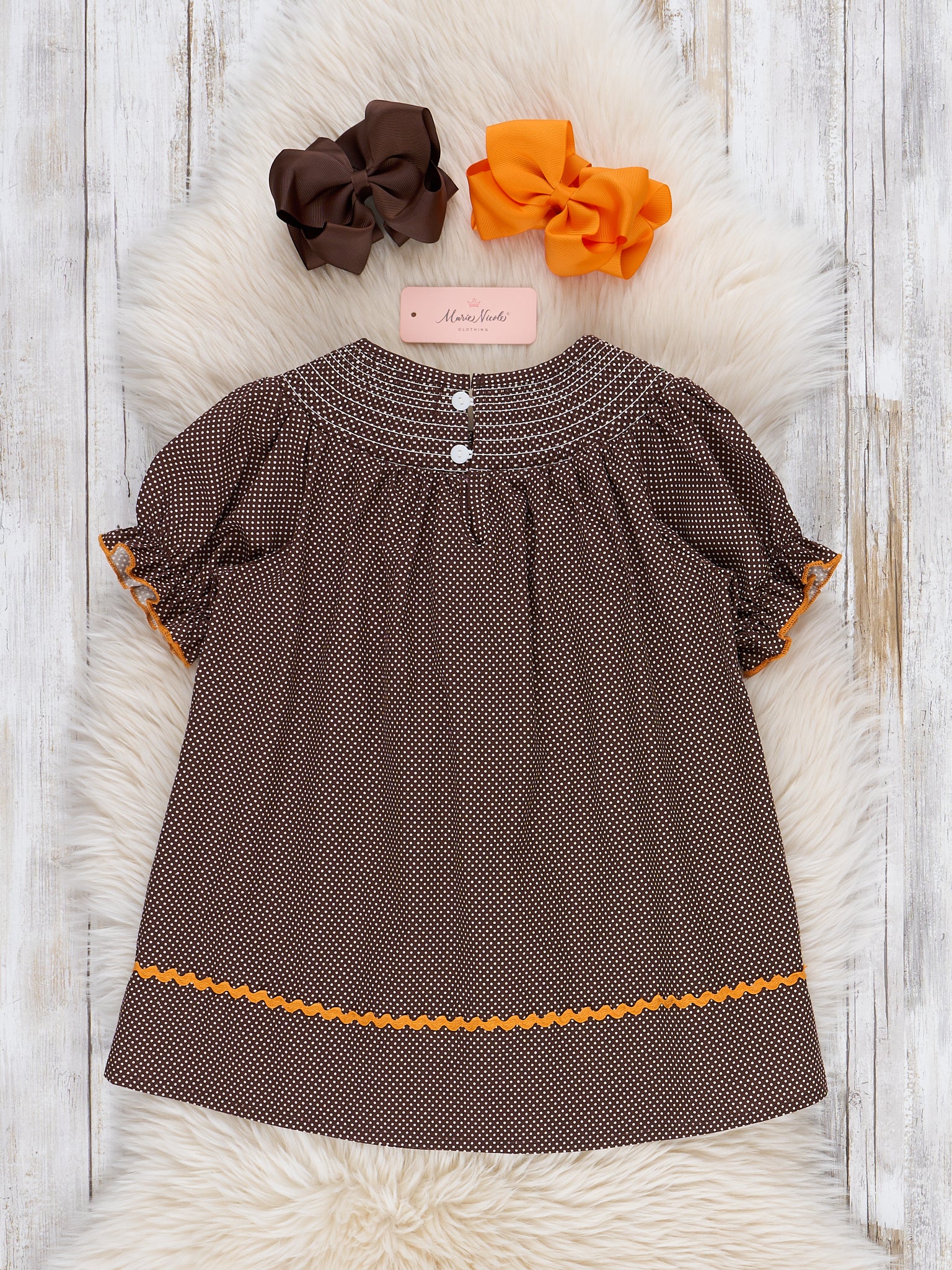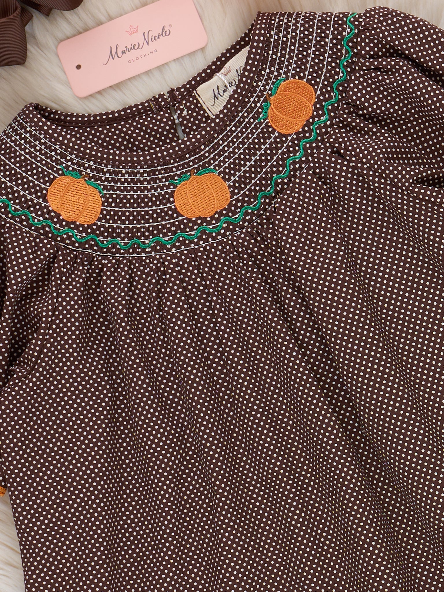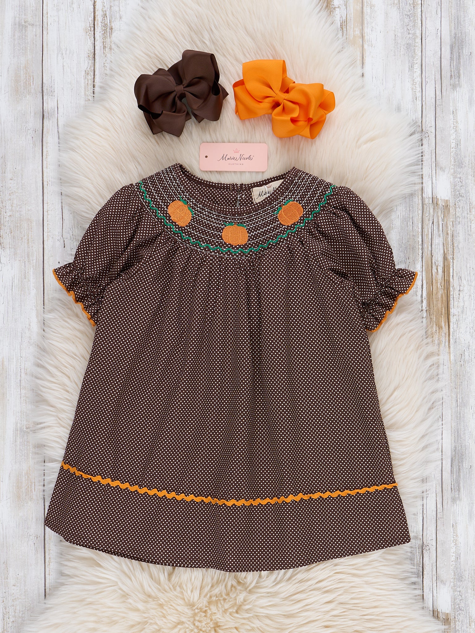 Go big or GOURD home with the Brown Smocked Pumpkin Dress! This cute and classic dress by Marie Nicole Clothing features smocking, embroidered pumpkins, polka dots, & orange trim. Crafted with soft, cotton fabric, your little girl will be so comfy and cute wearing this in the fall!
