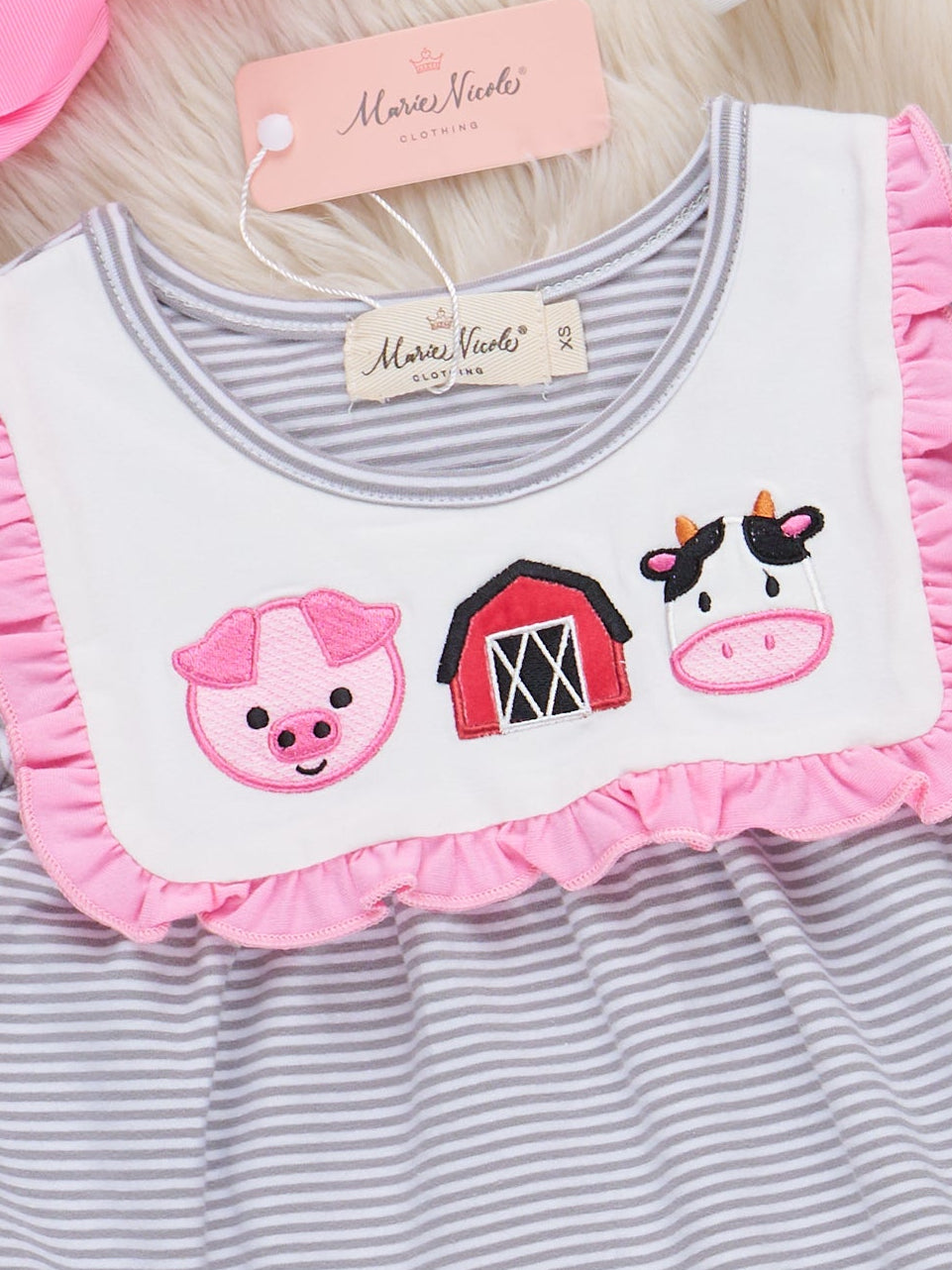 The Country Critters Embroidered Dress by Marie Nicole features a long-sleeved silhouette with gently gathered cuffs, a ruffled bib, and playful embroidered animal friends across the front. Its soft details and sweet design bring a touch of country charm to everyday adventures.