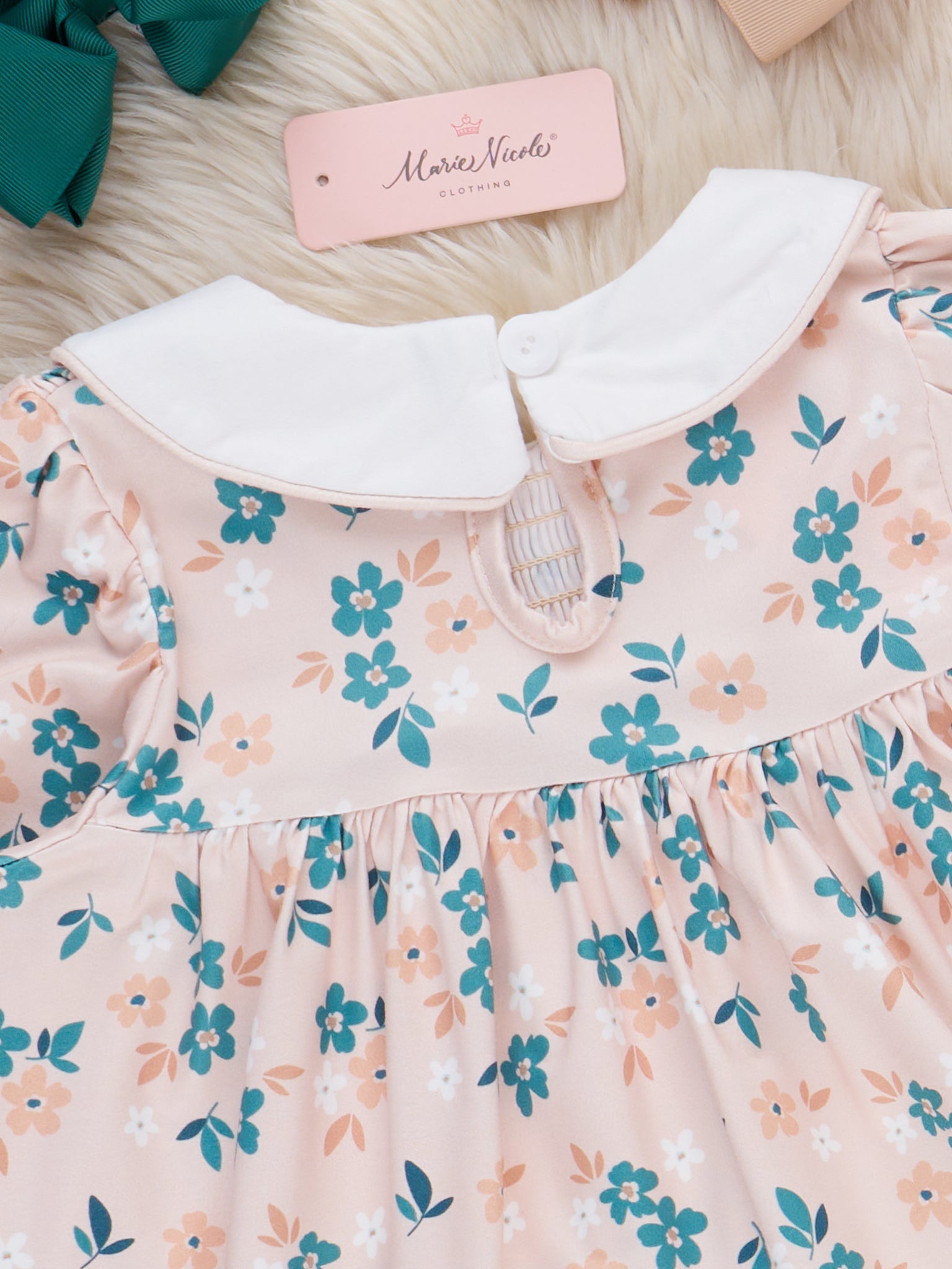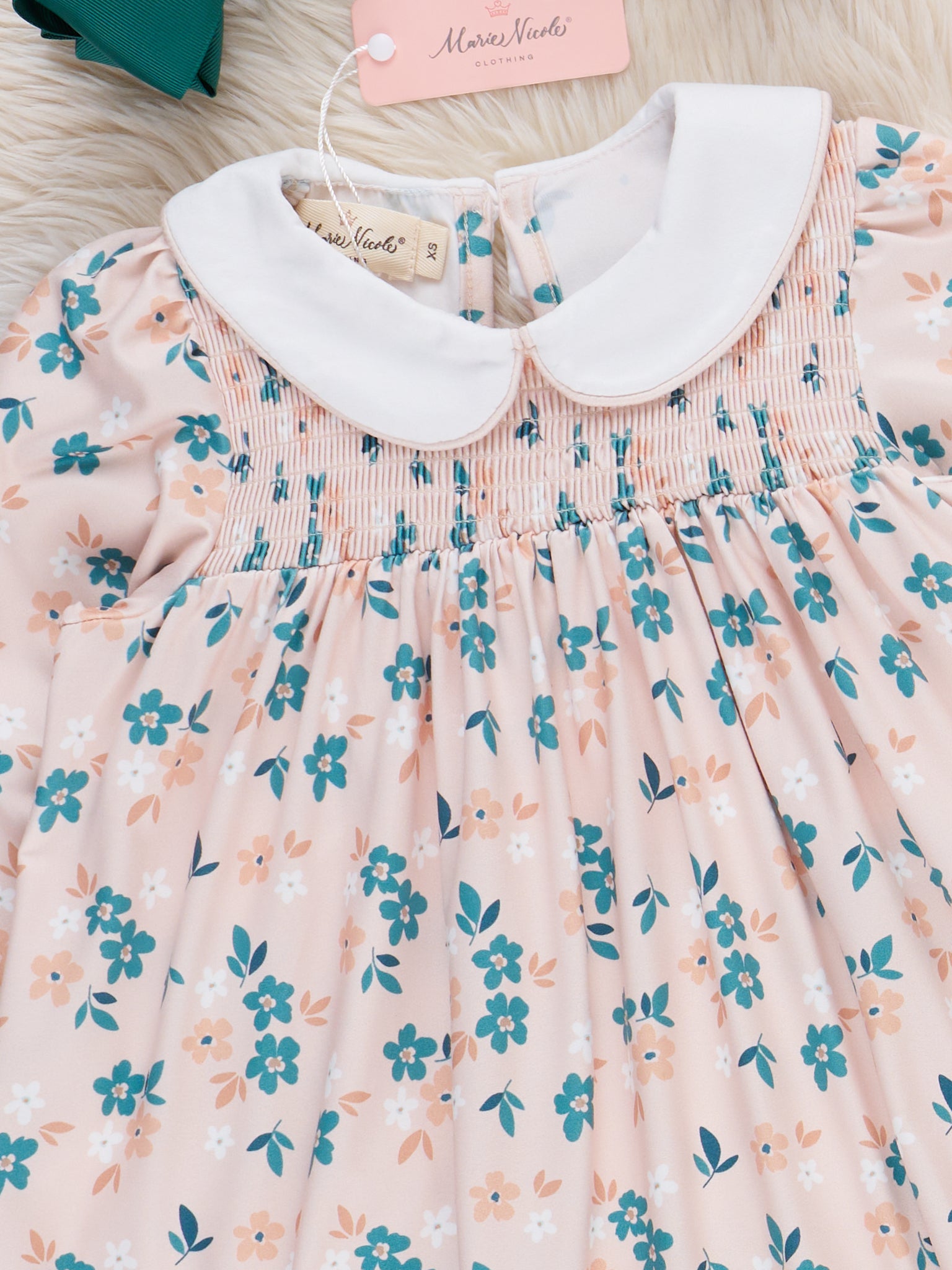 The Vintage Petals Smocked Dress by Marie Nicole features a dainty floral print on a classic long-sleeve, gathered silhouette. It is adorned with a crisp Peter Pan collar and gently puffed sleeves, combining timeless charm with everyday comfort.