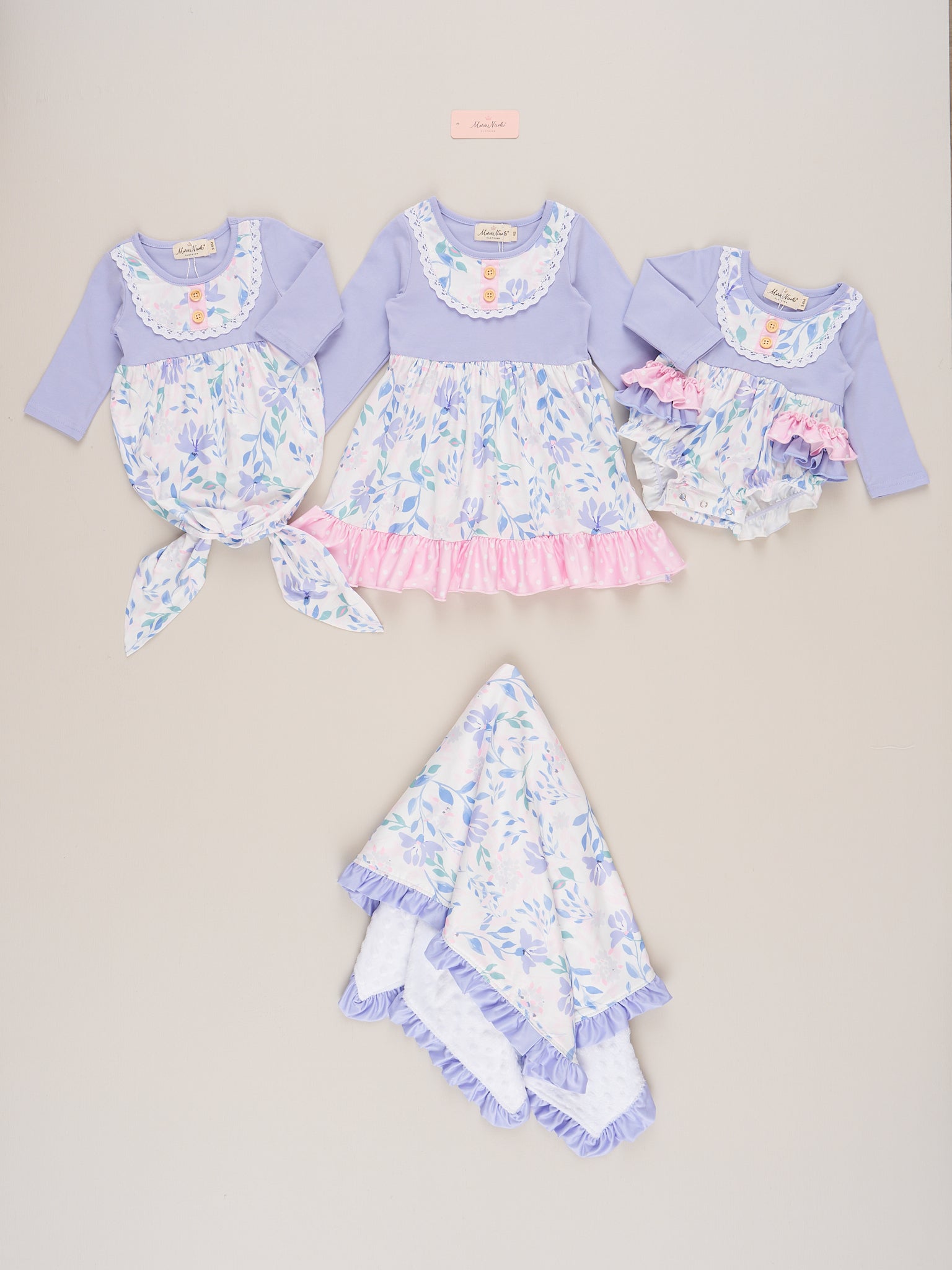 Wrap your little dreamer in gentle comfort with our Lavender Fields Knot Gown! This cozy newborn gown from Marie Nicole Clothing features a soothing lavender floral print and an easy adjustable knot bottom for quick diaper changes. The perfect blend of style and snuggly softness for your baby’s early days.