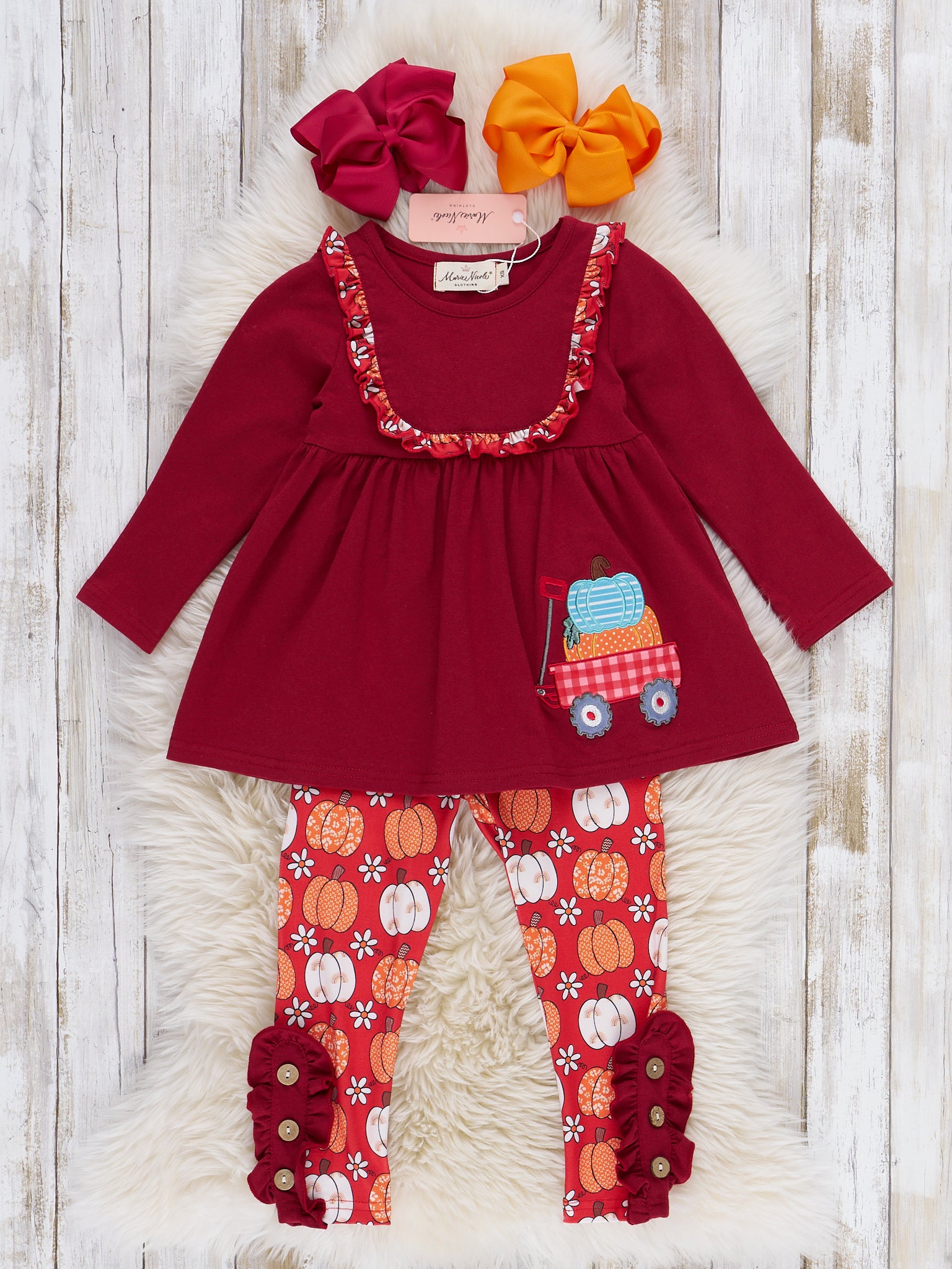 Maroon Pumpkin Wagon Embroidered Ruffle Outfit