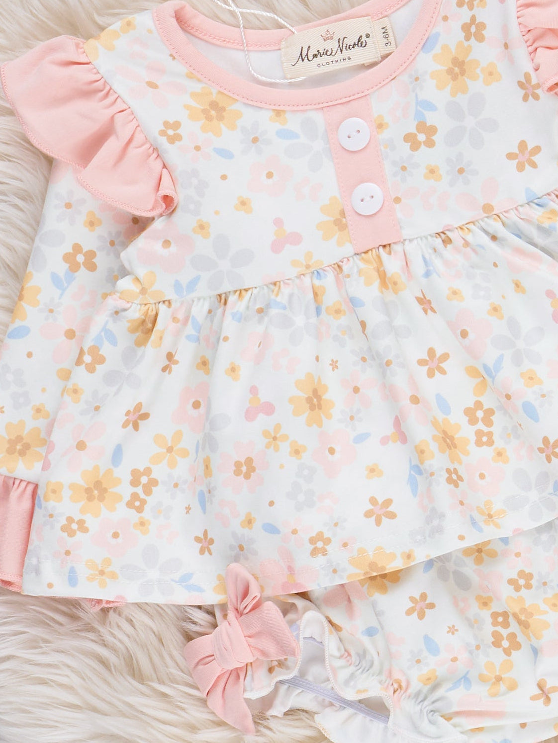The Blossom Bow Bloomers Outfit by Marie Nicole features a floral long-sleeve top with ruffled details along the front and cuffs, paired with matching bloomers adorned with sweet bow accents. This charming set offers soft gathers and playful frills, making it ideal for special occasions and everyday adventures.