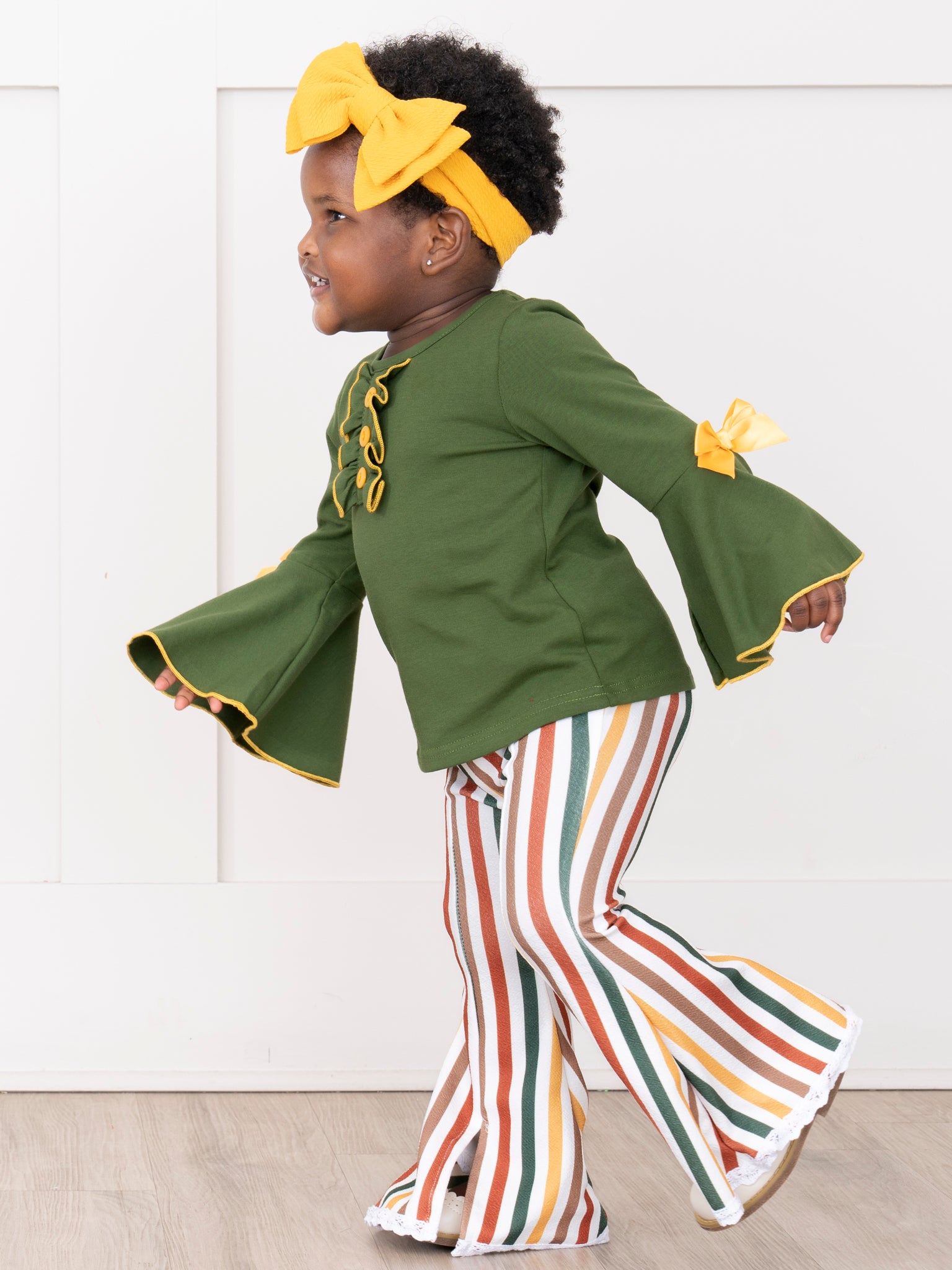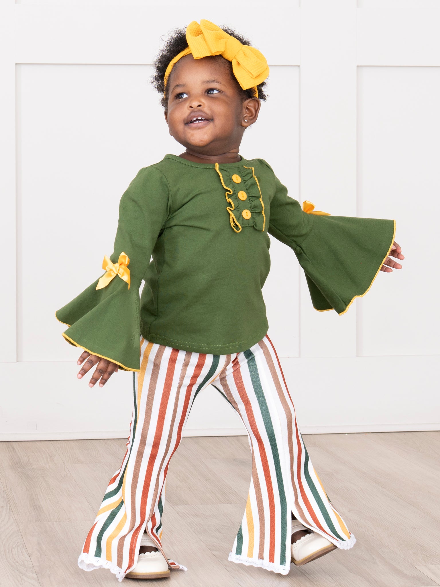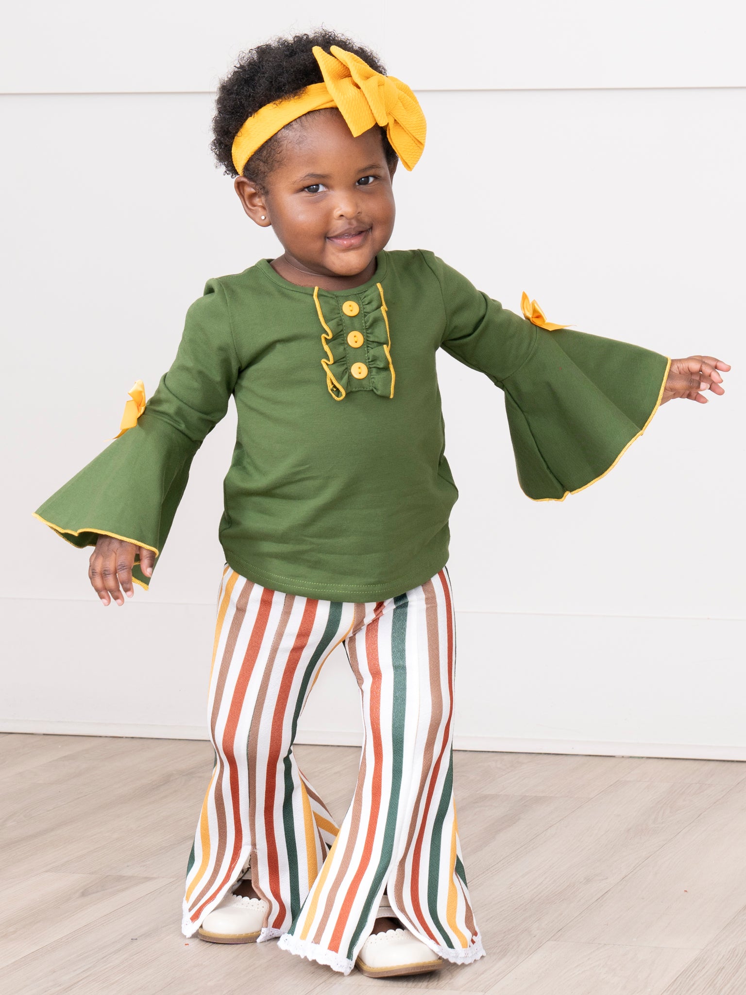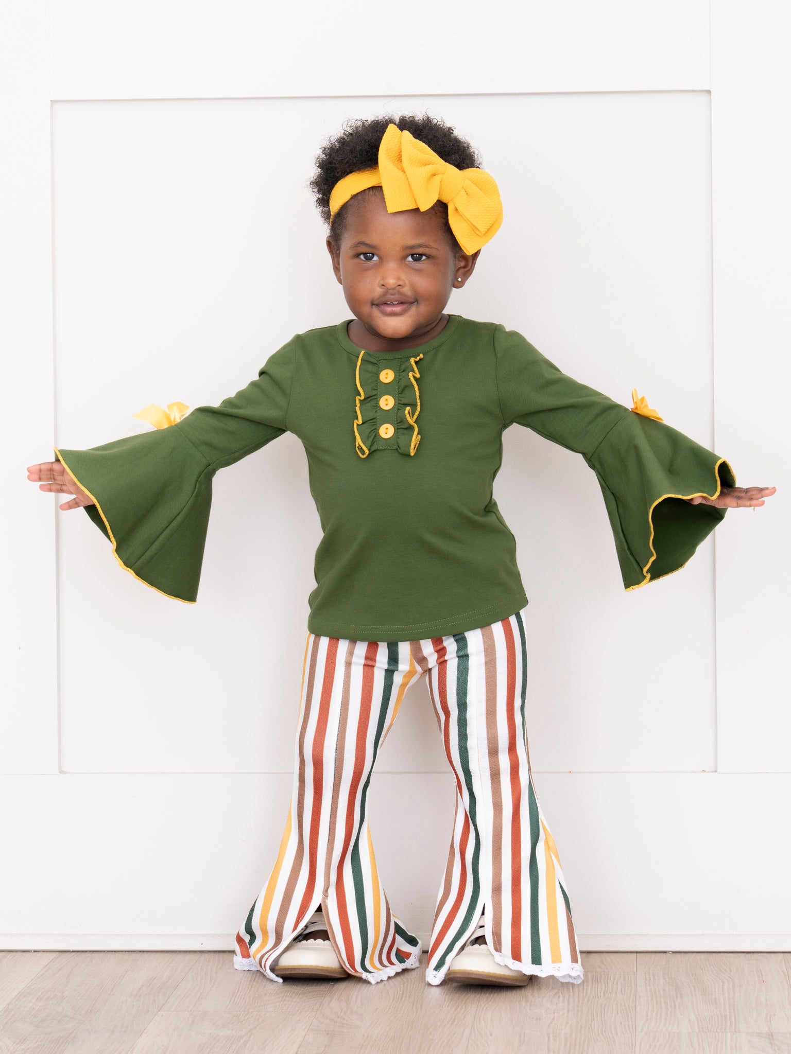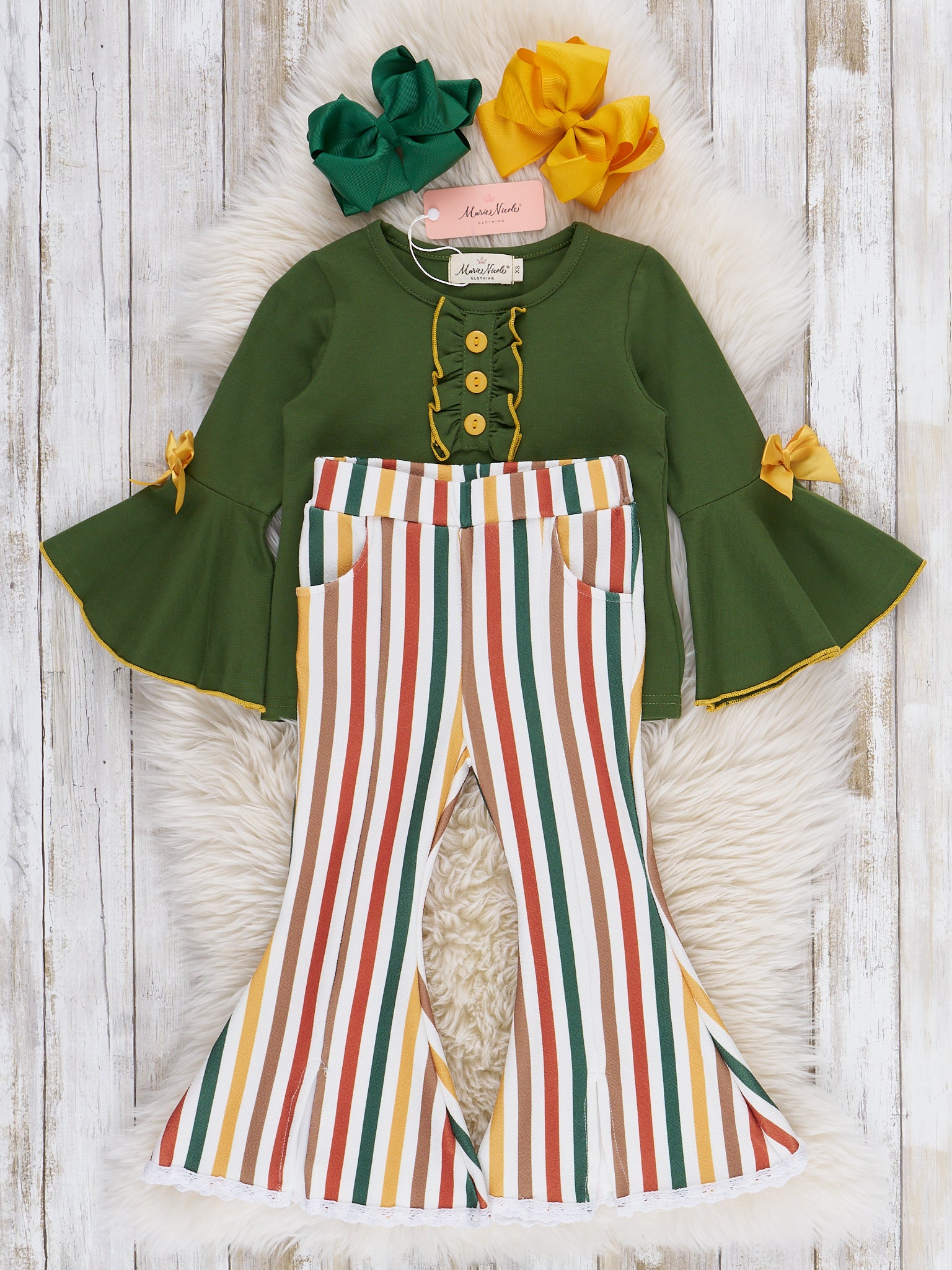 The Cozy Harvest Stripe Bell Bottom Outfit by Marie Nicole Clothing features a stylish green top with dramatic bell sleeves and playful bow accents, paired with striped bell bottom pants inspired by autumn hues. Designed for comfort and standout seasonal flair, this outfit is perfect for fall celebrations, family photos, or day-to-day harvest fun.