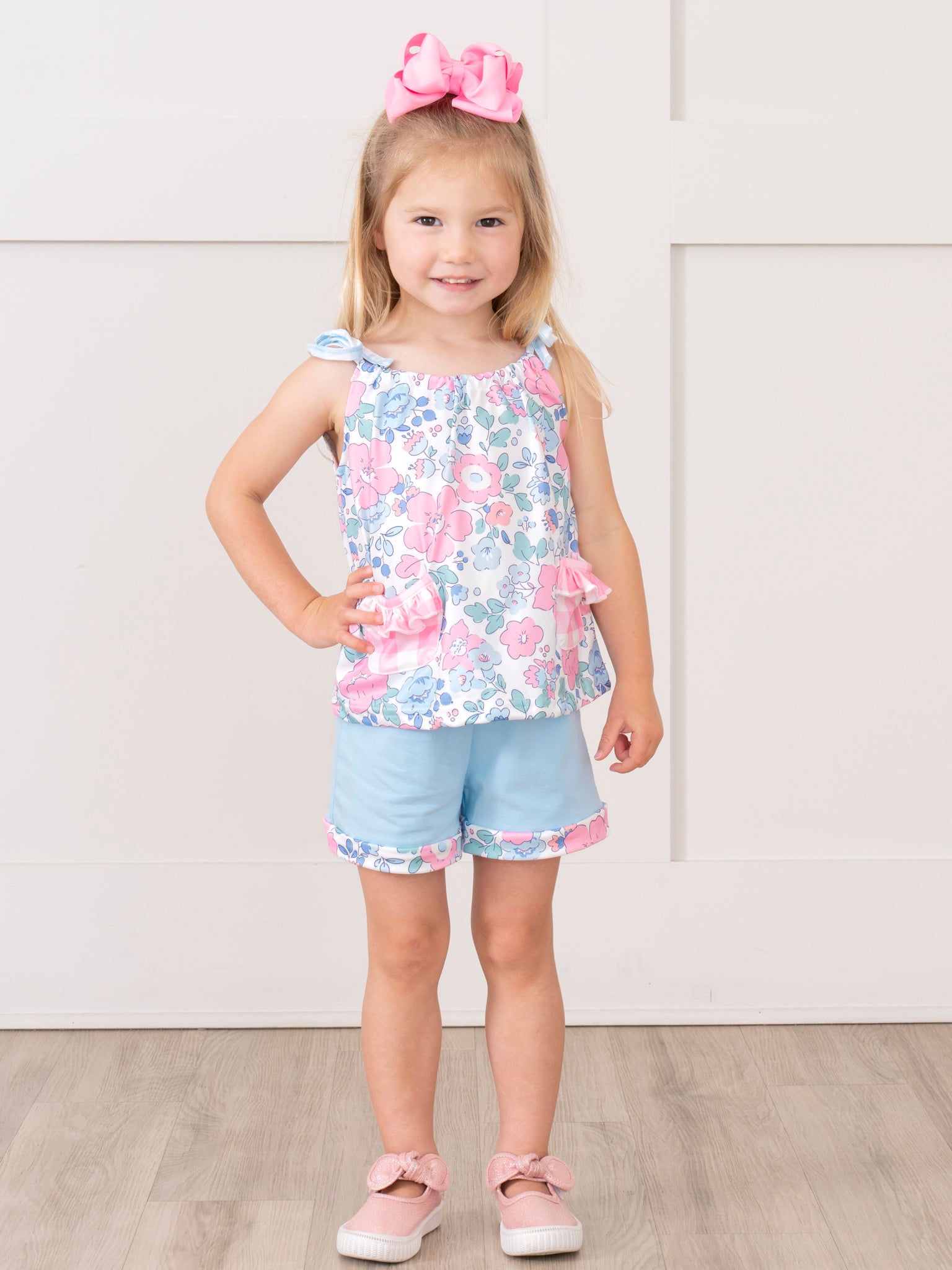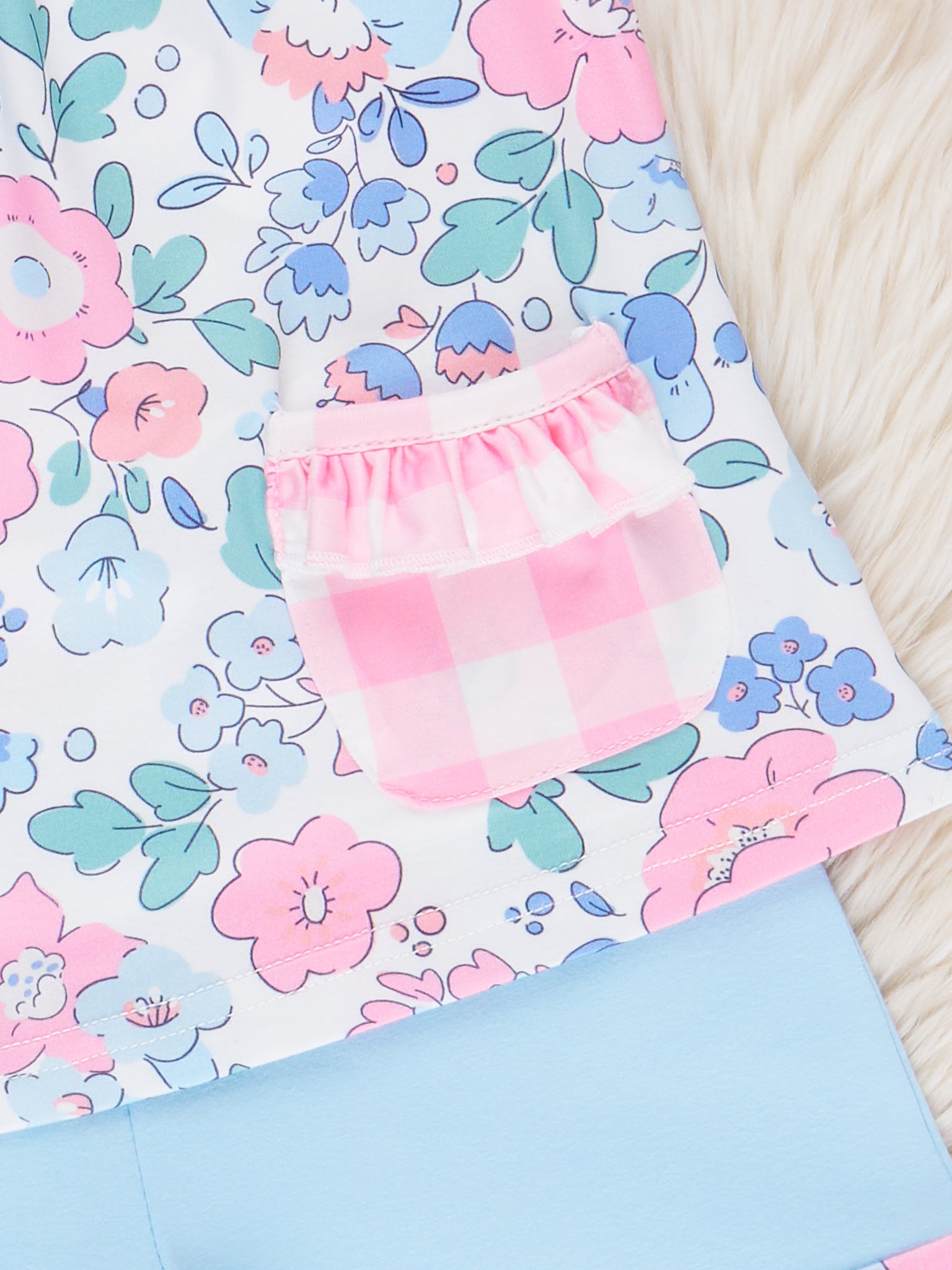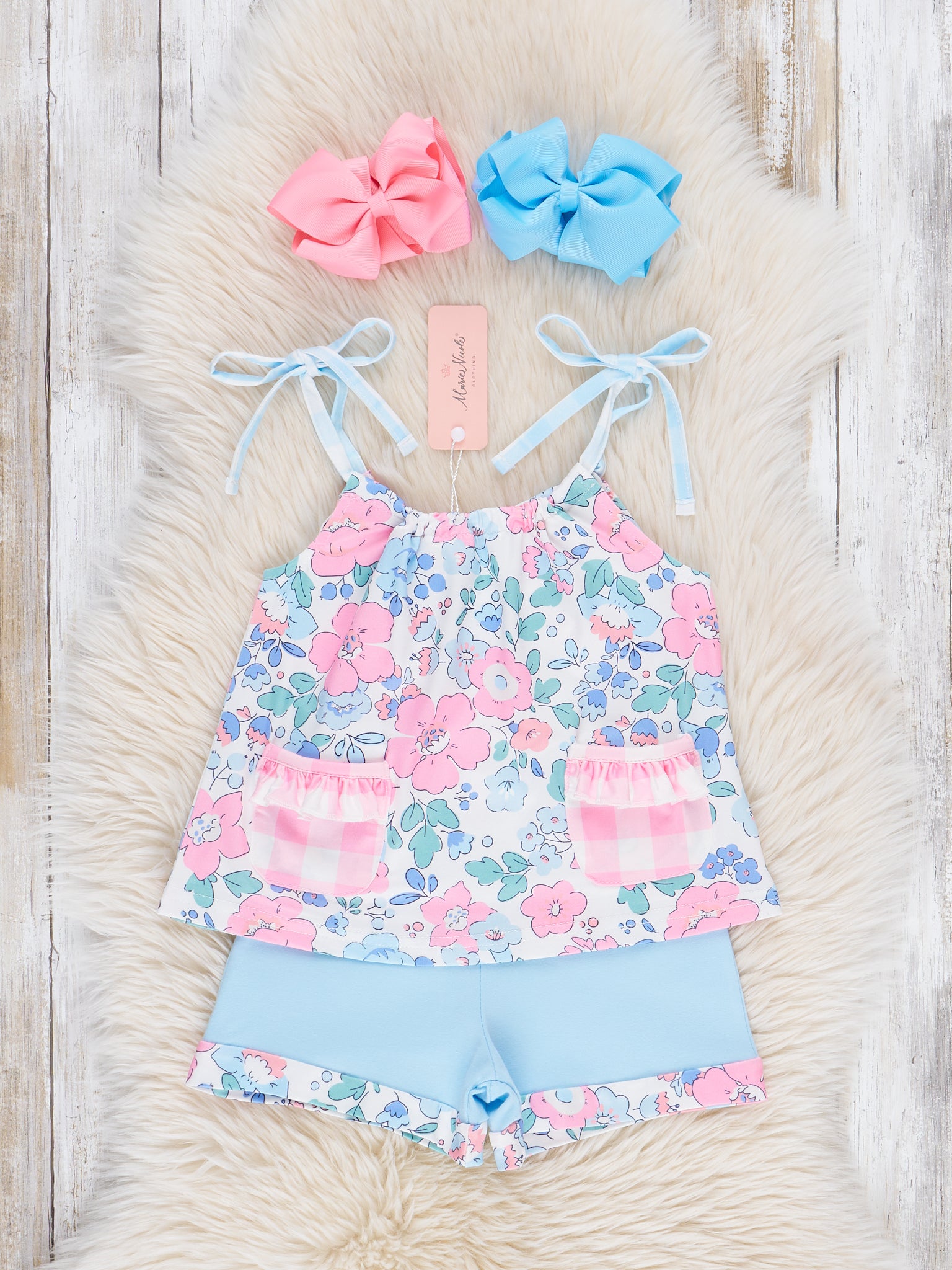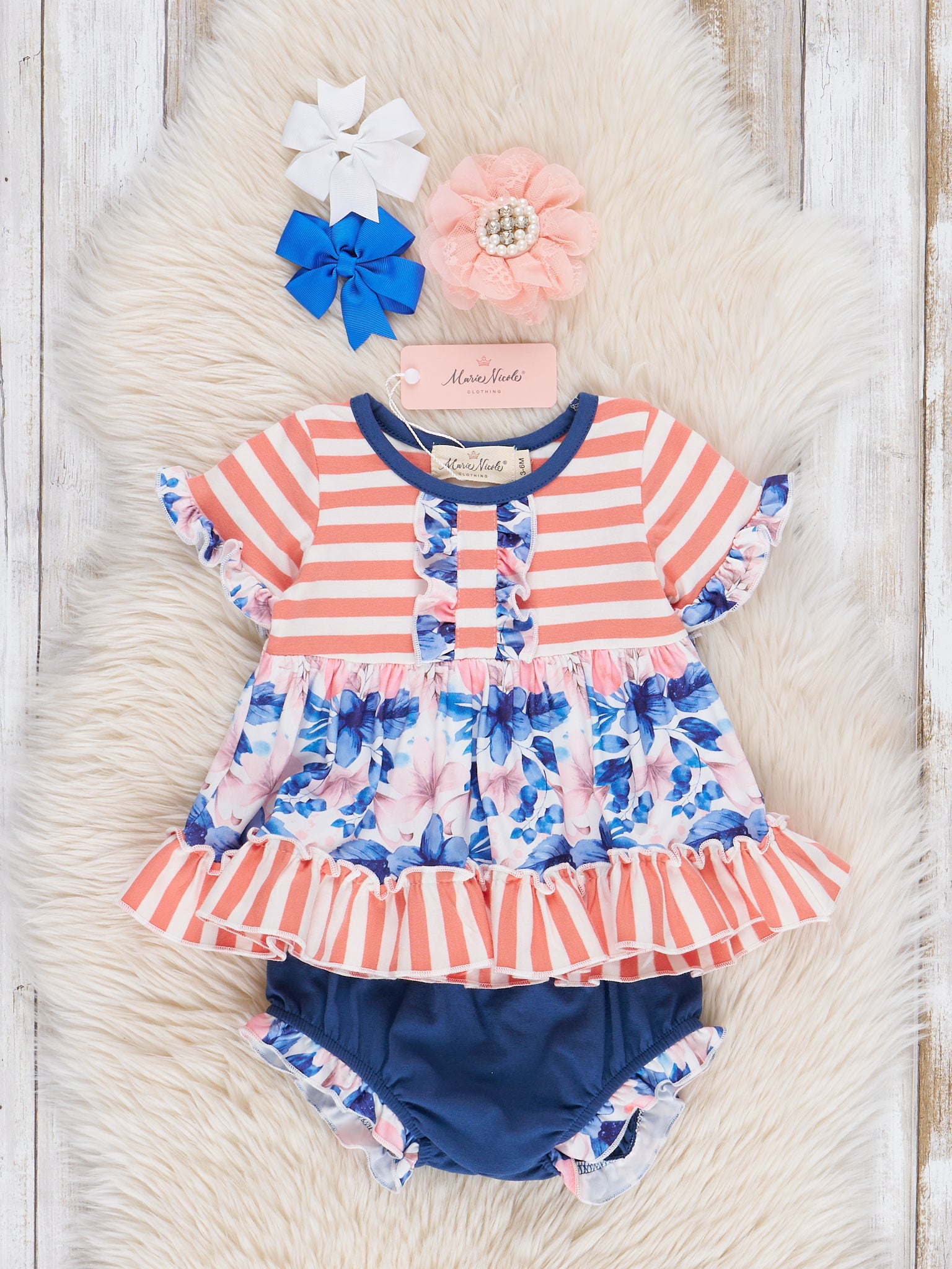 Ringer Striped Florals Bloomers Outfit - Blue & Coral