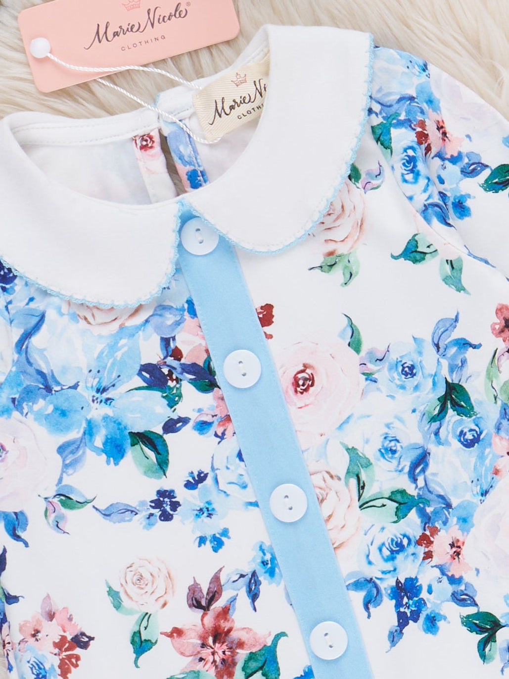 The Garden Breeze Footed Sleeper Pajamas by Marie Nicole Clothing feature a soft floral design with a delicate collar, cozy footed bottoms, and gentle fabric for restful sleep. These pajamas are designed to provide all-night comfort and easy changing, making them perfect for everyday wear or special occasions in a nature-inspired style.