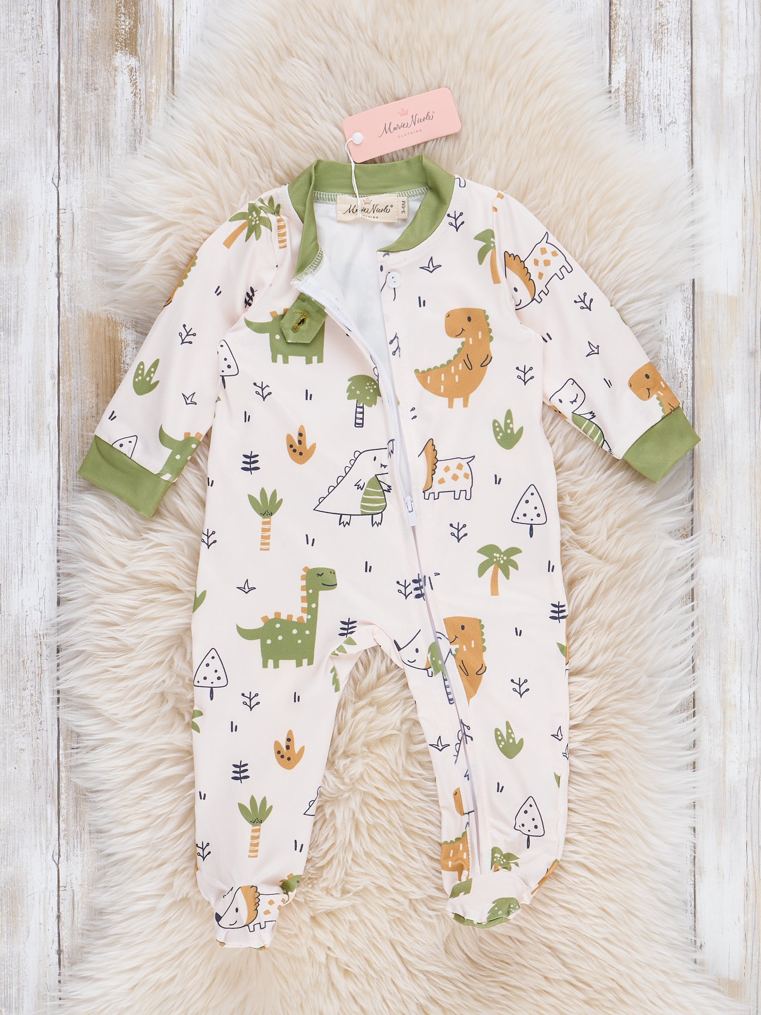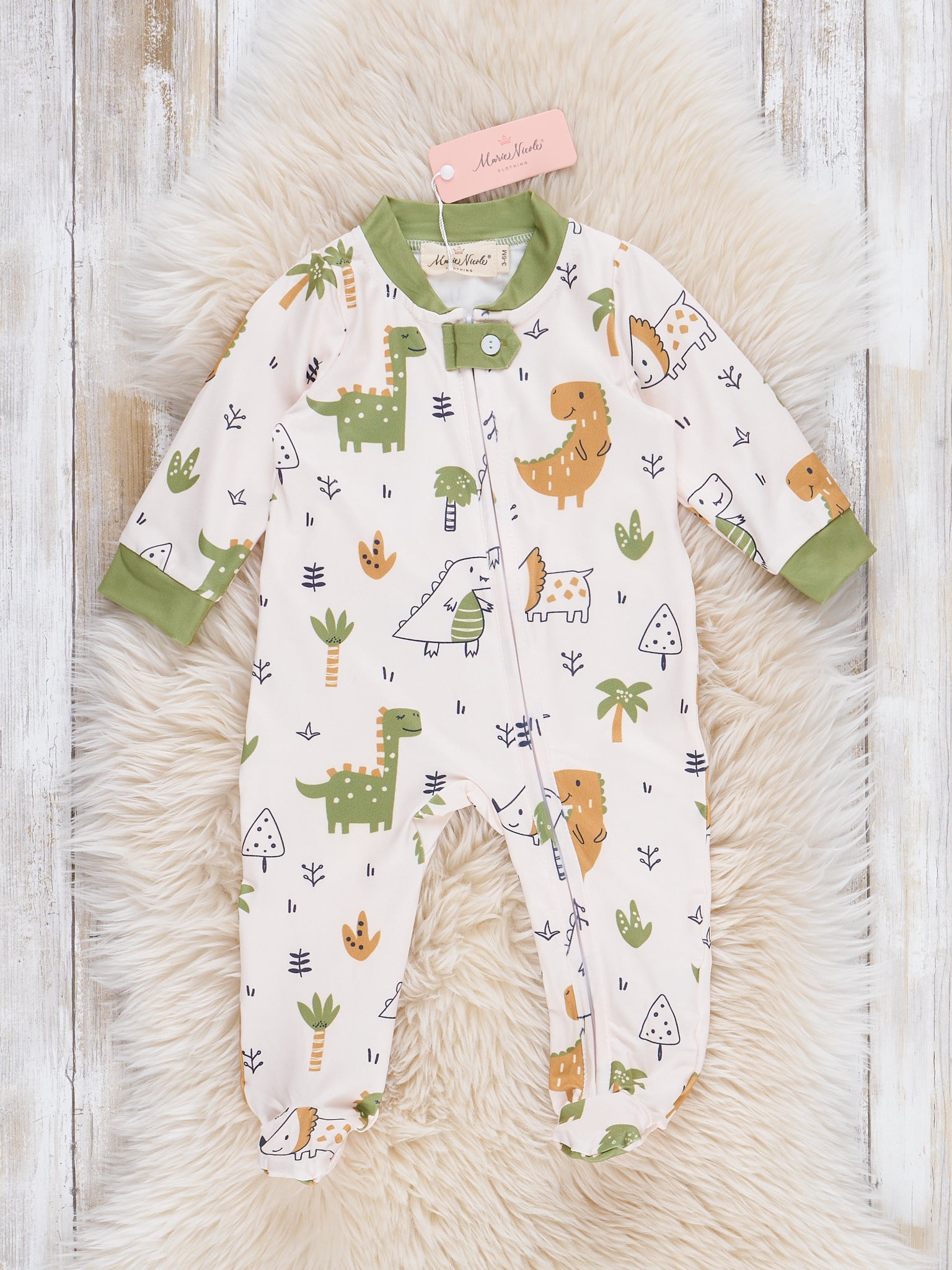 The Jurassic Jammies Footed Sleeper Pajamas by Marie Nicole Clothing feature a lively dinosaur print with gentle green accents and cozy footed bottoms. Made from super-soft, breathable fabric, these zipper pajamas combine prehistoric fun with comfort for restful sleep and playful mornings.