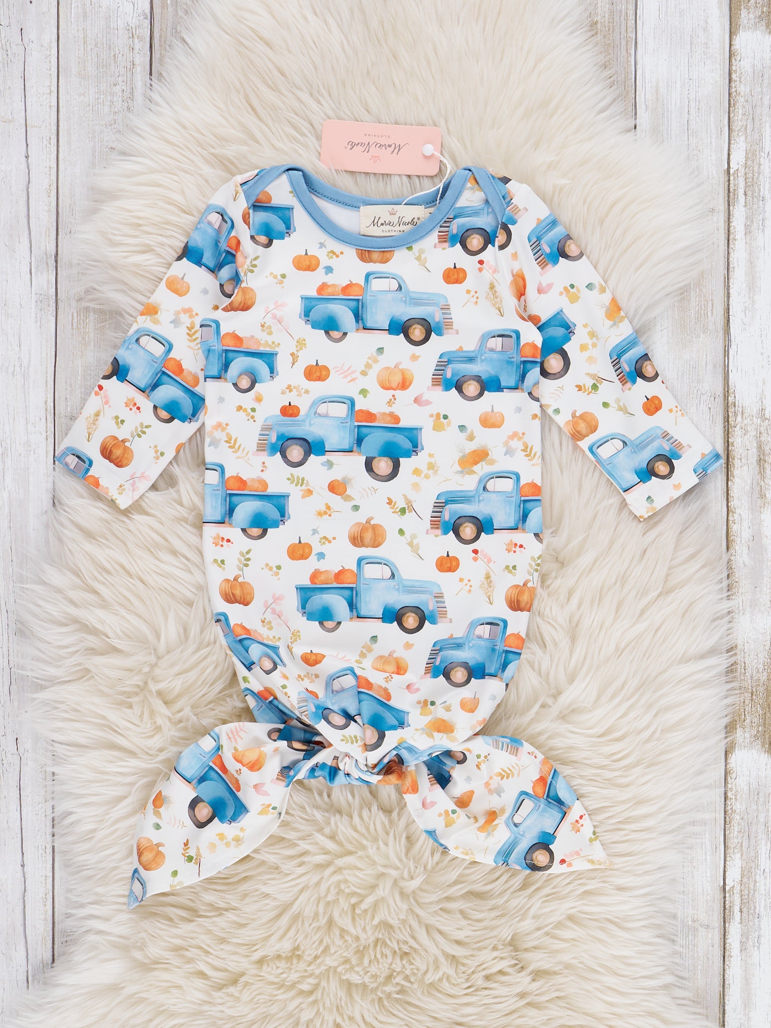 The Rustic Blue Pumpkin Trucks Knot Gown is fall spirit on wheels! The fun fabric on this Marie Nicole Clothing one-piece is perfect for your adventurous little boy, with a convenient-to-use knot bottom. Made with soft, comfy materials, he can sleep well this season!
