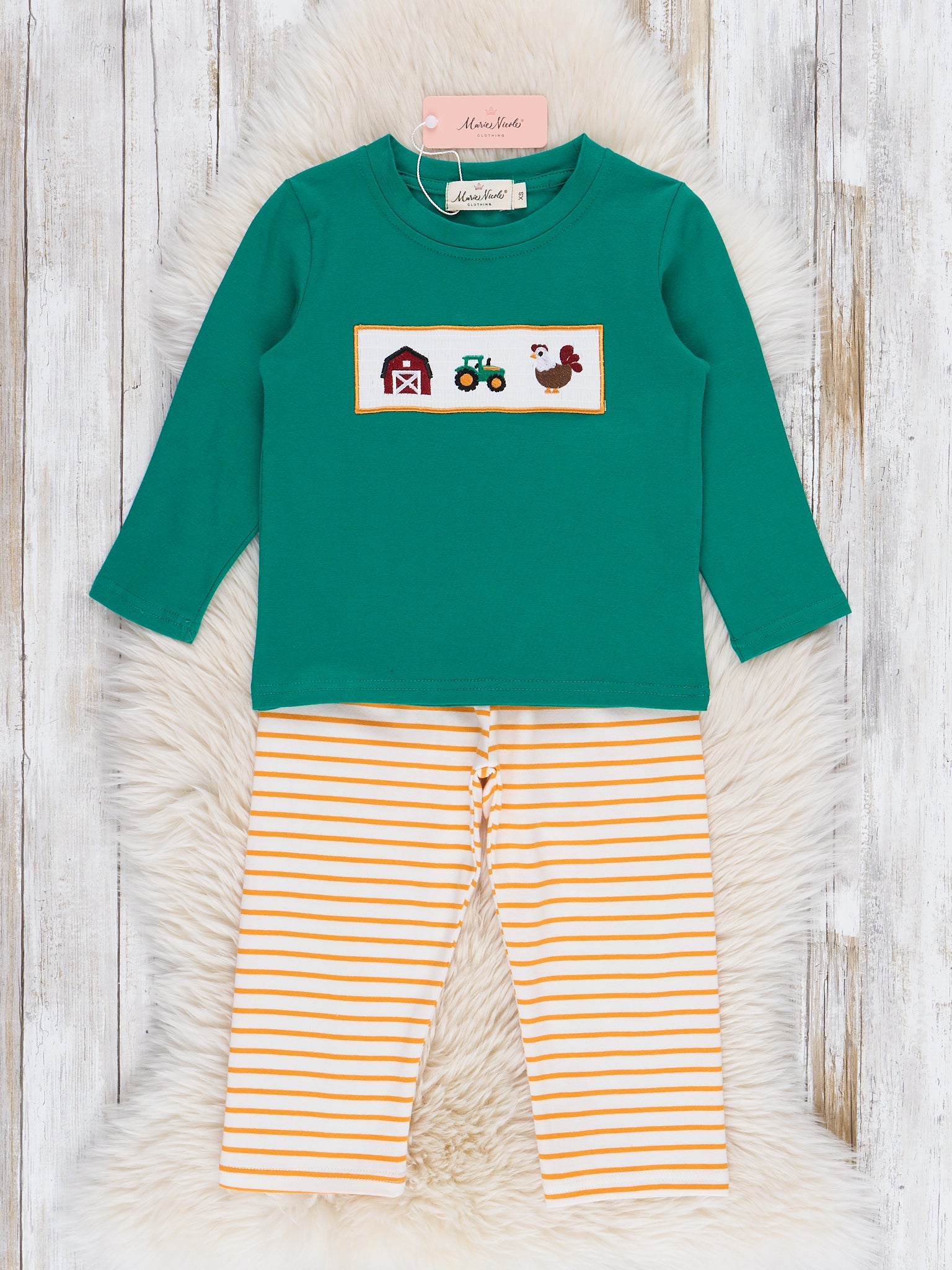 The Down on the Farm Smocked Striped Outfit is a classic and charming pick for your little farmhand. Featuring soft yellow stripes and detailed farm embroidery across the chest, this outfit from Marie Nicole Clothing combines timeless style with playful personality. It’s perfect for sunny days, farm fun, and picture-perfect moments.